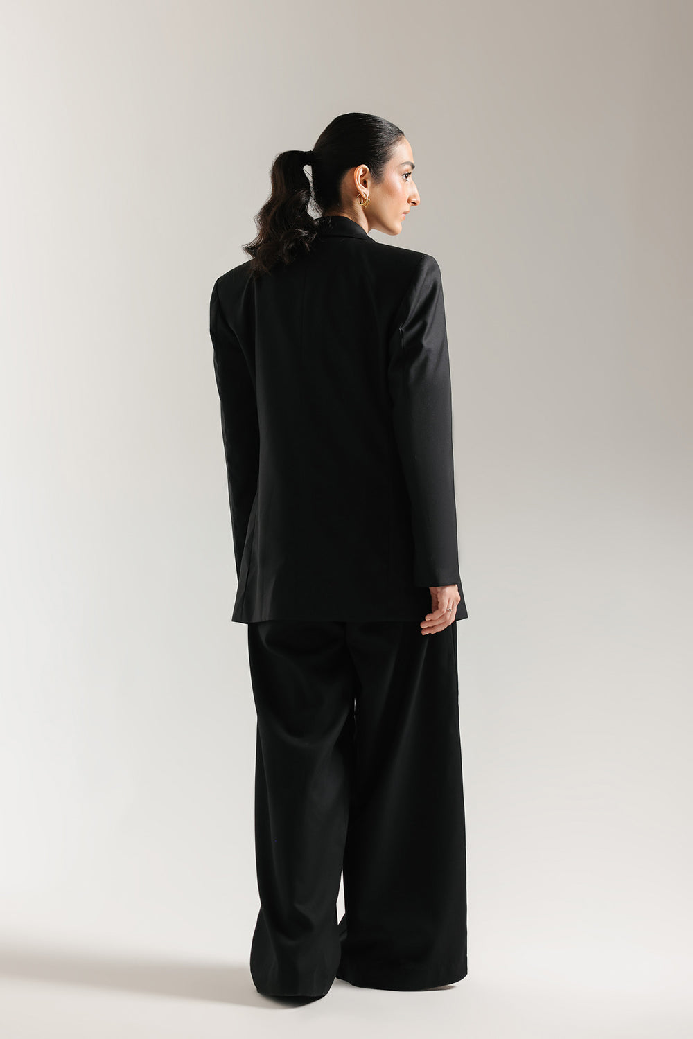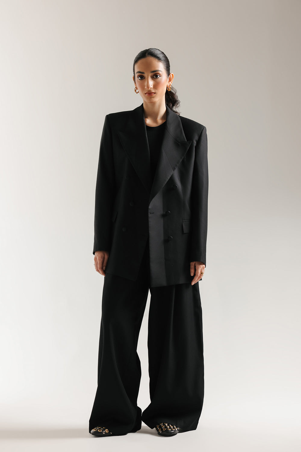 Command attention with this impeccably tailored blazer in a chic, classic black hue. This contemporary blazer features a relaxed, generous fit with sharply defined shoulders and wide, classic peak lapels. It boasts a single-button closure and flap pockets, blending traditional suiting elements with a modern, fashion-forward silhouette. Perfect for layering over anything from a casual tee to a formal blouse, this blazer instantly elevates any ensemble with sophisticated authority.
