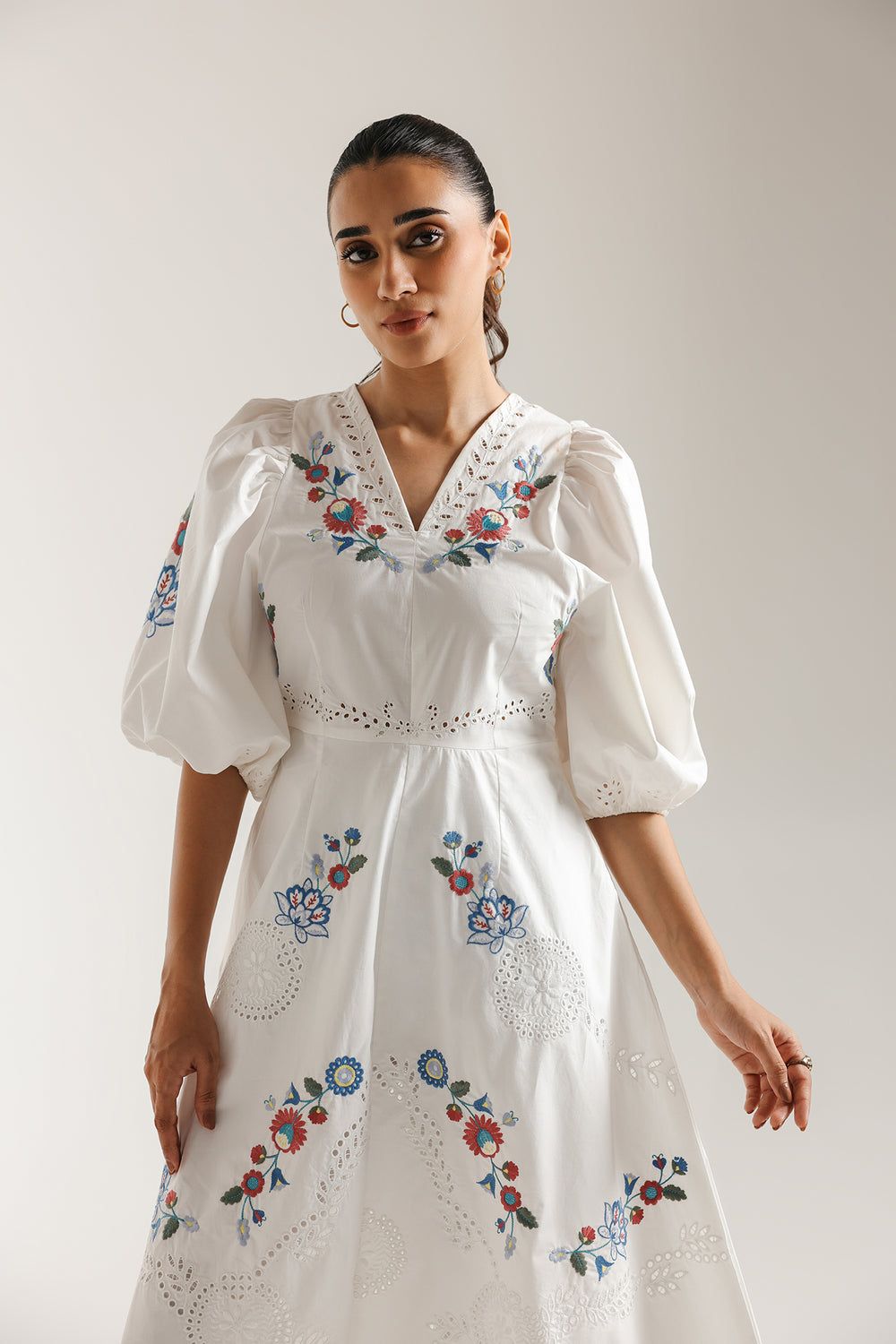 Capture effortless summer charm with this beautiful white midi dress. This elegant dress features a flattering V-neckline and stylish puffy elbow-length sleeves gathered at the cuff. The crisp white fabric is adorned with delicate eyelet cut-outs and stunning traditional floral embroidery in shades of blue, red, and sage green, creating lovely symmetrical garlands across the skirt. The midi-length skirt flows gracefully, making this dress a perfect, light, and airy choice for any daytime occasion.