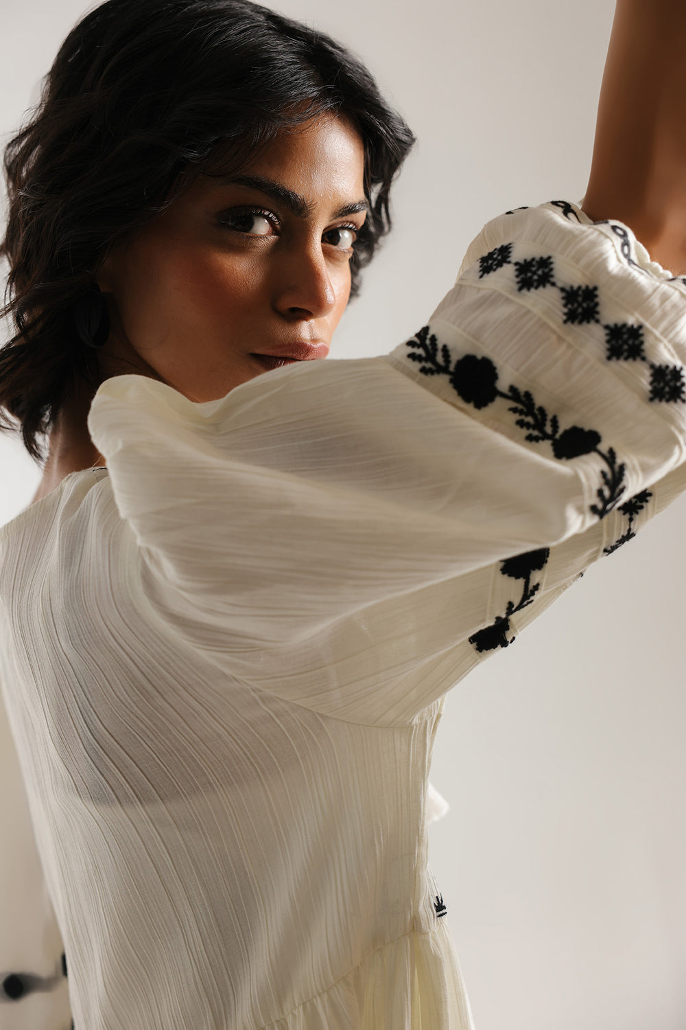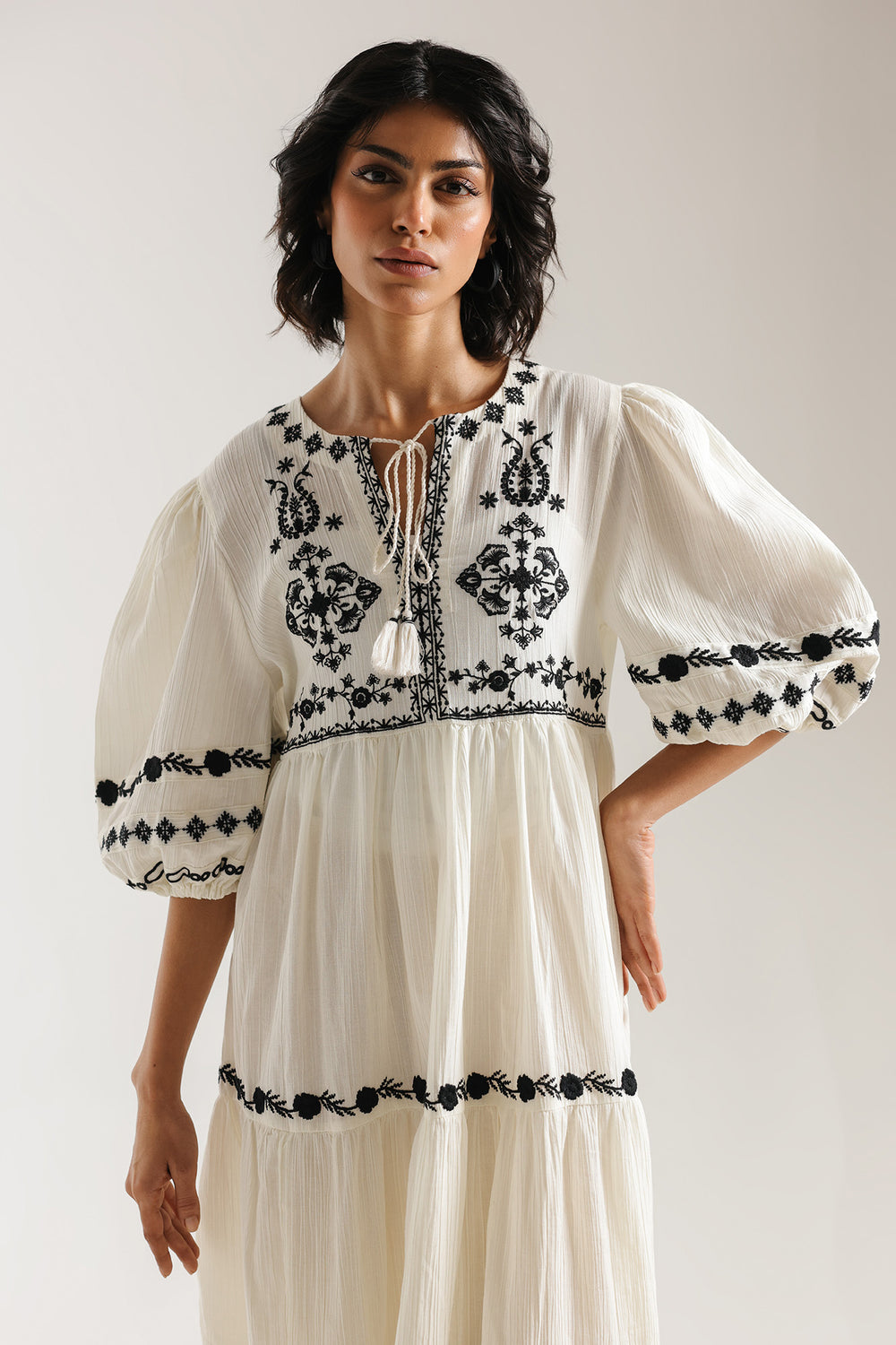 Embrace ethereal charm with this stunning off white embroidered dress. Crafted from a delicate, textured fabric, this flowing midi-length dress captures a perfect balance of bohemian spirit and refined elegance. The design is defined by its striking contrast embroidery in deep black, featuring intricate floral and geometric motifs that adorn the bodice and define each tier of the dress. Statement puffy balloon sleeves are finished with matching embroidered bands, creating a romantic and voluminous silhouette. A graceful V-neckline with a dainty tie closure and tassel detail adds a touch of traditional artistry to the modern, relaxed fit. Whether you're attending a garden party or looking for an elevated daytime look, this dress offers effortless style and movement.