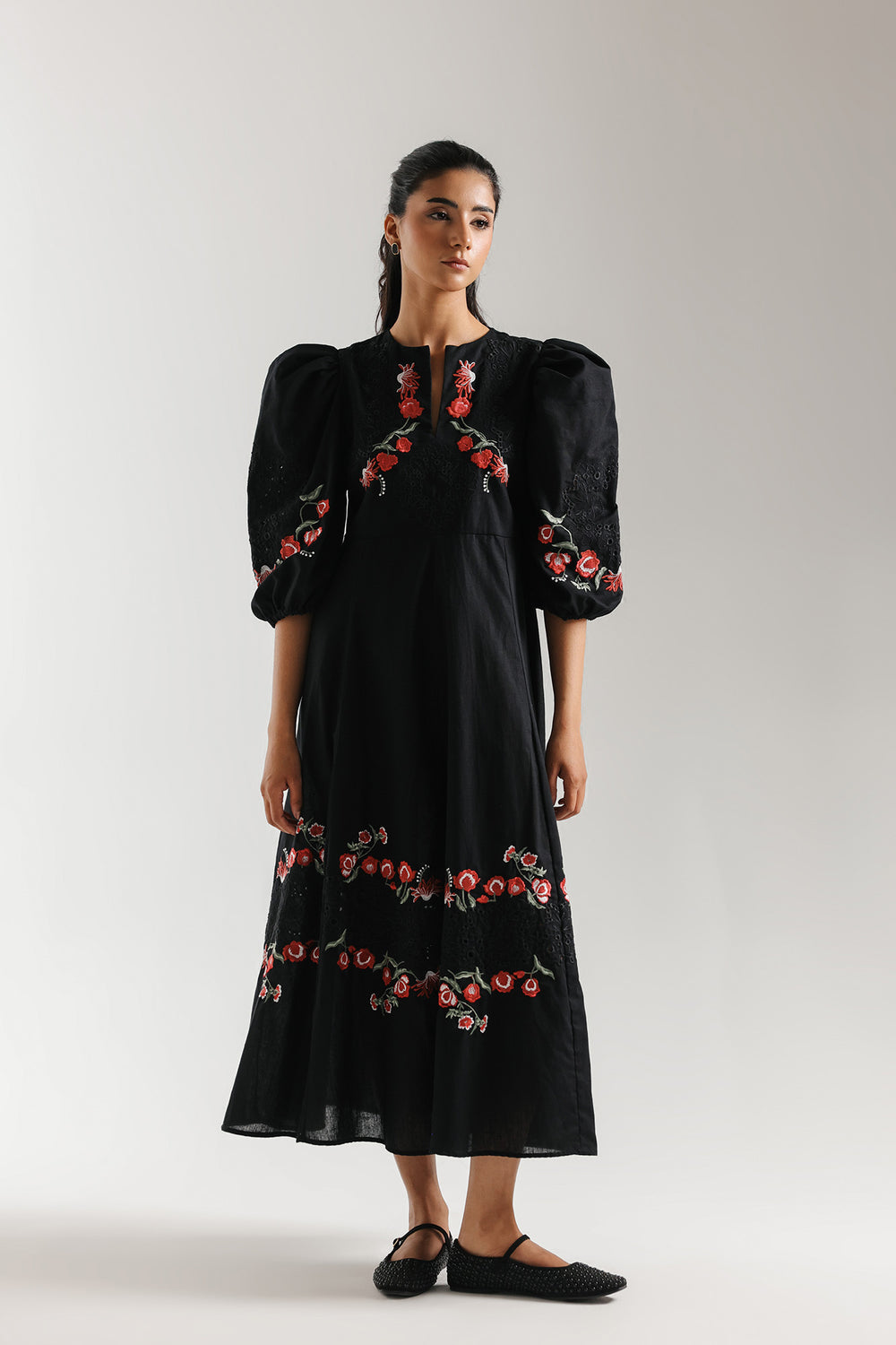 This elegant black midi dress with the voluminous puff sleeves creates a dramatic silhouette, while intricate red and green floral embroidery adorns the rounded neckline and cascades down the skirt in horizontal bands. The subtle V-notch at the center adds refined detail to the bodice. Cut to a flattering mid-calf length, this piece seamlessly blends classic sophistication with ornate embellishment, making it an ideal choice for special occasions or elevated everyday wear.