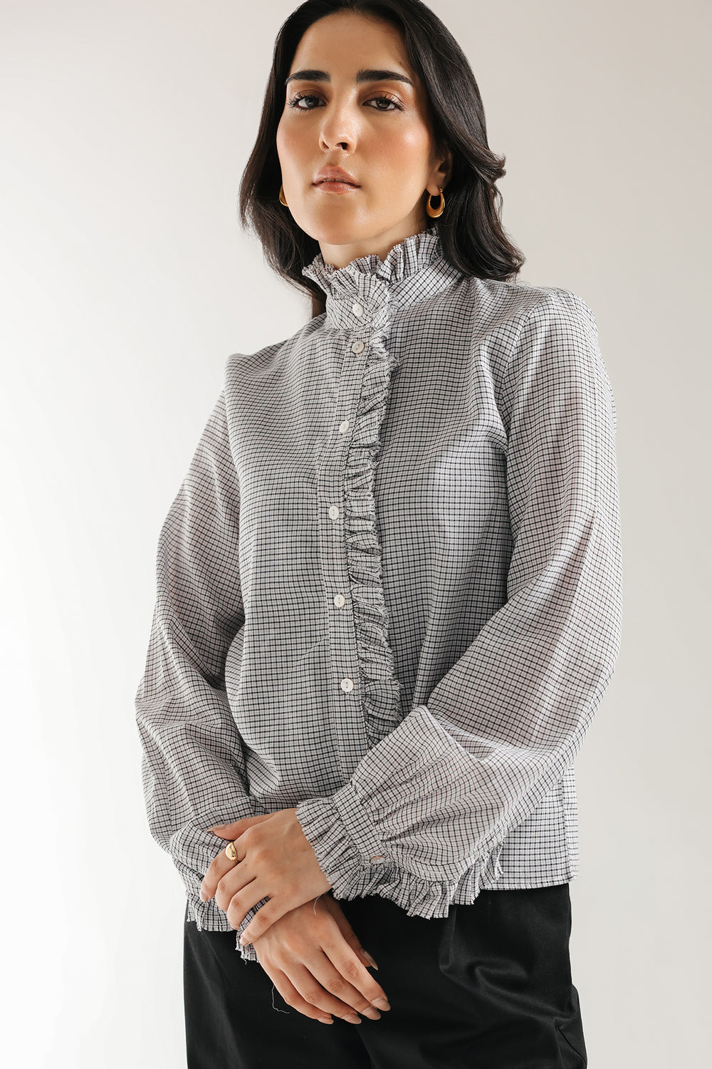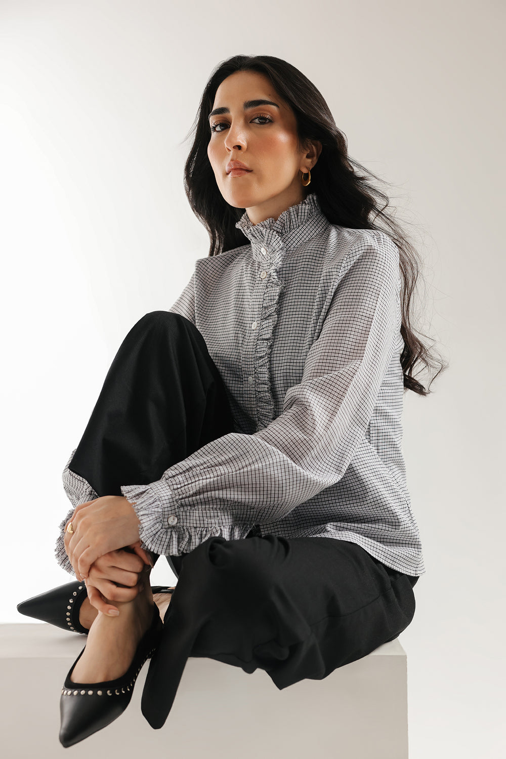 A perfect blend of vintage charm and modern sophistication, this chic checkered blouse is designed to make a statement. The delicate, ruffled high neck and placket add a touch of romantic elegance, while the voluminous sleeves with gathered cuffs create a beautifully structured silhouette. This versatile piece can be styled effortlessly for a professional look or a stylish outing.