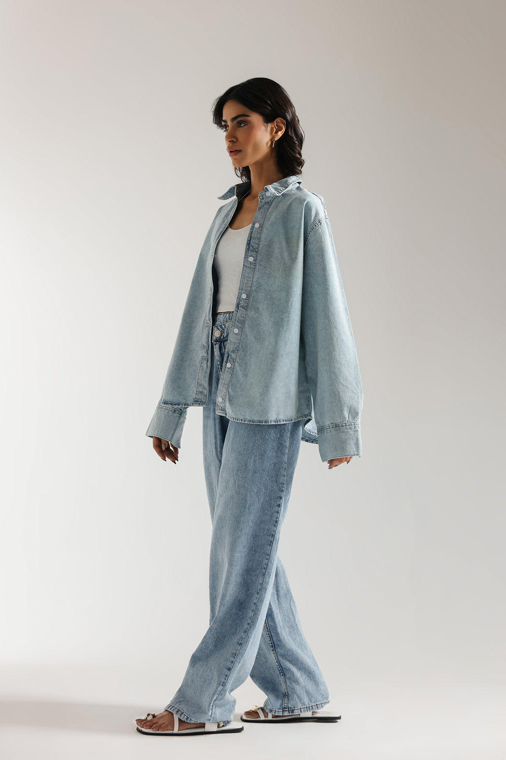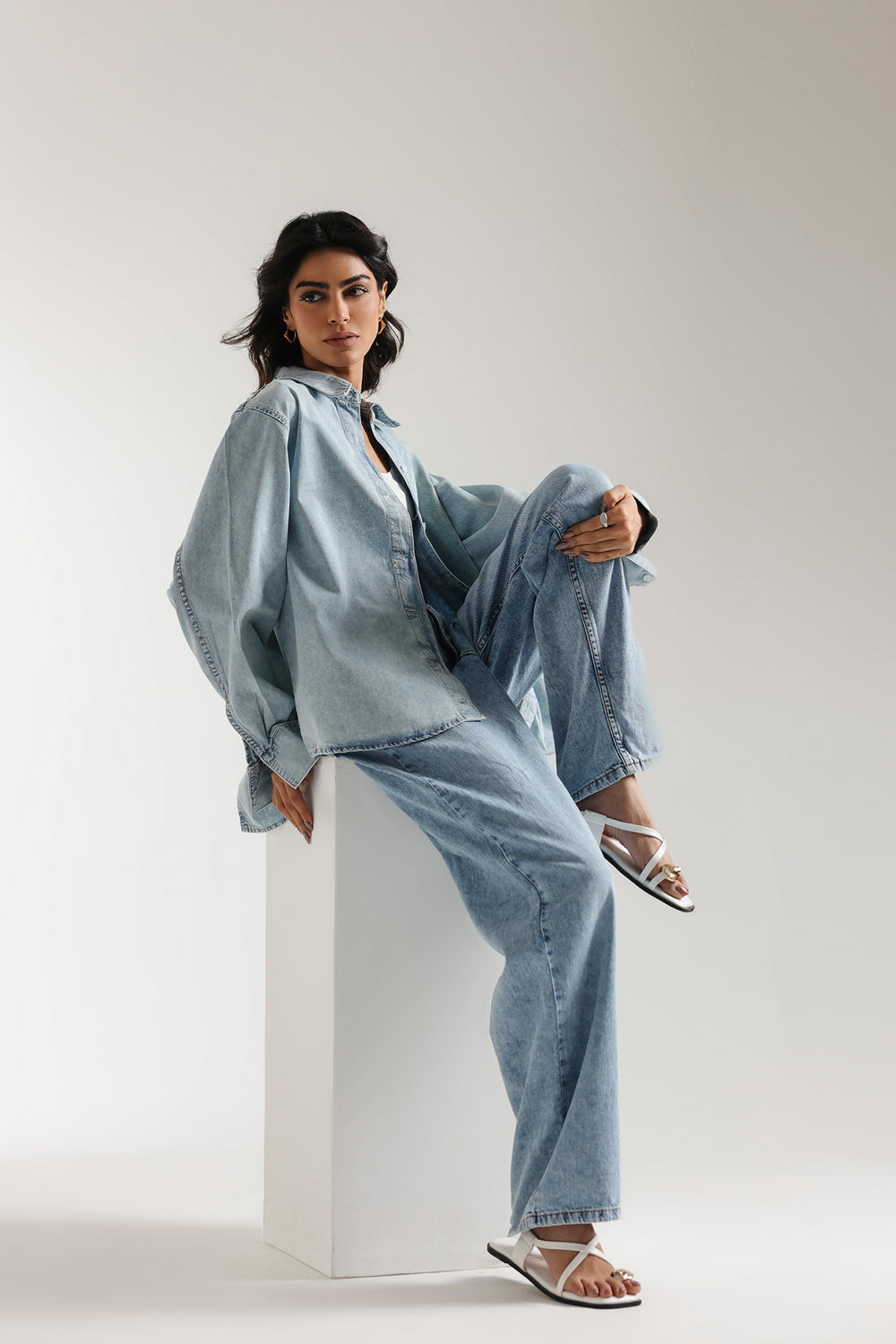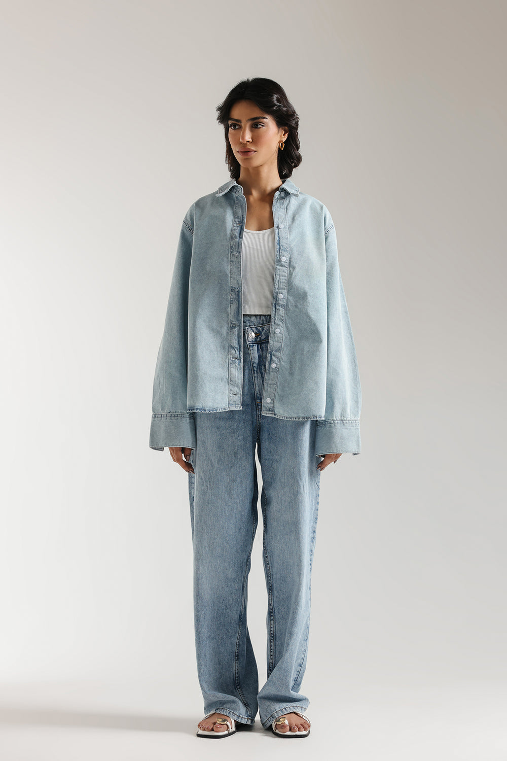 An aesthetically rich composition is portrayed on this trendy denim shirt rendered in a soft skyway blue color. Crafted in a chic button down silhouette illustrating contemporary design with round hem. This contemporary shirt is a perfect option to style at fun occasions this season.