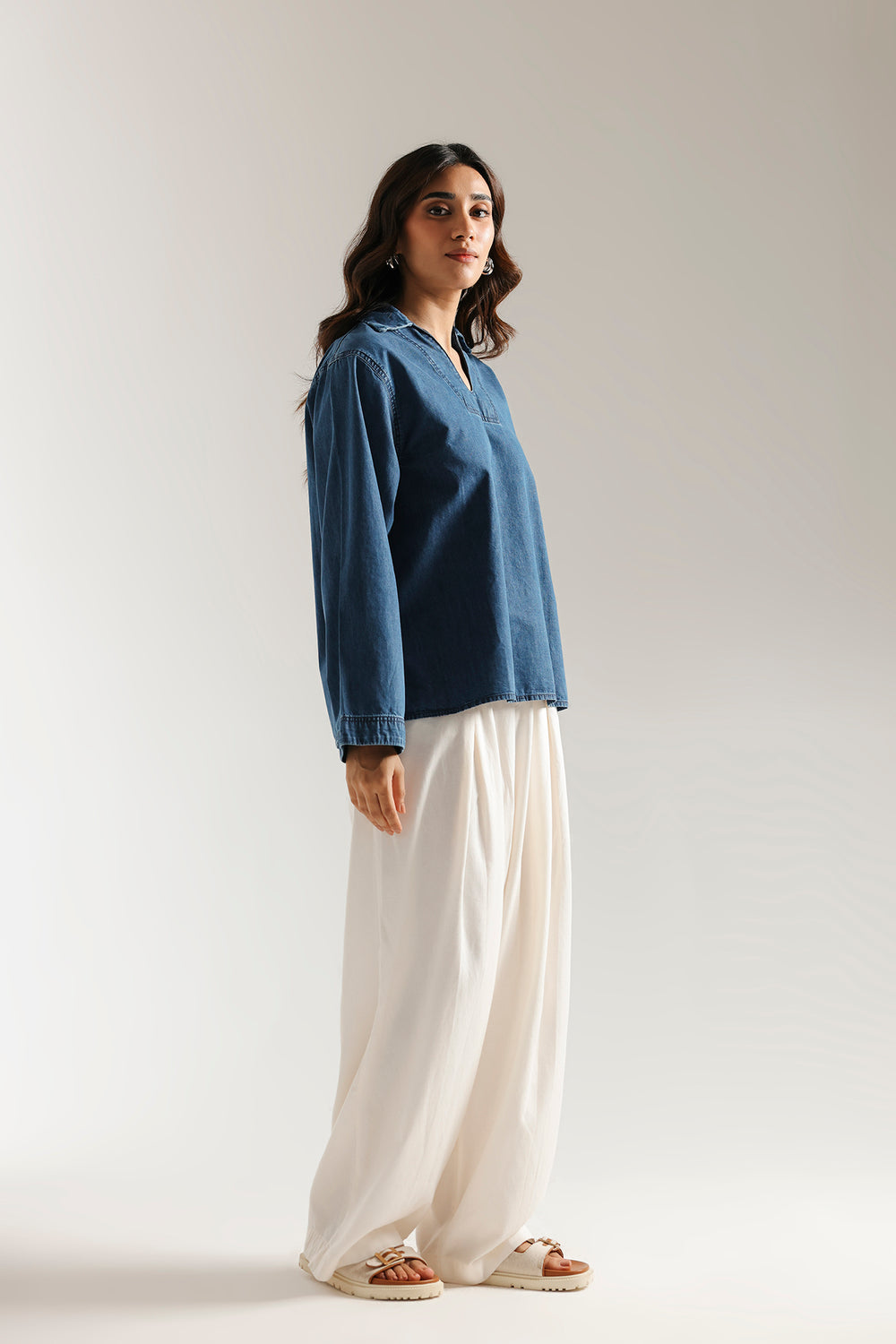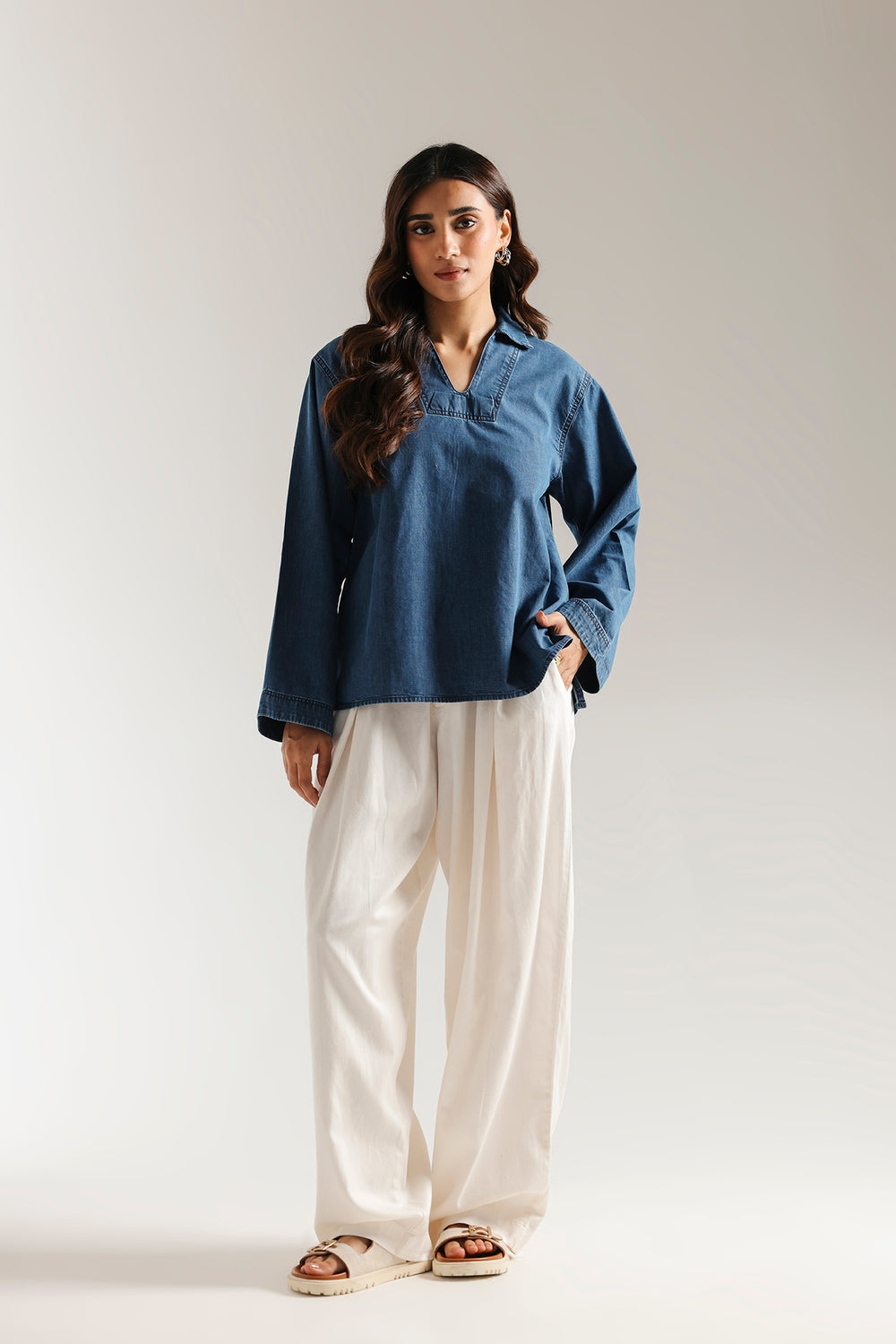 This effortlessly stylish top offers a fresh take on classic denim. The relaxed, boxy fit and wide sleeves provide ultimate comfort, while the clean V-neckline adds a touch of modern sophistication. Its versatile design makes it a perfect piece to pair with wide-leg trousers for a chic, contemporary look.