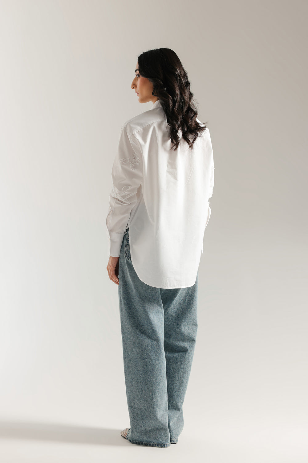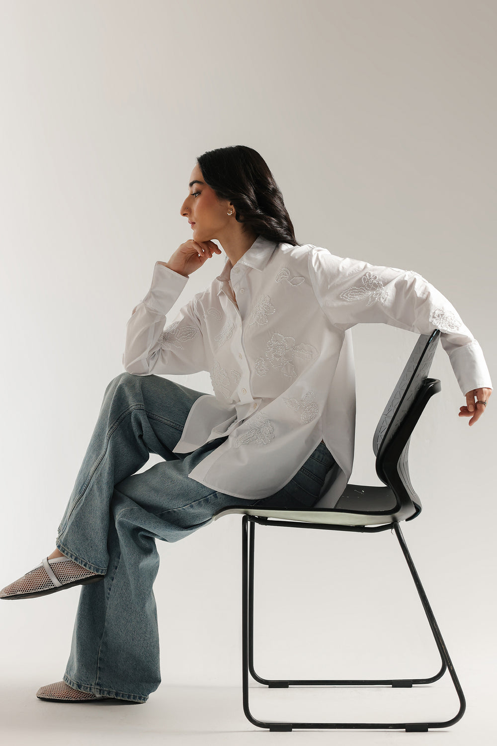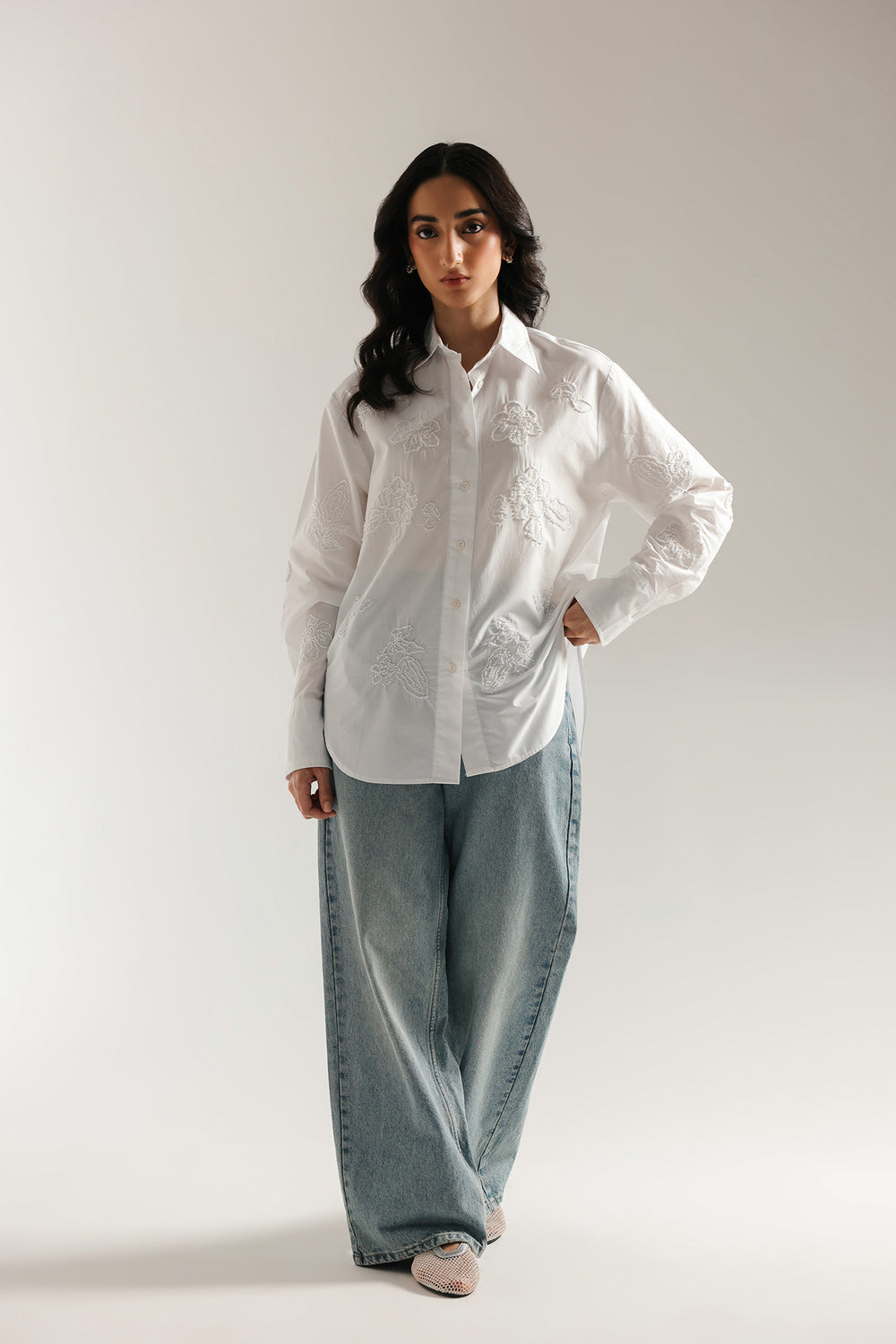Add a touch of playful sophistication to your wardrobe with this stylish embroidered shirt. This crisp white button-down shirt features a classic long-sleeve silhouette. It is adorned with delicate white floral beadwork, creating a beautiful look that is both modern and elegant. With its comfortable fit and versatile design, this shirt is perfect for making a sophisticated statement at any event.
