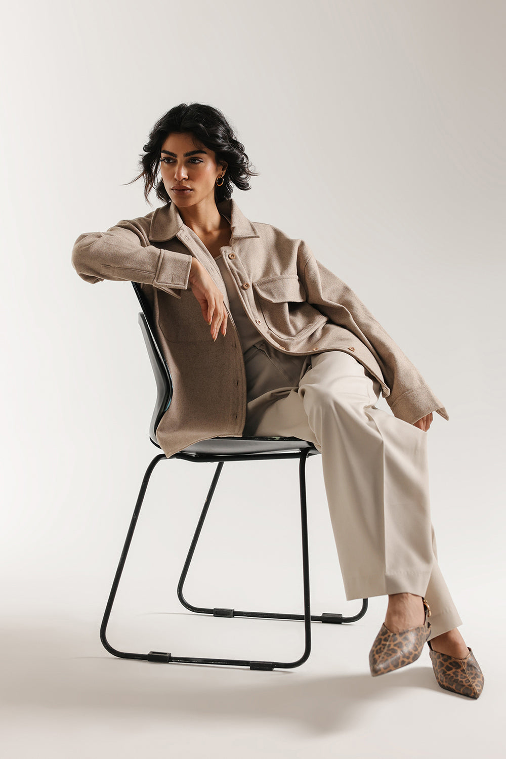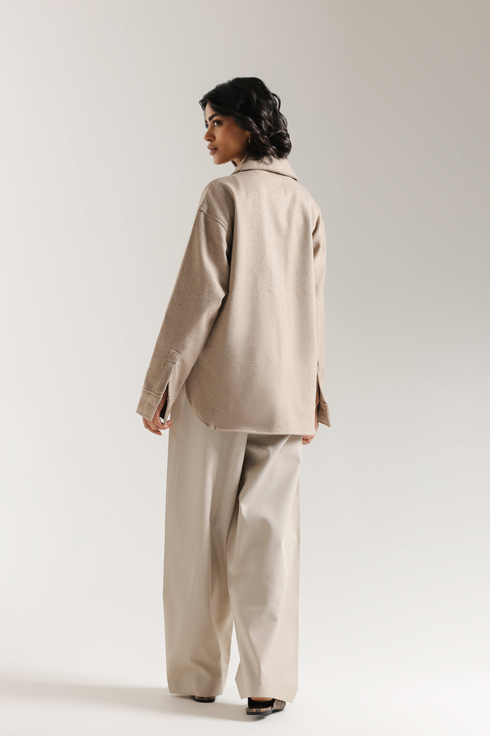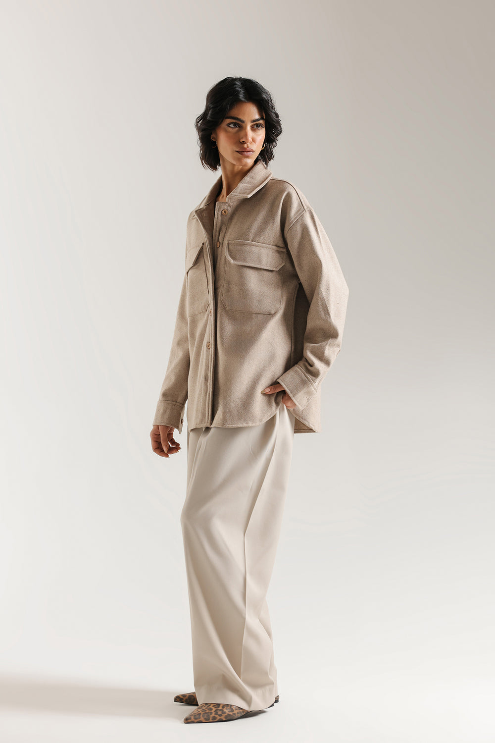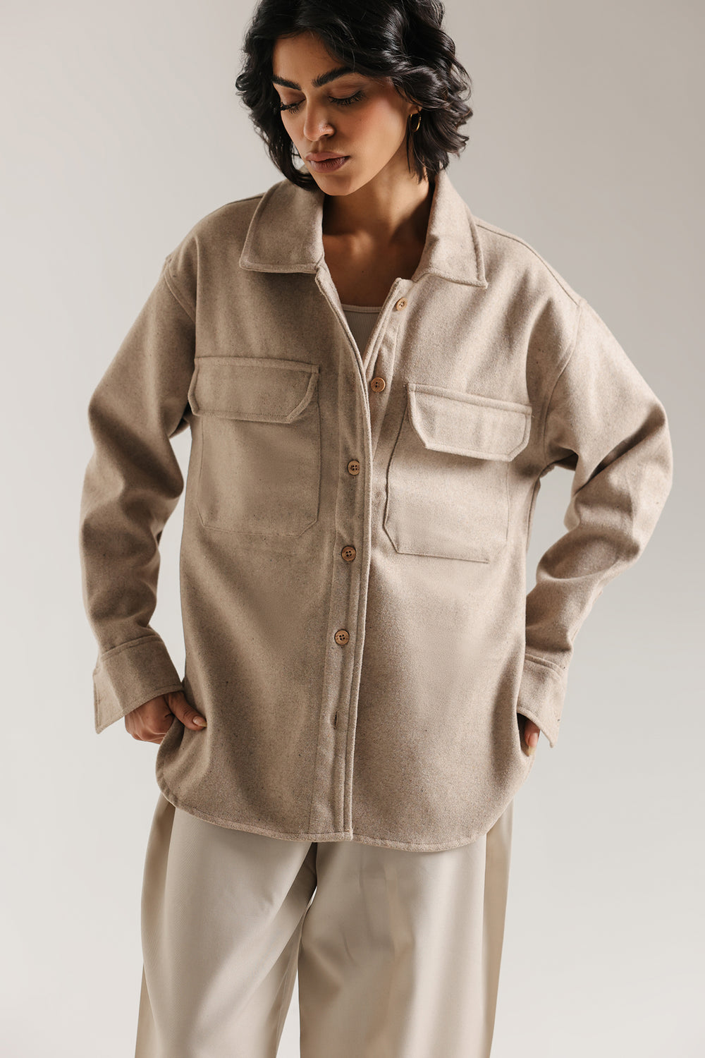 Achieve a look of relaxed sophistication with this essential straight fit shirt. This contemporary piece, which functions like a light jacket or substantial shirt, is made from a softly textured, fabric in a versatile sand color. The design features a classic shirt collar, full button closure, and on-trend oversized patch pockets on the chest, enhancing its structured yet comfortable silhouette. This overshirt is the perfect layering piece, instantly adding polish and warmth to any outfit while maintaining a modern, minimalist aesthetic.