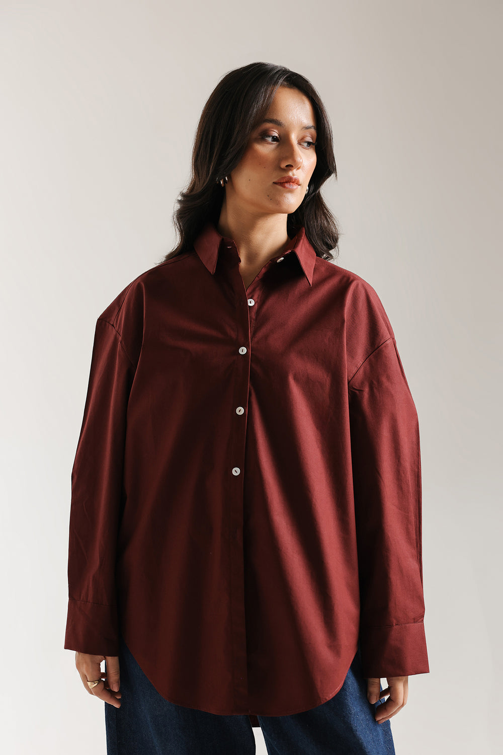 Maximize your sophisticated casual style with this oversized button-down shirt. This comfortable top is crafted from a fabric in a rich deep maroon/brown hue and features an intentionally oversized, boxy fit. It includes a classic shirt collar, full-length sleeves, and clean white buttons down the front. Its structured yet relaxed drape makes it perfect for styling tucked into high-waisted wide-leg denim or worn loosely as a light upper over a tank top.