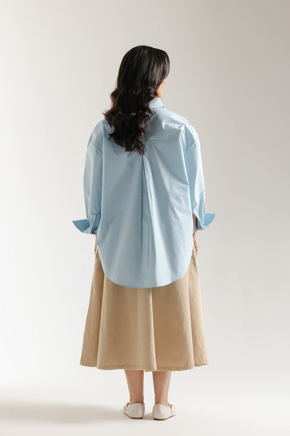 Maximize your sophisticated casual style with this oversized button-down shirt. This comfortable top is crafted from a fabric in a skyway hue and features an intentionally oversized, boxy fit. It includes a classic shirt collar, full-length sleeves, and clean white buttons down the front. Its structured yet relaxed drape makes it perfect for styling tucked into high-waisted wide-leg denim or worn loosely as a light upper over a tank top.