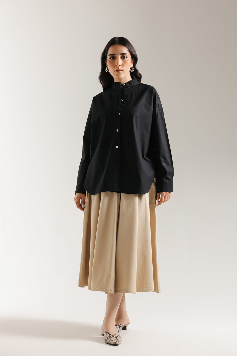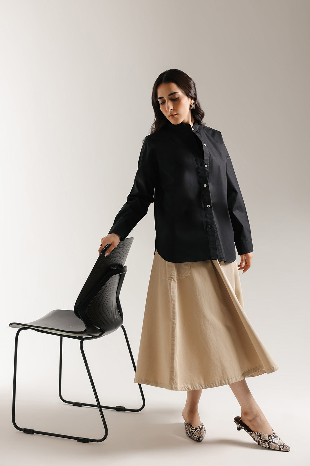 Step into sophisticated simplicity with this chic black button-down shirt. Crafted with a sleek, minimalist aesthetic, it features a refined band collar that provides a clean, contemporary alternative to a traditional neckline. The shirt is designed with a comfortable, relaxed fit, allowing for graceful movement and versatility. It is subtly detailed with white buttons down the front, blending seamlessly with the deep black fabric. Paired with a midi skirt for a polished look, this shirt is a foundational piece for building modern, professional, and endlessly stylish outfits.