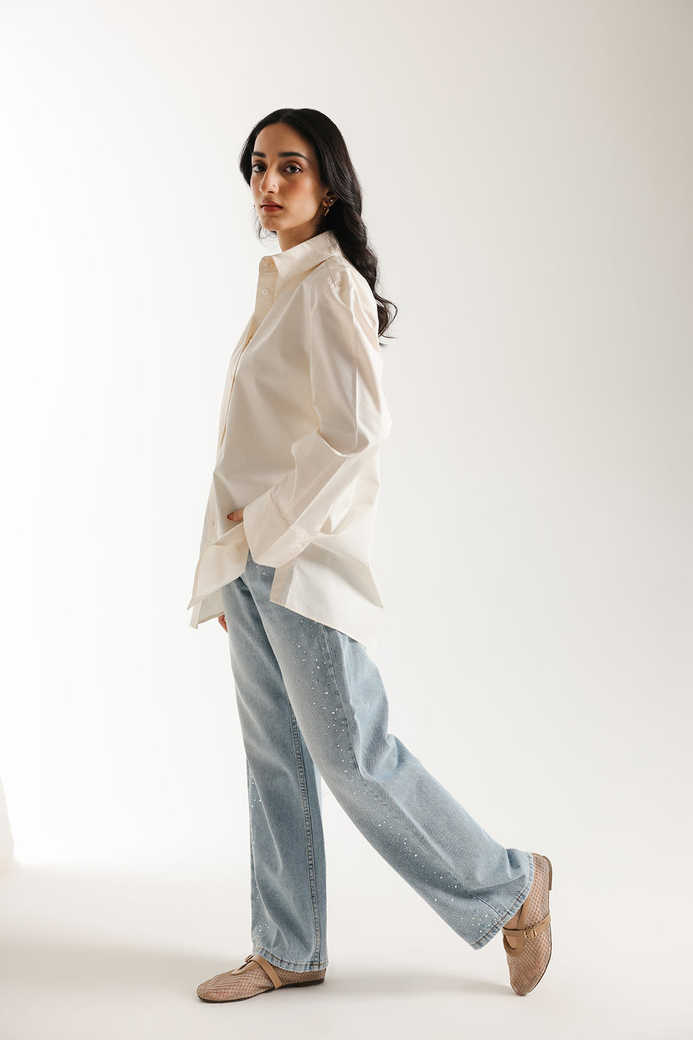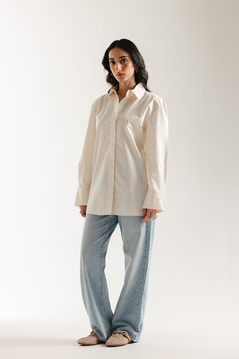 Effortlessly elevate your everyday style with this crisp button down shirt. Crafted in a soft, off-white fabric, the shirt features a relaxed, slightly oversized fit and a classic collar, offering a modern take on tailoring. The voluminous, full-length sleeves are the standout feature, gathering dramatically at the shoulder before falling to wide cuffs, lending an element of sophisticated drape and movement. This shirt is a versatile piece for creating a polished, contemporary look.