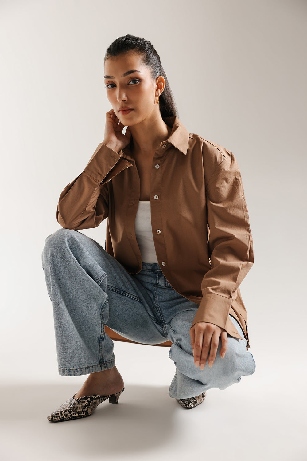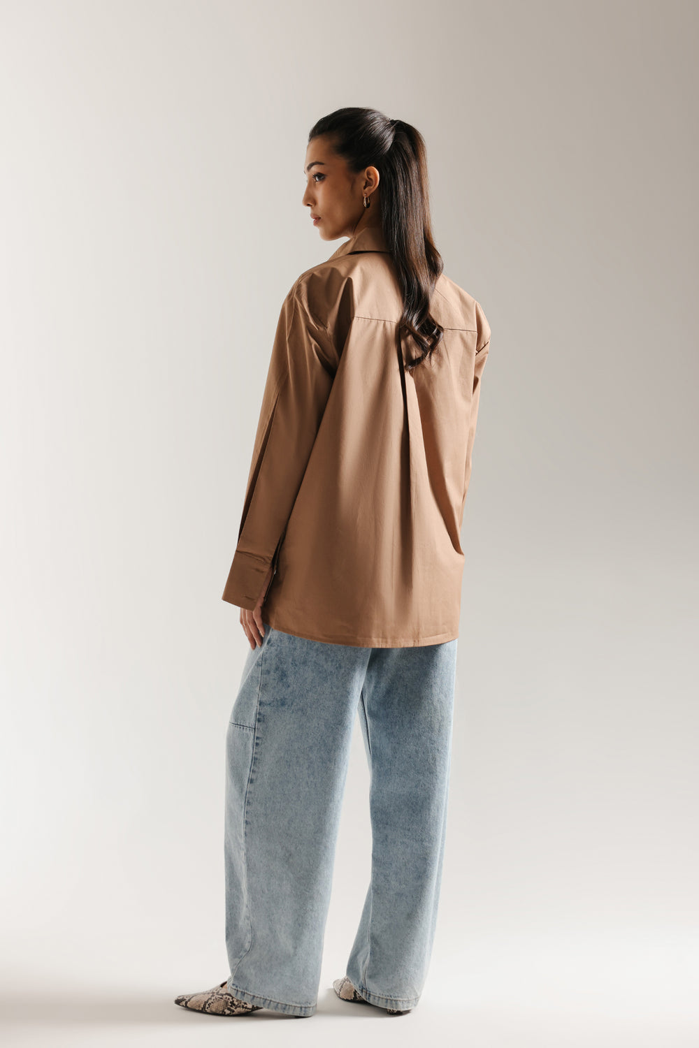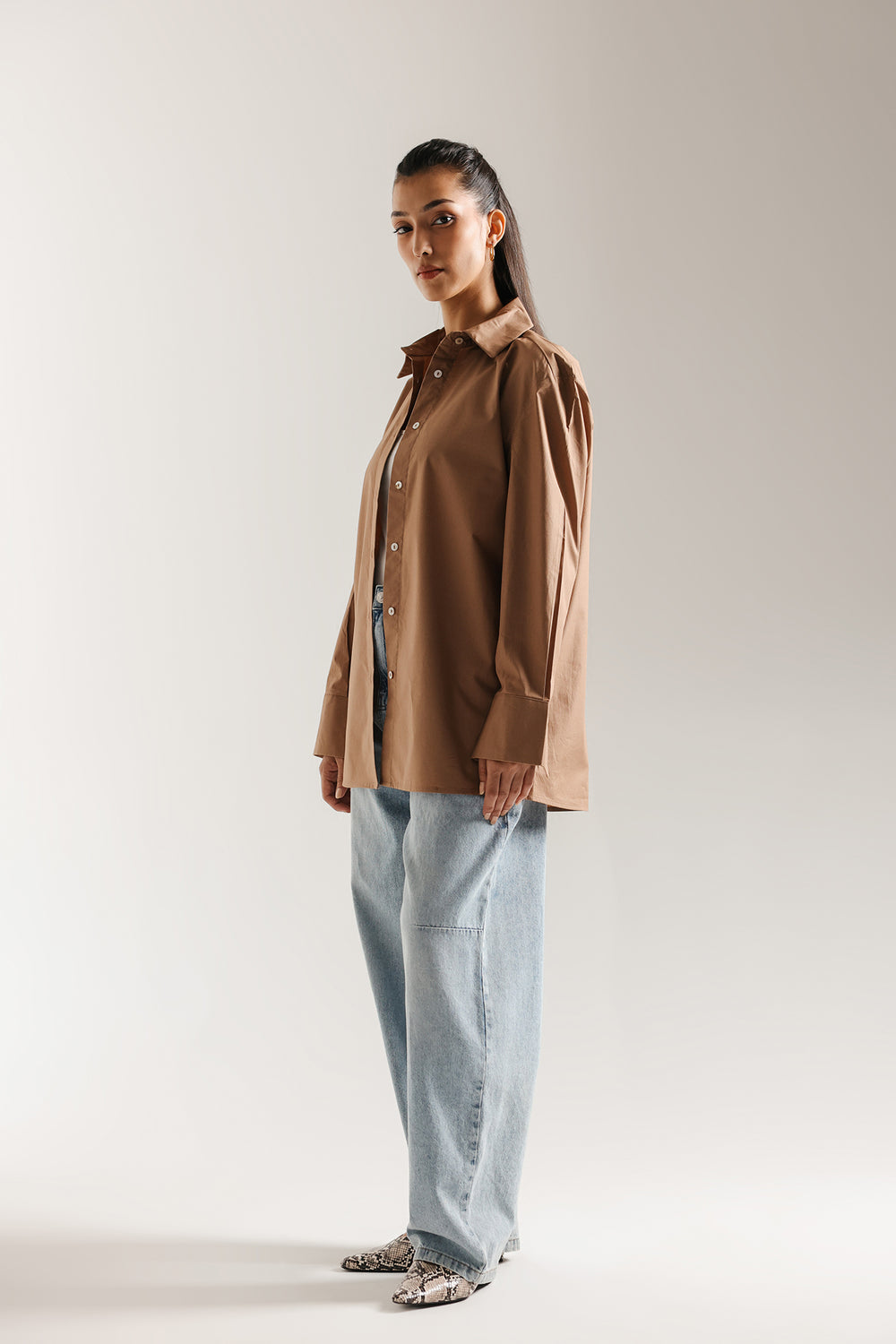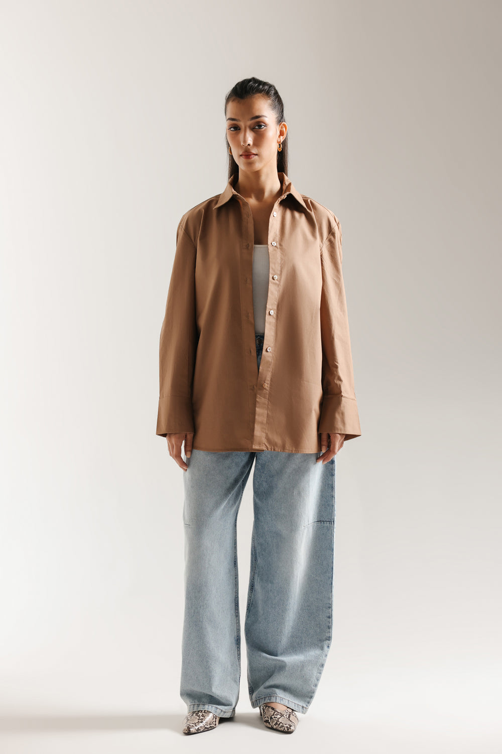 Effortlessly elevate your everyday style with this crisp button down shirt. Crafted in a classic, beige fabric, the shirt features a relaxed fit and a classic collar, offering a modern take on tailoring. The full-length sleeves, slightly off shoulder, lend an element of sophisticated drape and movement. This shirt is a versatile piece for creating a polished, contemporary look.
