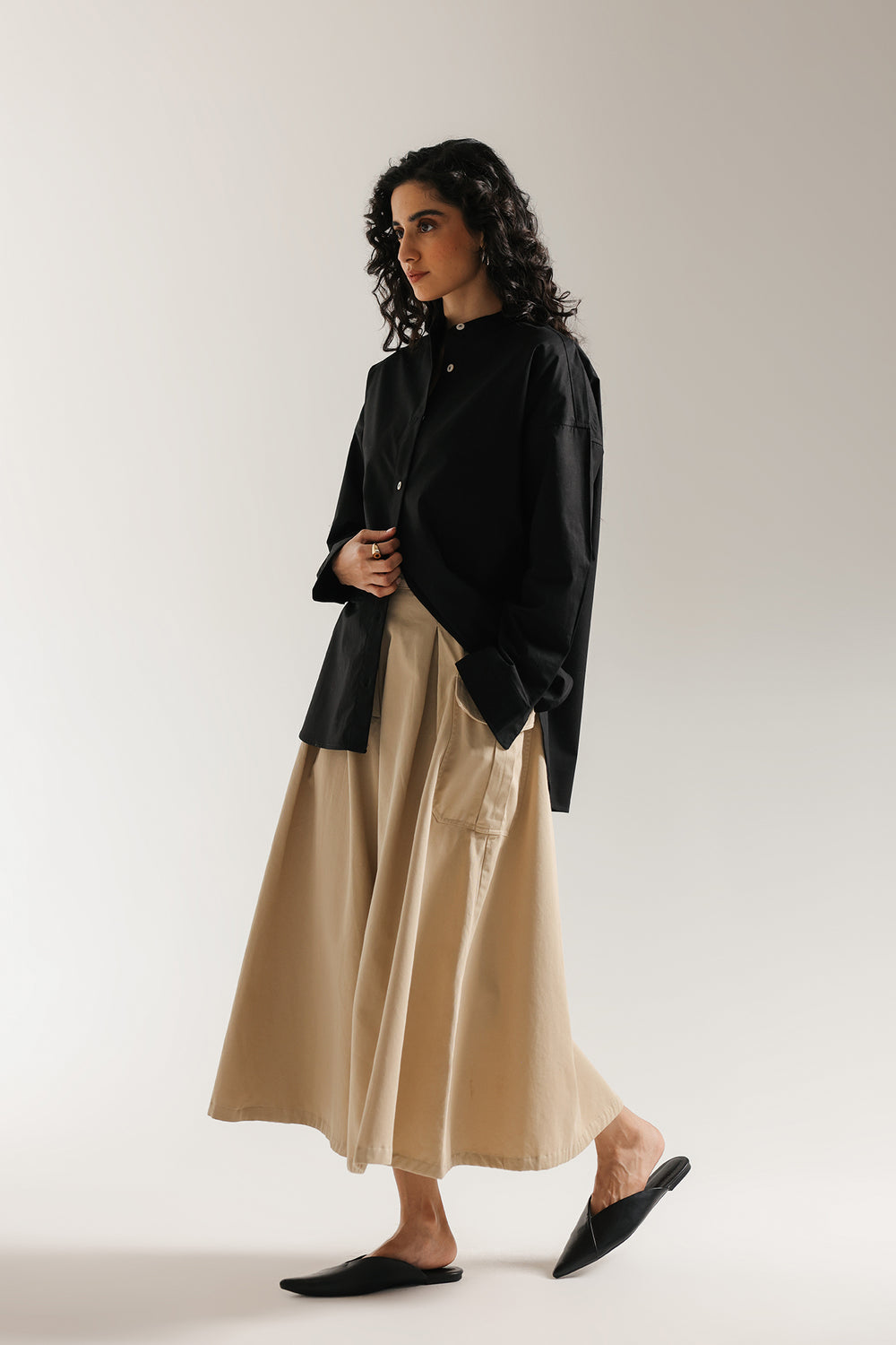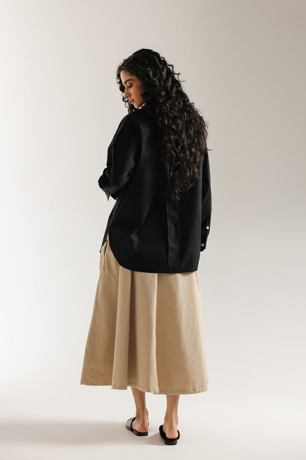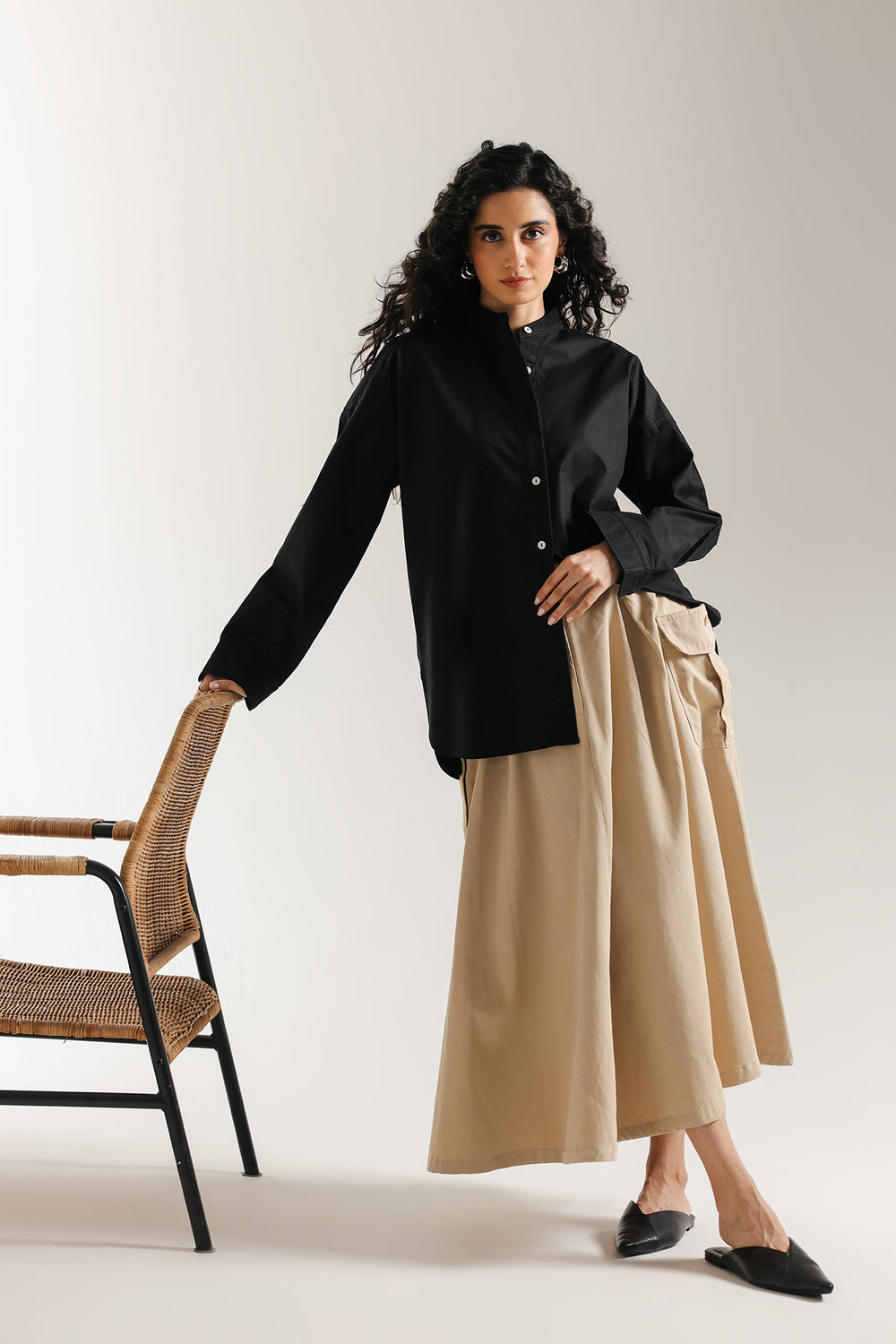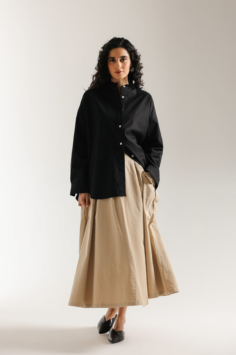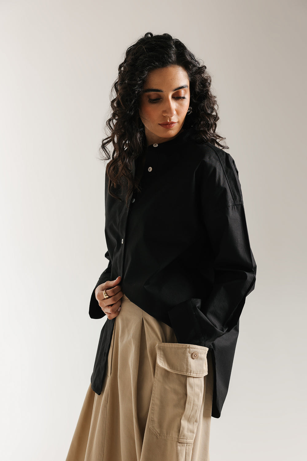Channel effortless modern sophistication with this chic black button down shirt. This shirt is designed for a comfortable, oversized, and slightly structured fit. It features a neat band collar, a classic button-down placket, and long full sleeves. This versatile piece can be worn buttoned up for a polished look or layered open over other tops.