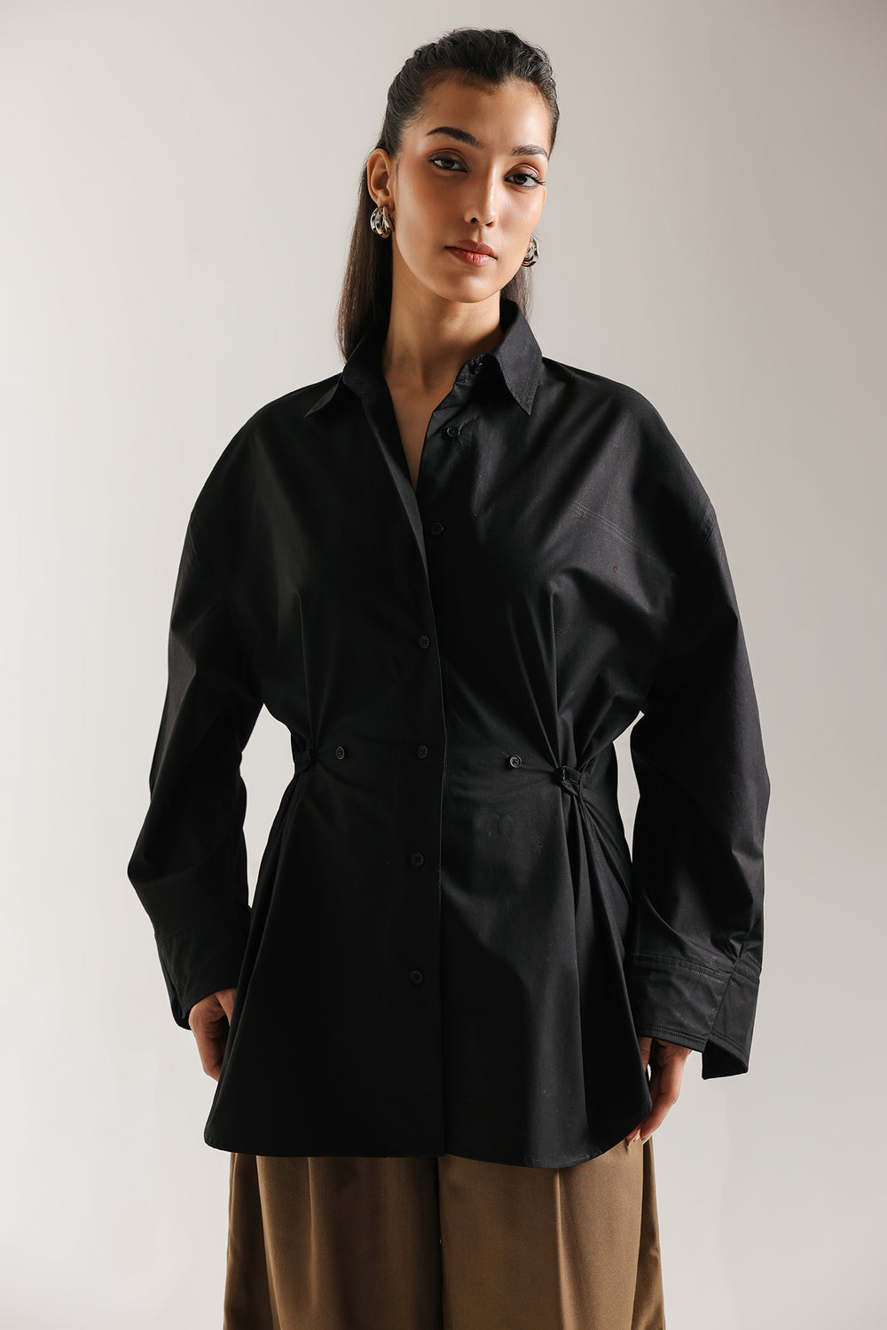 Elevate your everyday wardrobe with this sophisticated black shirt. This contemporary top is crafted in a crisp solid black fabric. It features an oversized, relaxed silhouette with wide, long sleeves. The shirt has a classic collar and a full button-down front. A flattering cinched waistline with subtle gathering adds structure and definition to the voluminous cut. Paired here with wide-leg, camel-colored trousers, this piece is an essential for a chic, modern look.