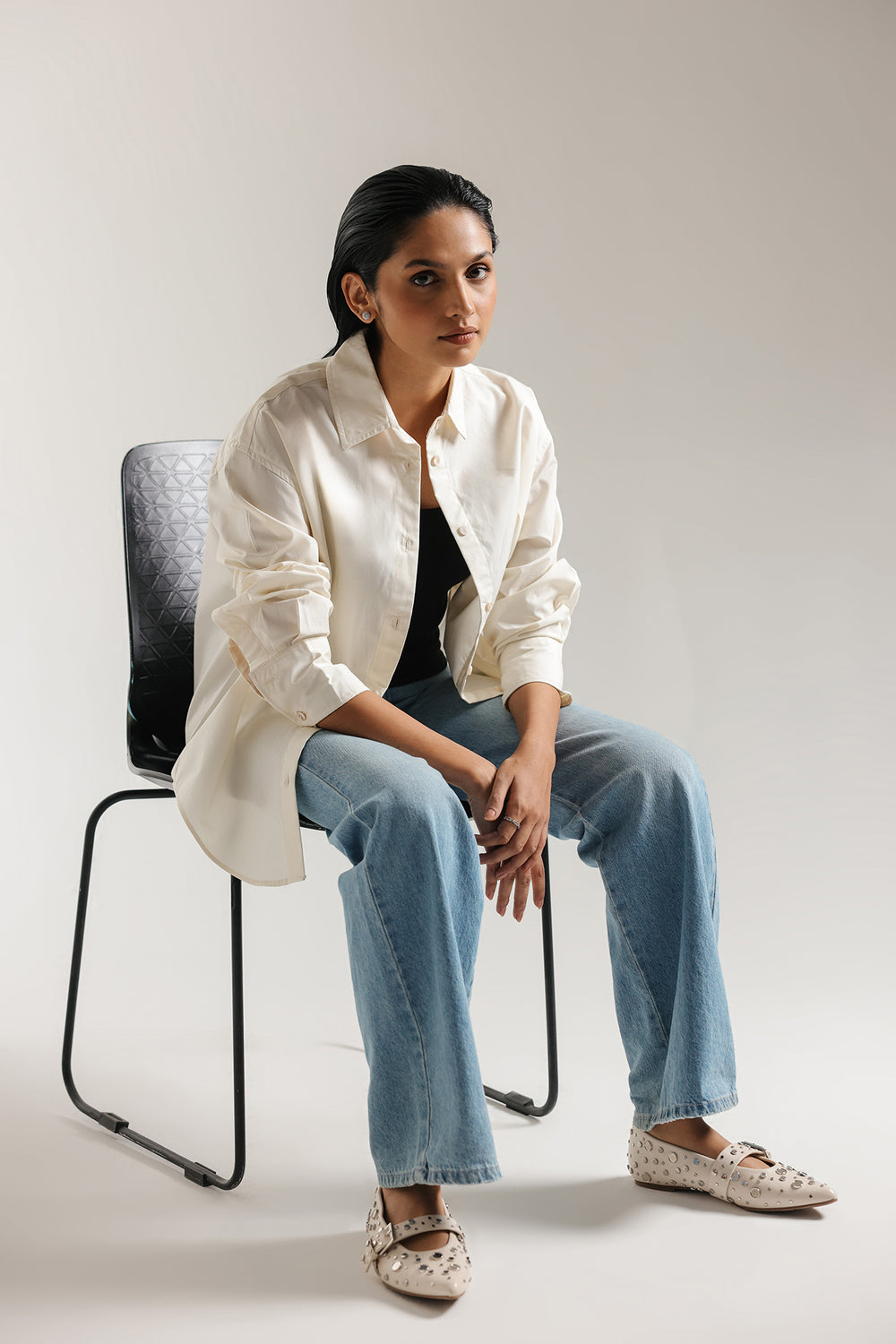 Channel effortless modern sophistication with this chic white button down shirt. This shirt is designed for a comfortable, slightly structured fit. It features a neat classic collar, a classic button-down placket, and long full sleeves. This versatile piece can be worn buttoned up for a polished look or layered open over other tops.