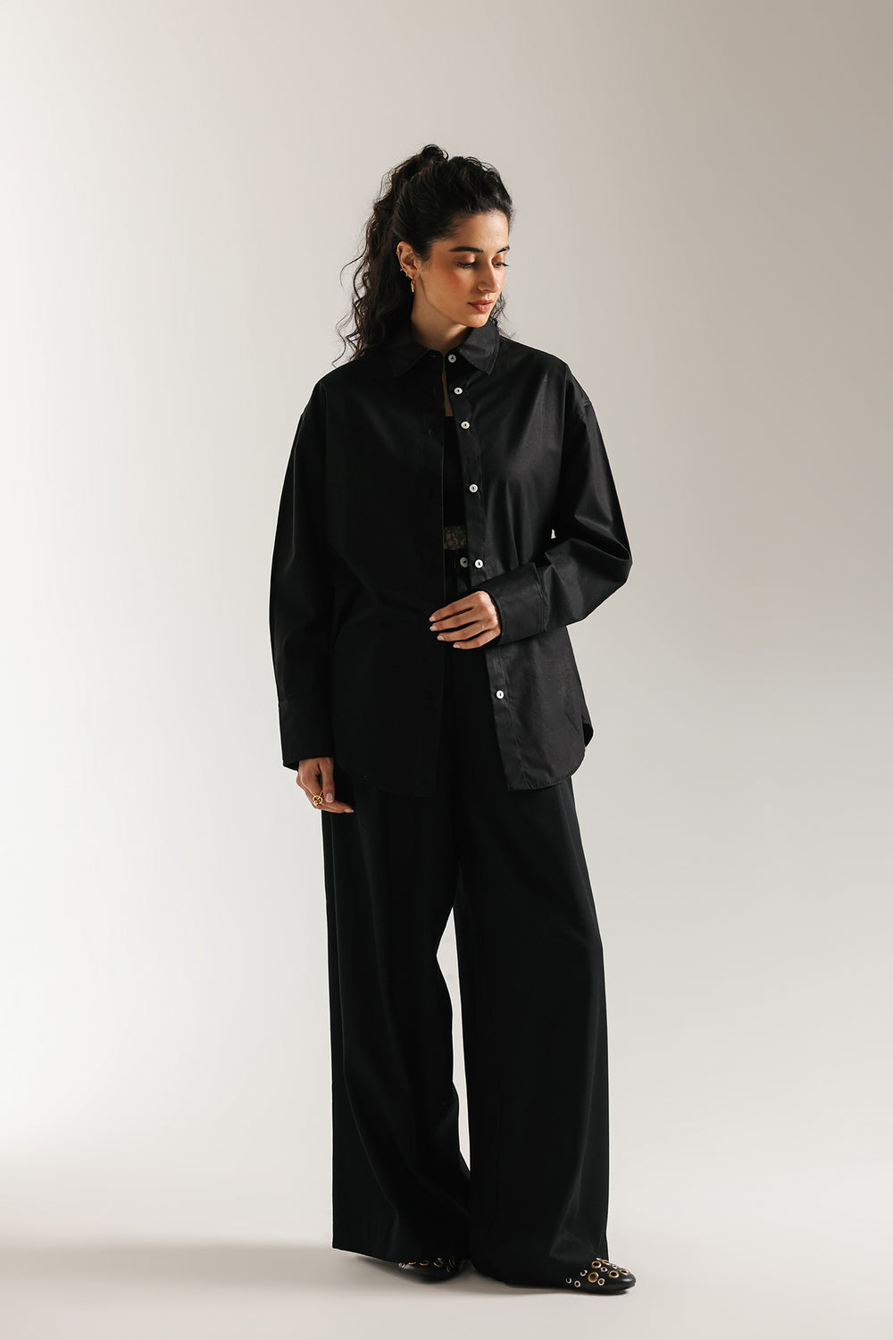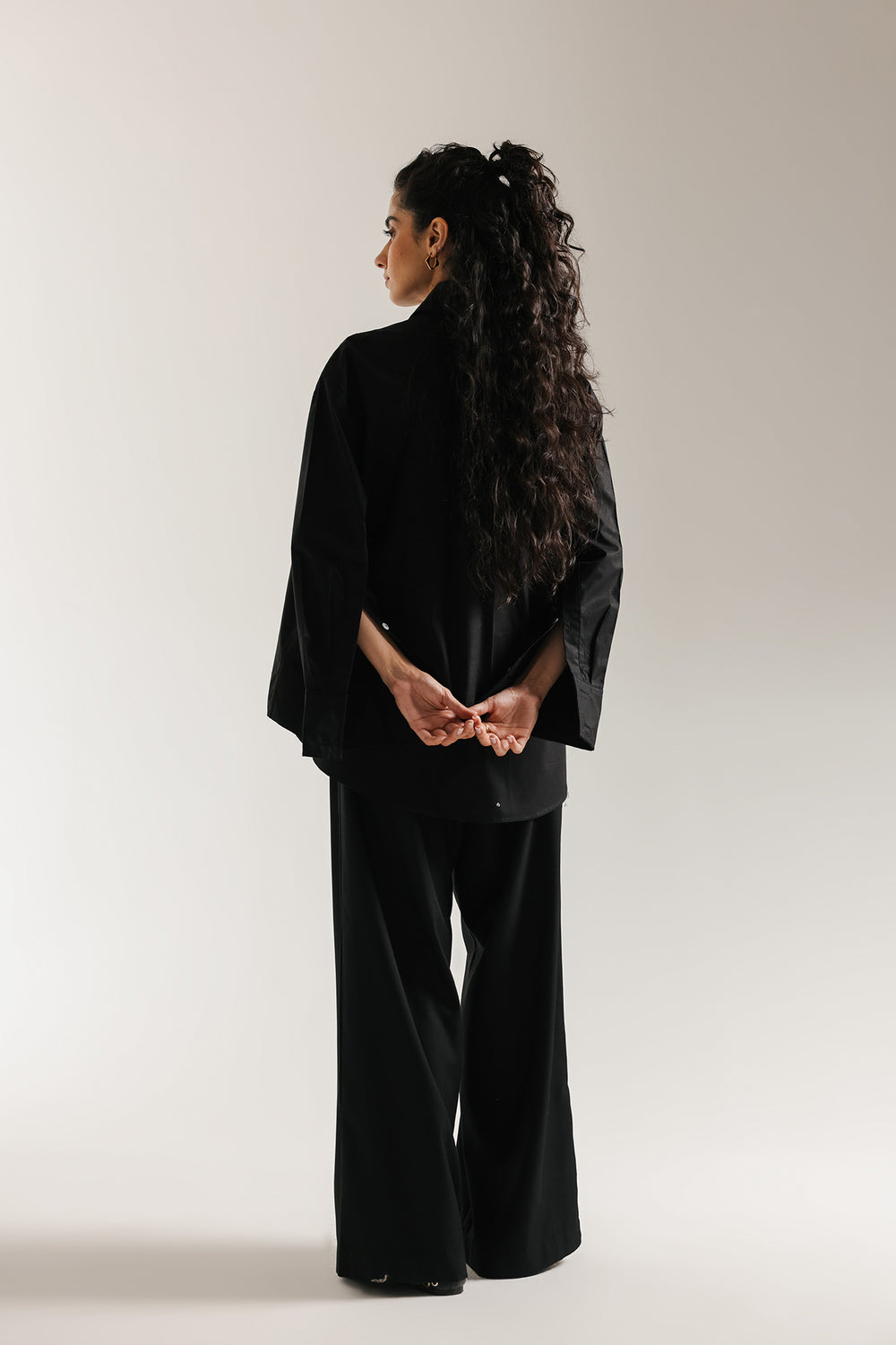 Channel effortless modern sophistication with this chic black button down shirt. This shirt is designed for a comfortable, slightly structured fit. It features a neat classic collar, a classic button-down placket, and long full sleeves. This versatile piece can be worn buttoned up for a polished look or layered open over other tops.
