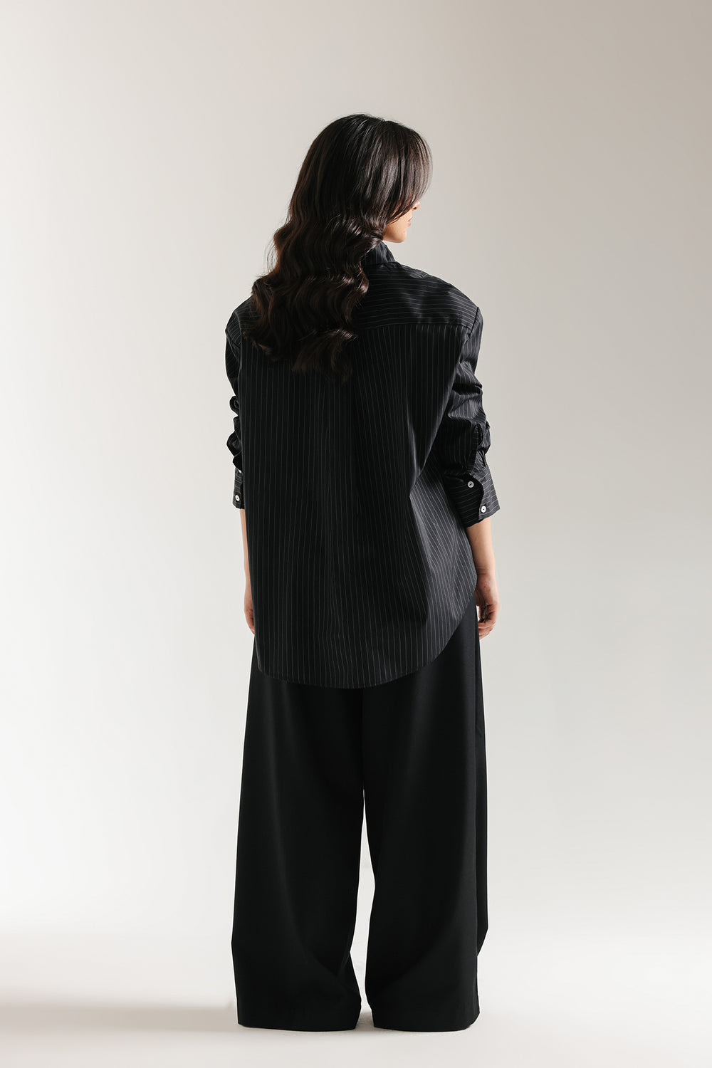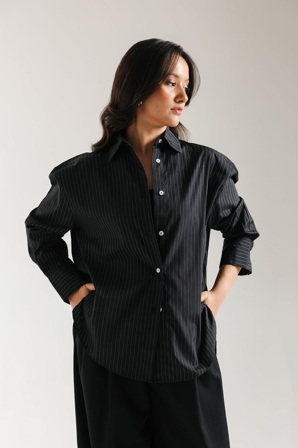 Command effortless power in this minimalist black pinstripe shirt. This versatile top is crafted from a comfortable black fabric and features a subtle white pinstripe pattern. The design maintains a classic button-down structure with a sharp collar and contrasting white buttons, while the relaxed fit introduces a modern, classy silhouette. Pair it with wide-leg trousers for a chic, contemporary monochrome look that transitions seamlessly from day to night.