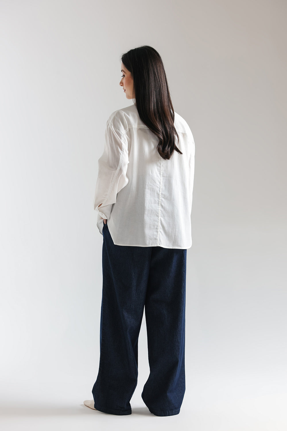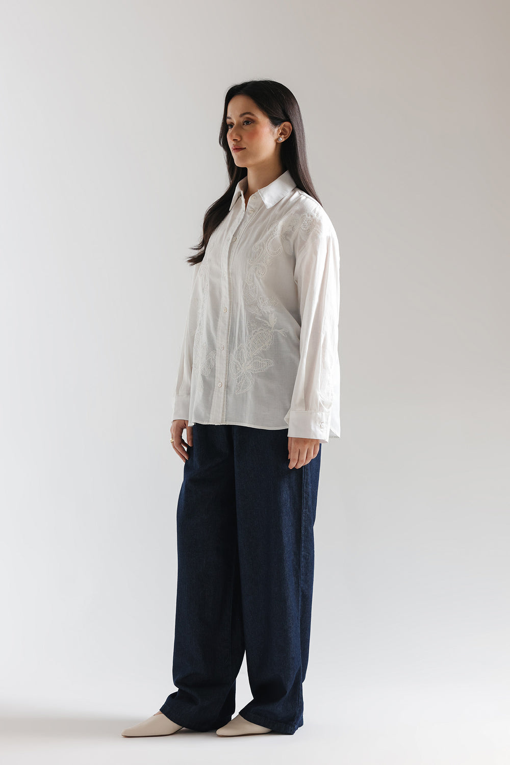 Elevate your wardrobe with this refined collar button-down shirt in pristine white. Featuring meticulous embroidery detailing across the front, this piece combines classic tailoring with sophisticated craftsmanship. The structured collar and full button front ensure a polished appearance suitable for both professional and casual settings. Attention to detail makes this shirt a versatile essential that transitions seamlessly from office to evening wear.