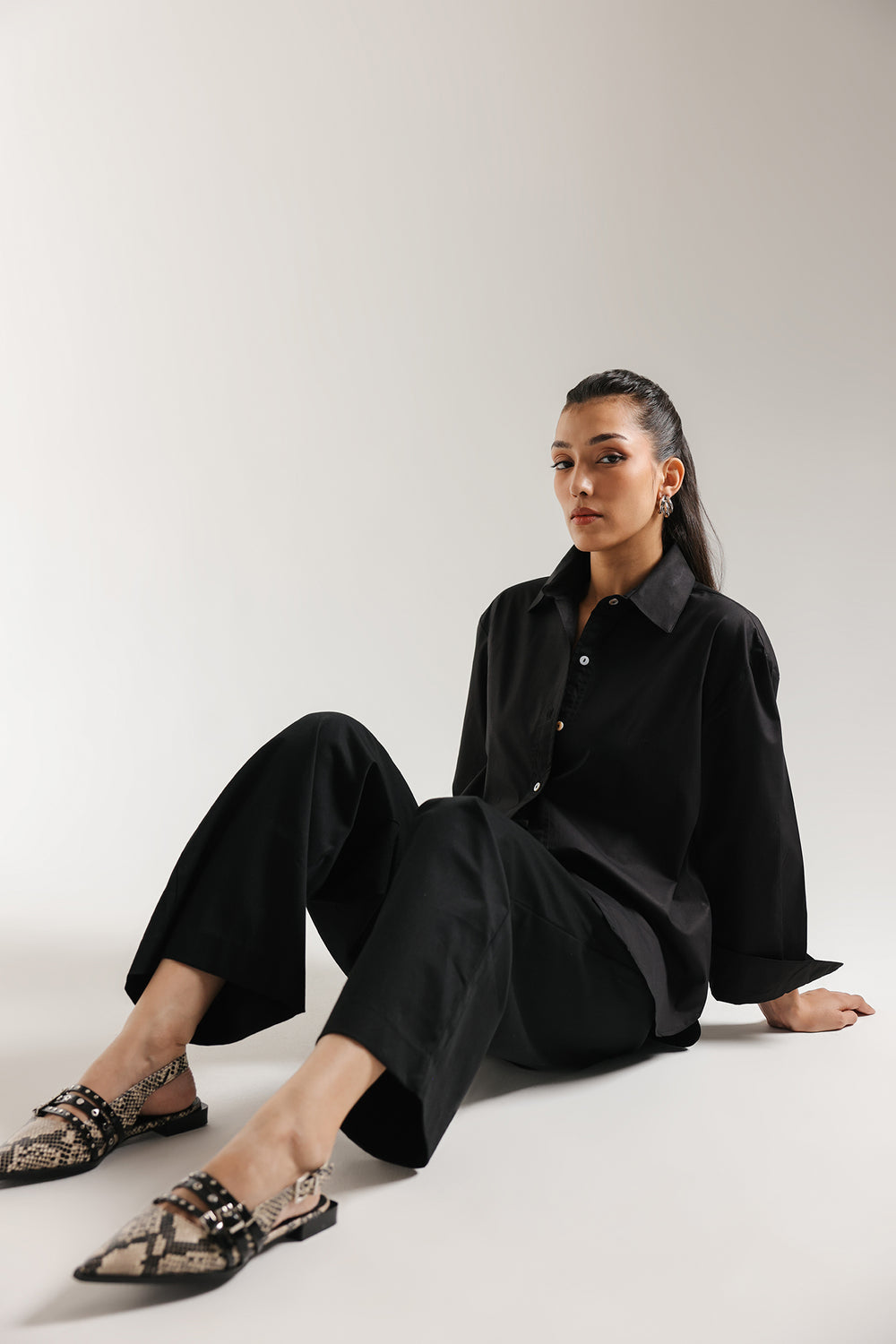 Command effortless power in this minimalist black shirt. The design maintains a classic button-down structure with a sharp collar and white buttons, while the relaxed fit introduces a modern, classy silhouette. Pair it with wide-leg trousers for a chic, contemporary look that transitions seamlessly from day to night.
