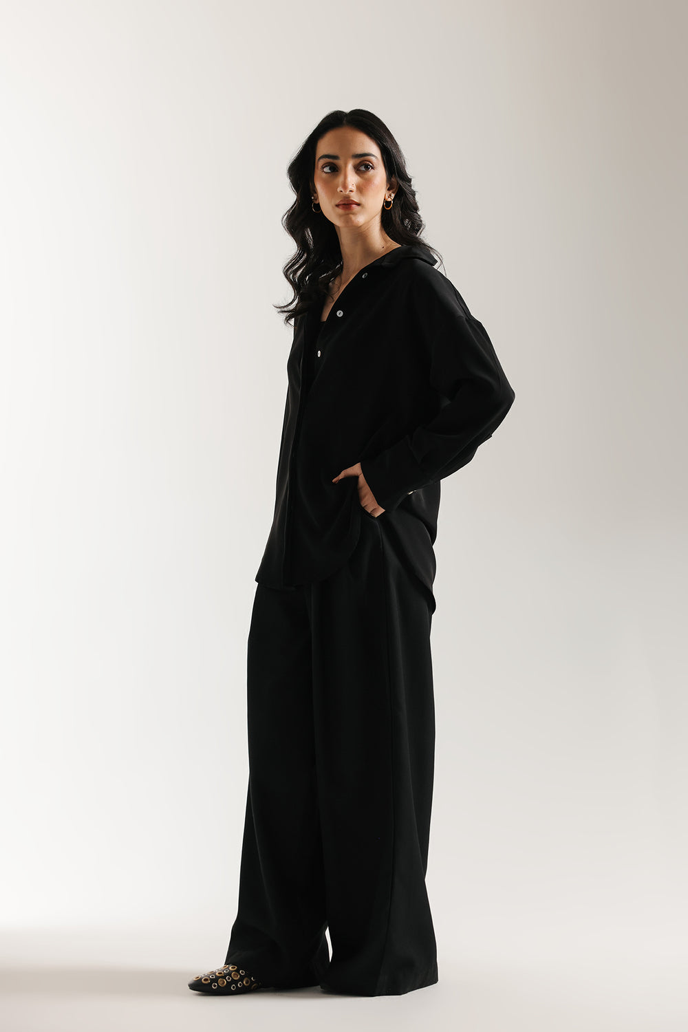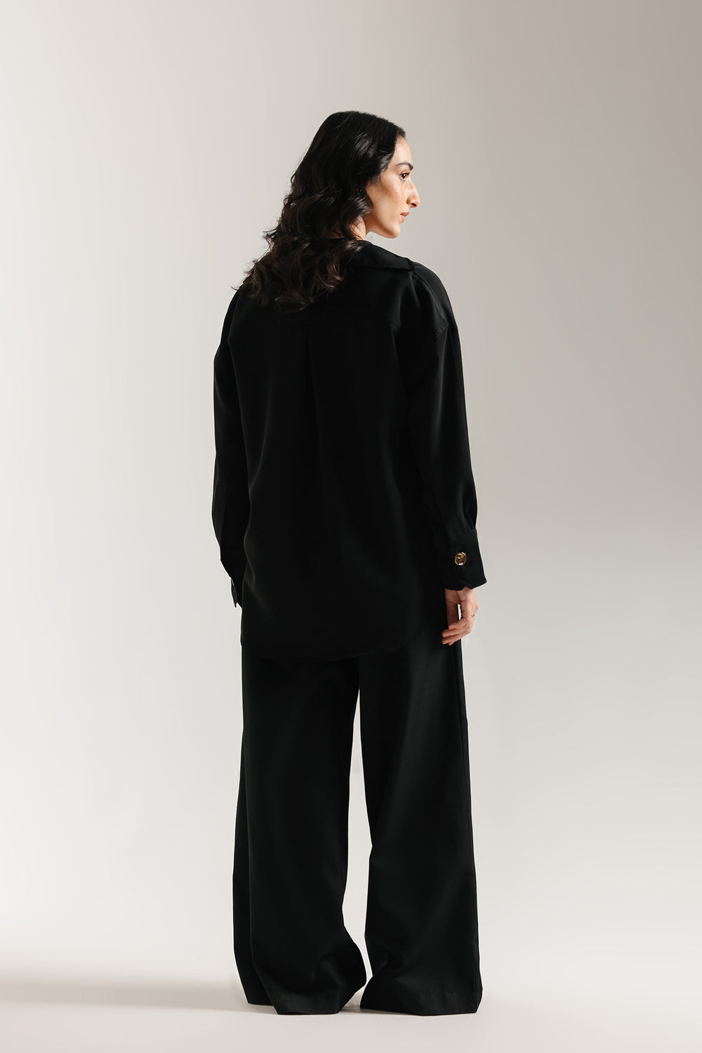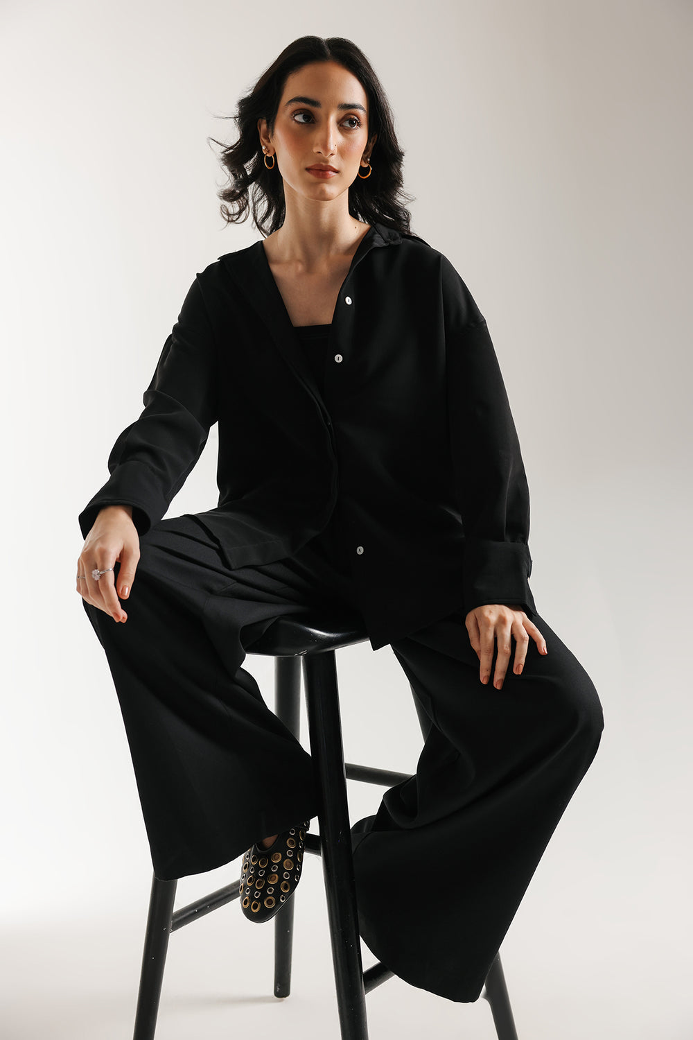 Immerse yourself in sleek, modern sophistication with this striking black shirt. This essential piece offers a relaxed fit, with a timeless button-down design and a classic collar, ensuring a chic drape, that defines contemporary elegance. This shirt is a versatile foundation for any elevated wardrobe.