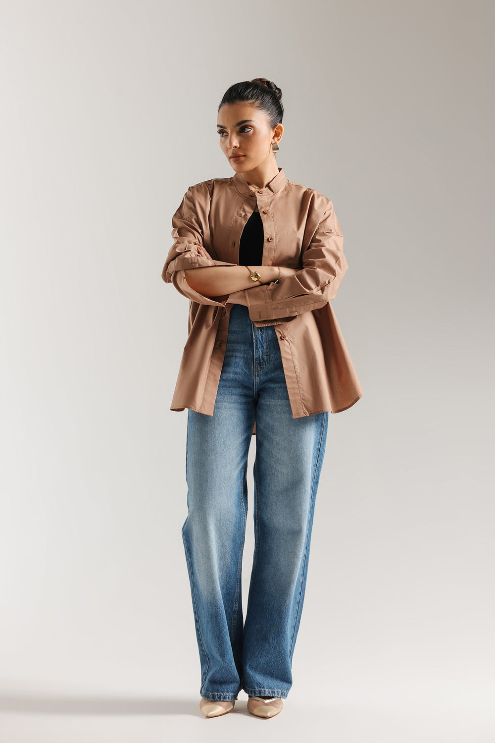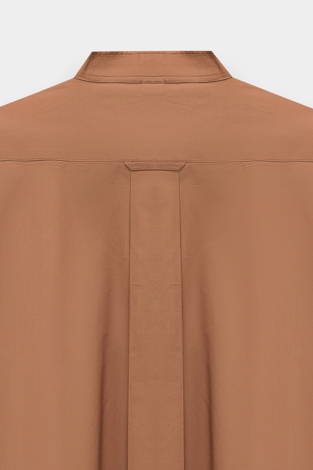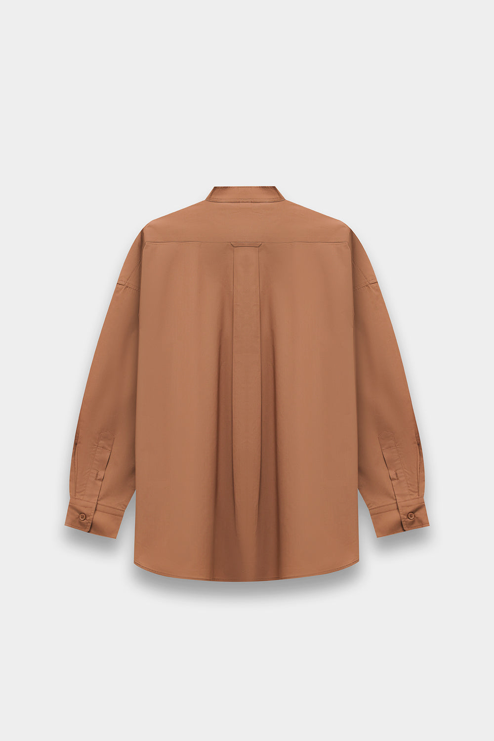This sophisticated button-down shirt in a rich, warm mocha hue is the perfect blend of contemporary structure and timeless versatility for the modern wardrobe. Crafted from premium fabric with a smooth, polished finish, the silhouette features a refined mandarin collar and a center placket that emphasizes its sleek, minimalist aesthetic.