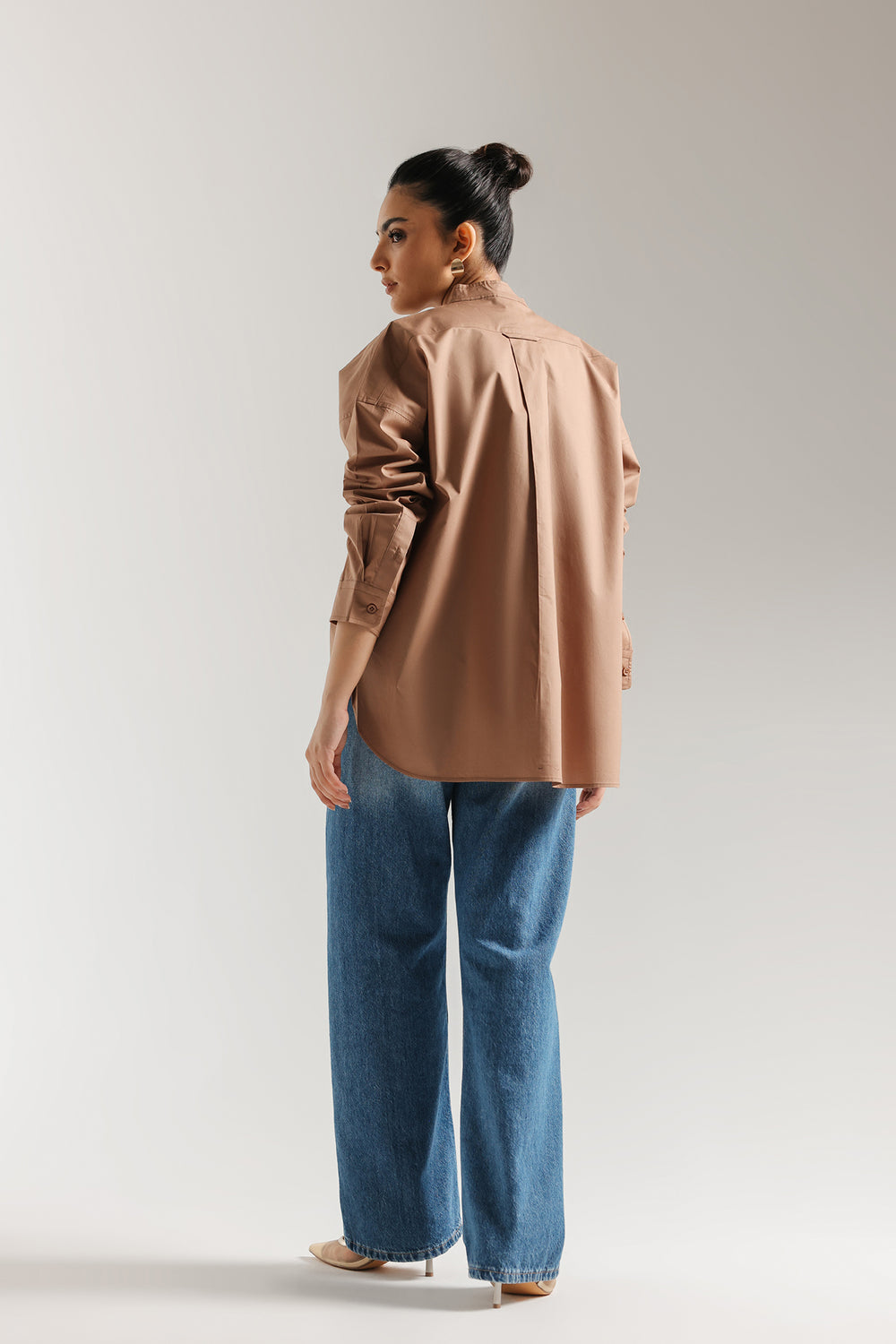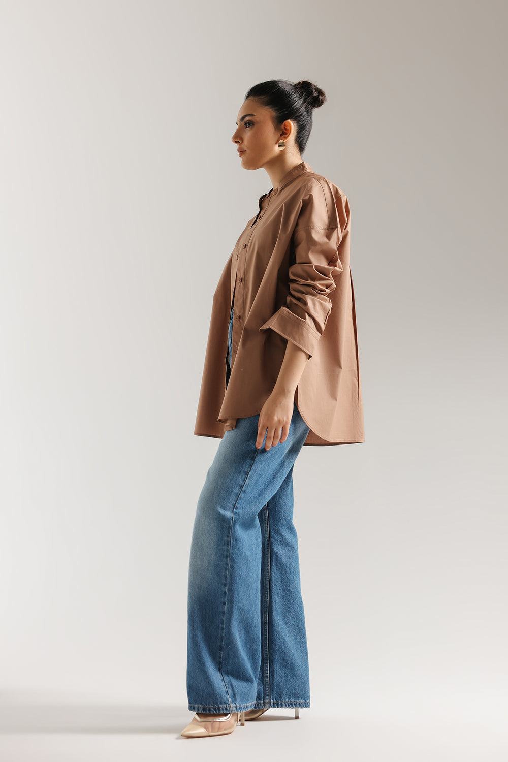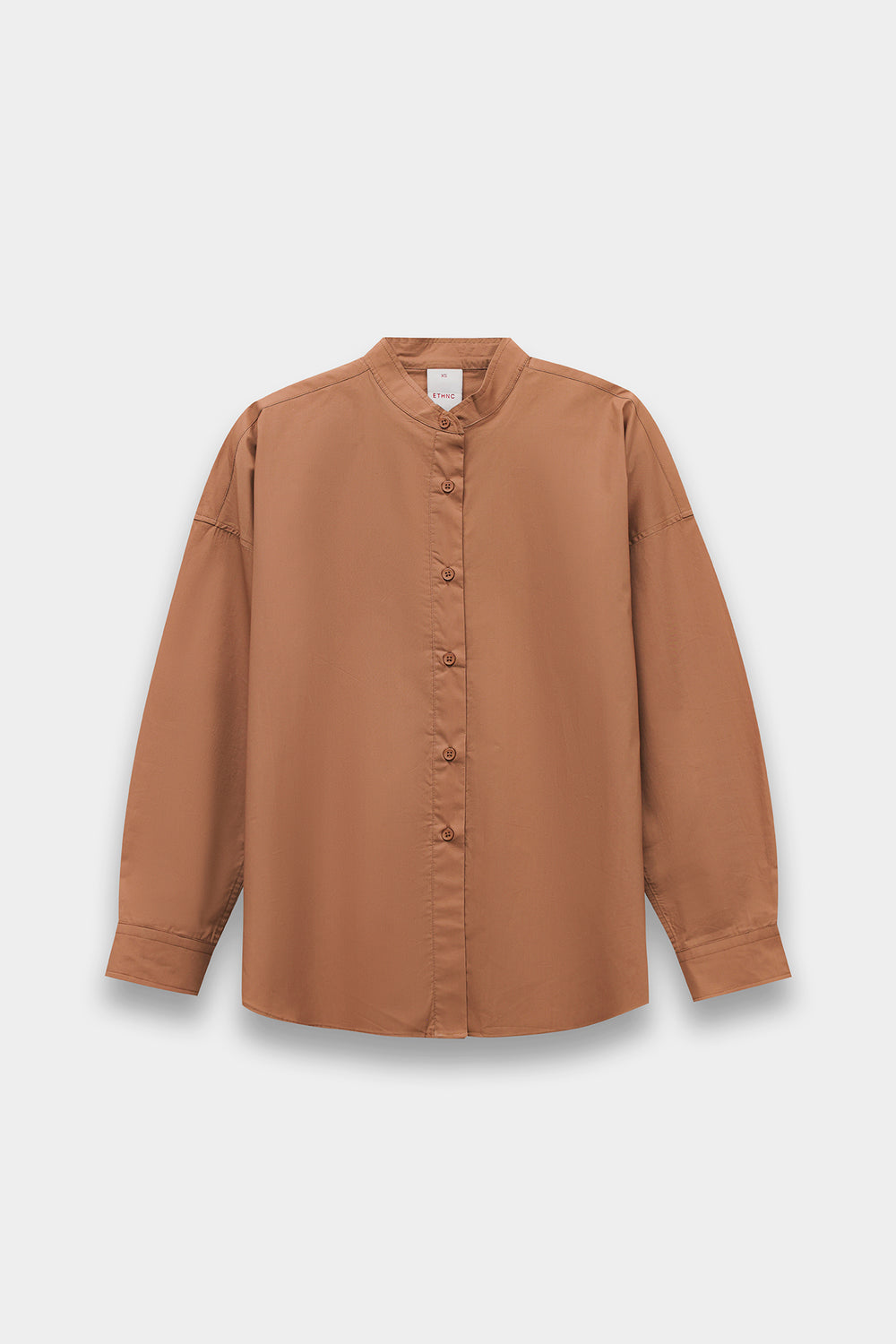 This sophisticated button-down shirt in a rich, warm mocha hue is the perfect blend of contemporary structure and timeless versatility for the modern wardrobe. Crafted from premium fabric with a smooth, polished finish, the silhouette features a refined mandarin collar and a center placket that emphasizes its sleek, minimalist aesthetic.