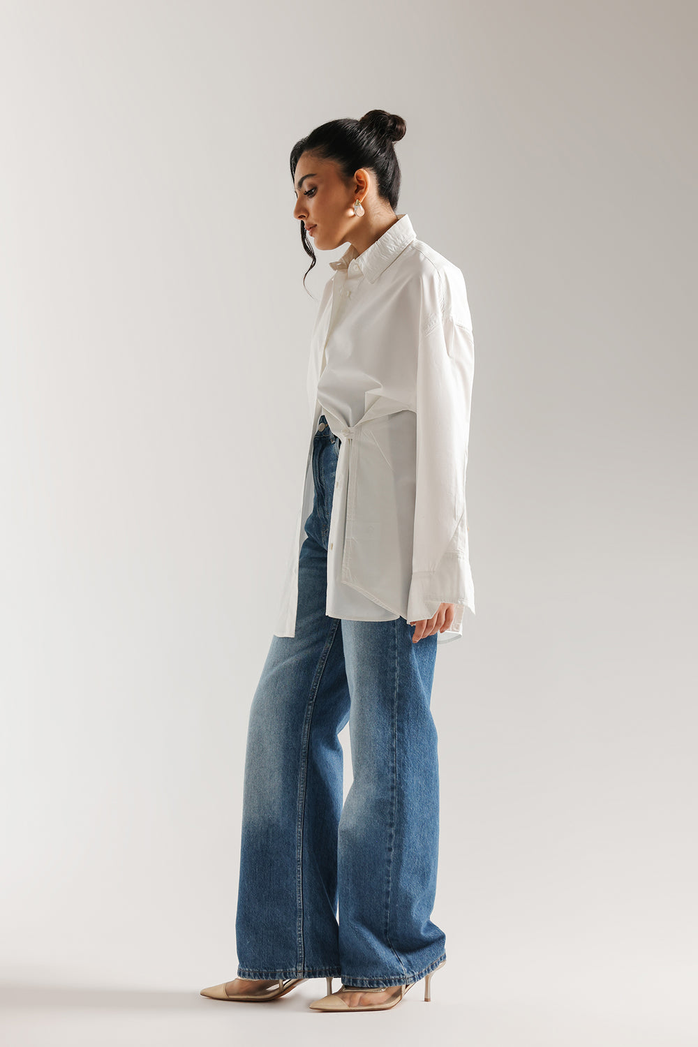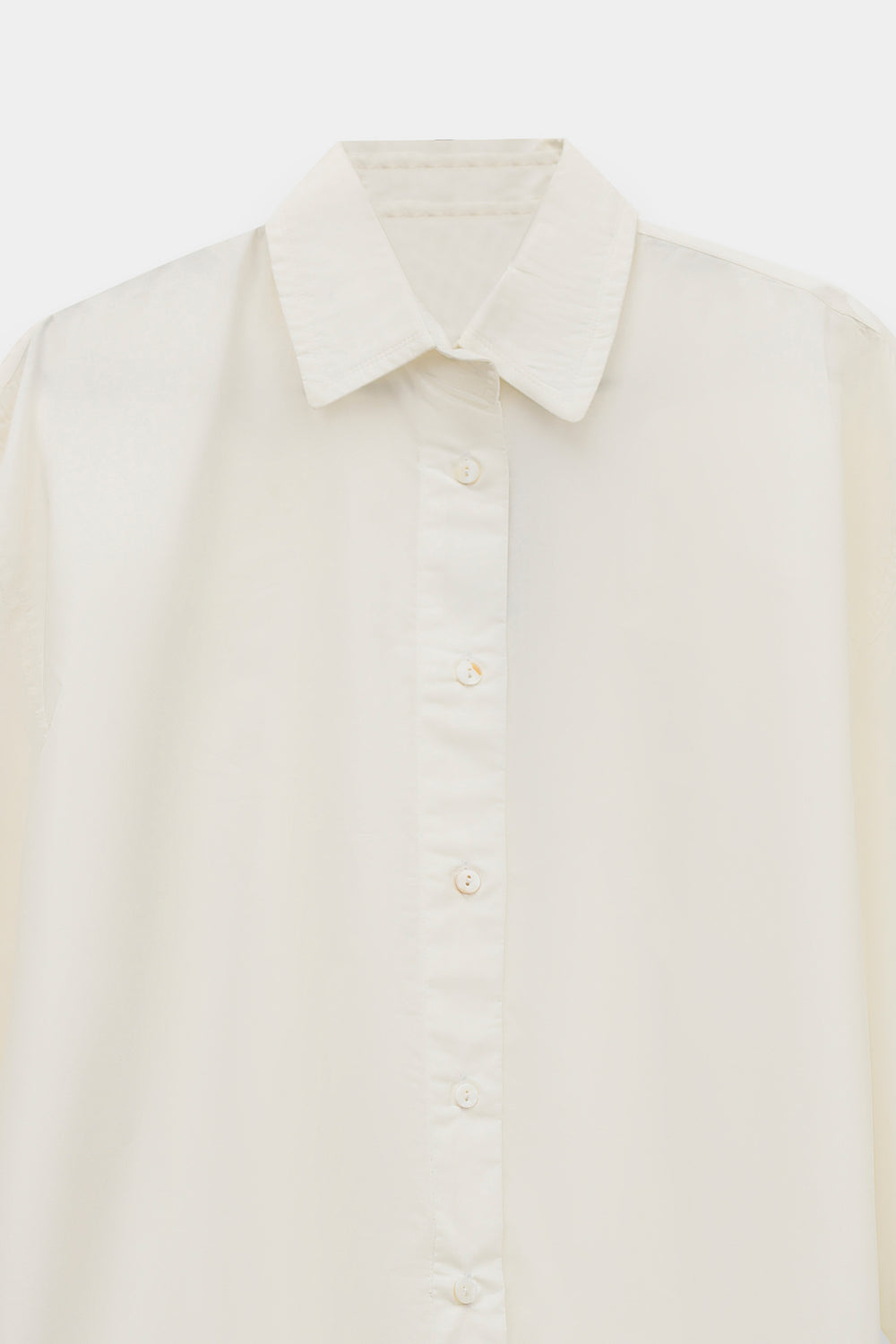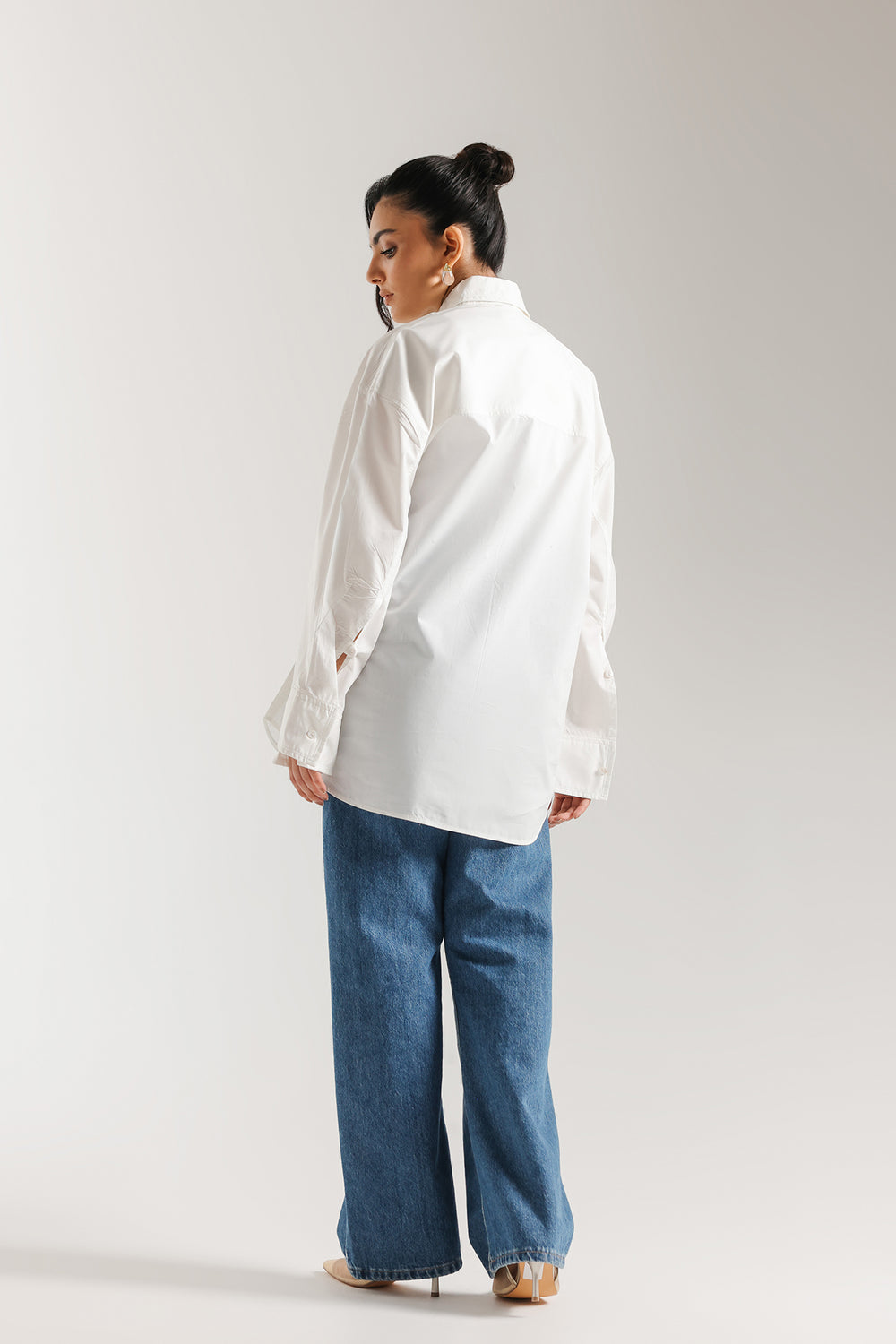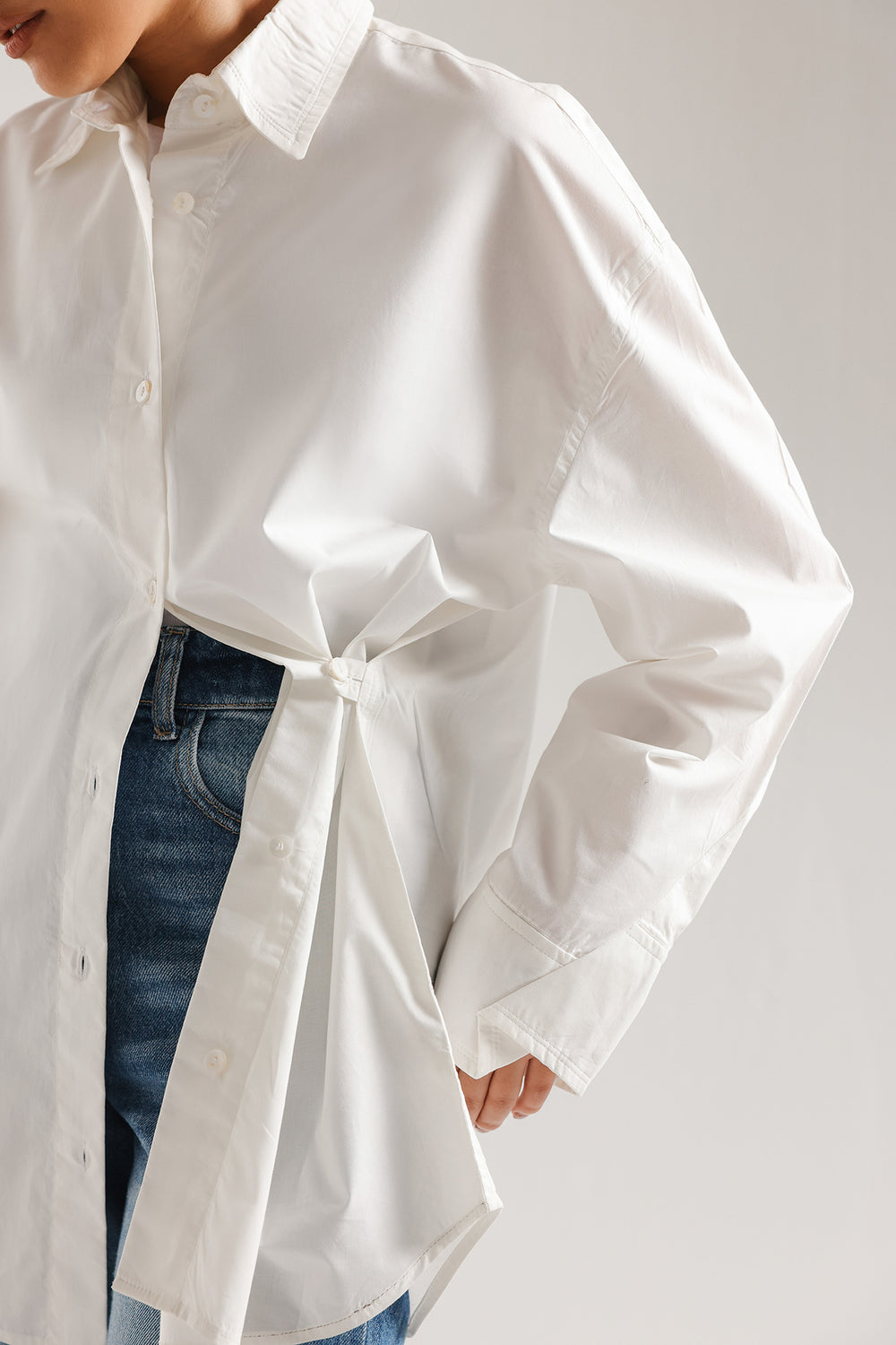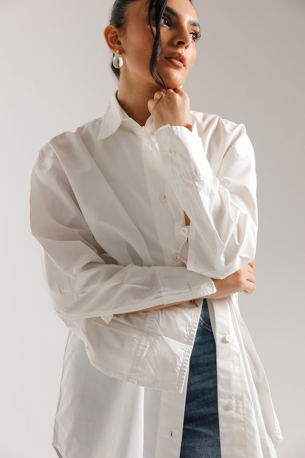 This crisp white button-down shirt is the epitome of effortless, modern sophistication, designed to be a timeless cornerstone of any high-end wardrobe. Crafted from premium cotton with a clean, polished finish, it features a structured oversized silhouette with dropped shoulders and an elongated hem that creates a graceful, contemporary drape. The design is elevated by a sharp pointed collar and wide, structured cuffs with delicate tonal stitching, offering versatile styling options that transition seamlessly from professional polished looks to relaxed, chic ensembles. Whether paired with wide-leg denim for a casual daytime vibe or layered under a tailored vest, this shirt provides a bright, minimalist canvas that exudes understated luxury.