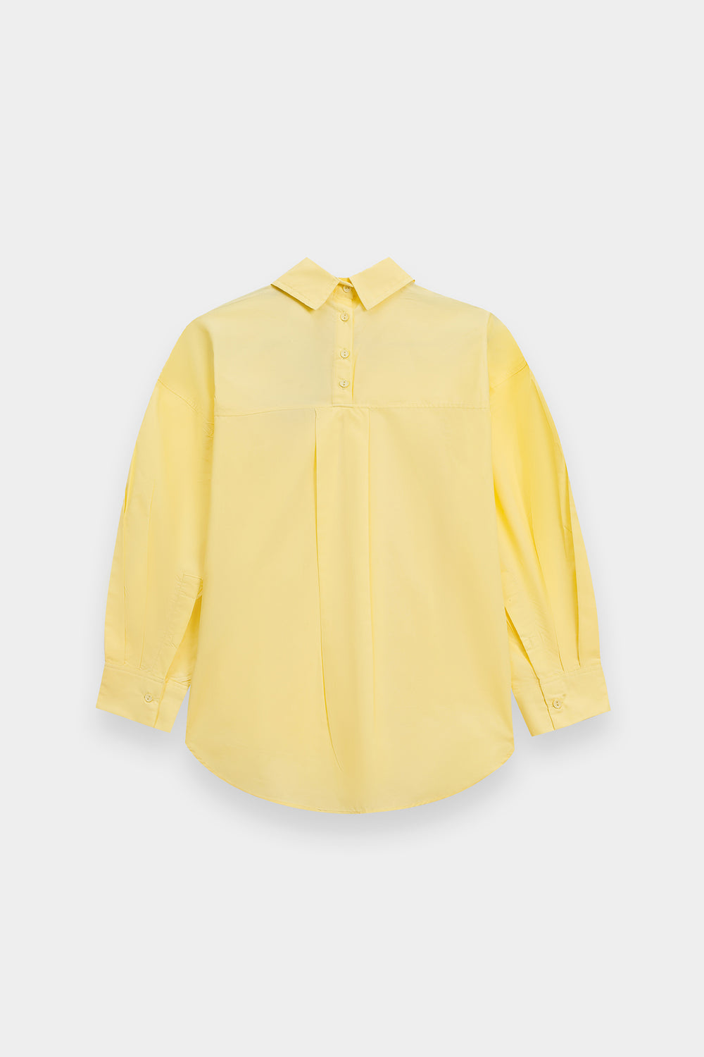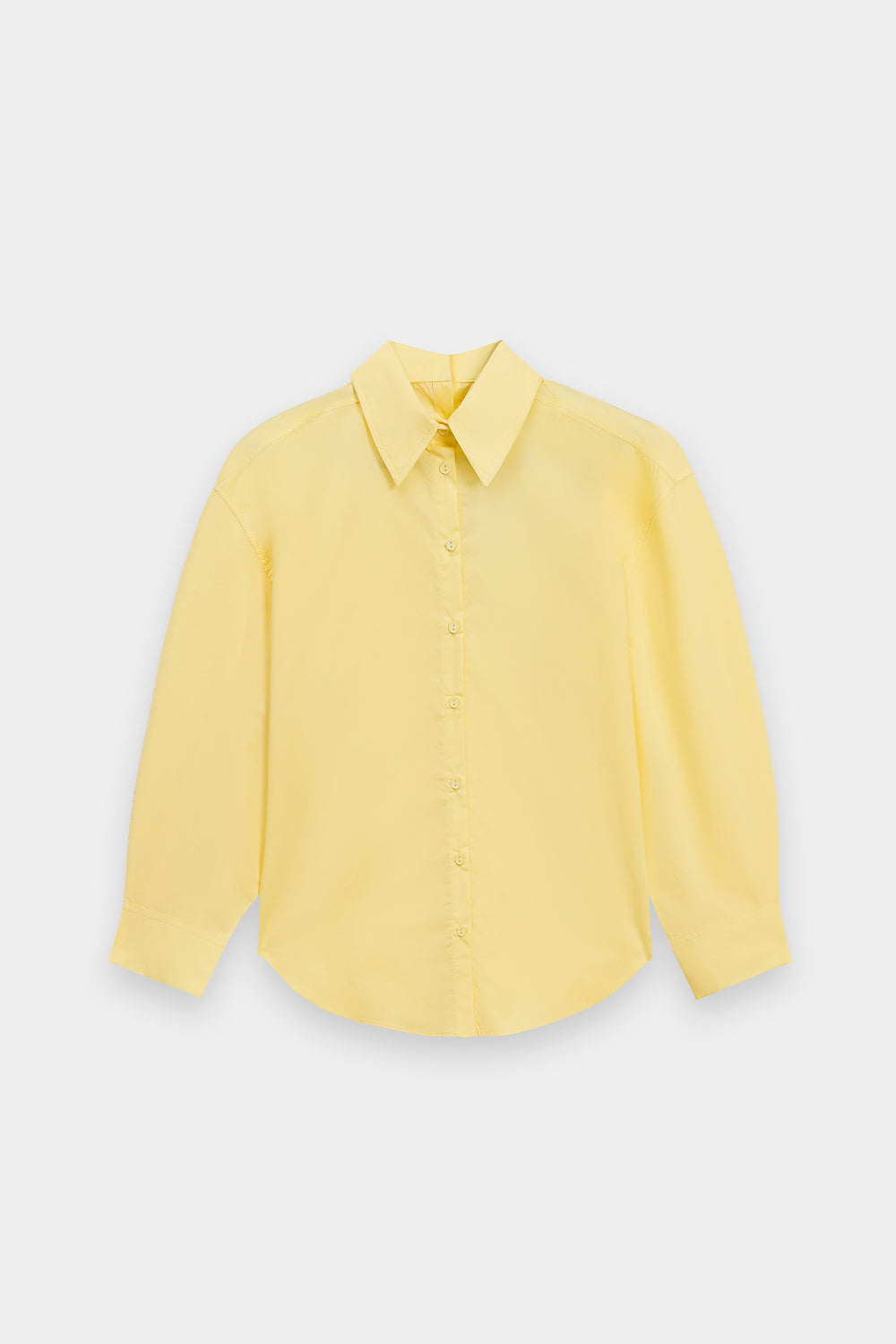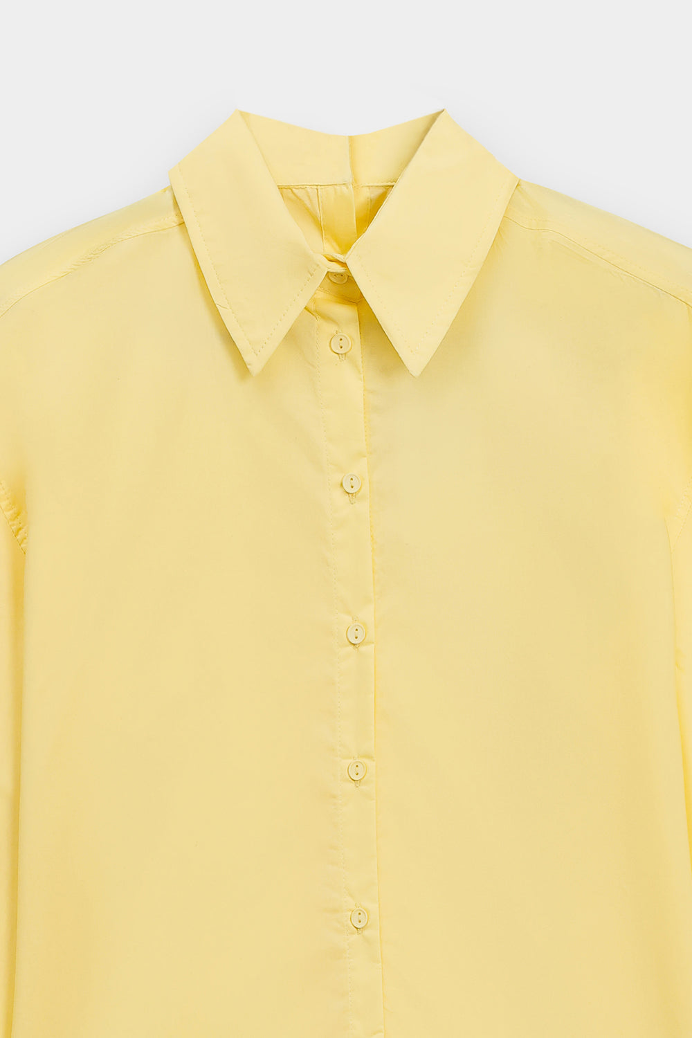 This yellow beige button-down shirt is a masterclass in effortless, high-end minimalism, serving as a versatile cornerstone for the modern wardrobe. Crafted from premium fabric with a crisp, structured finish, the design features a sophisticated oversized silhouette with dropped shoulders and a graceful curved hemline that offers a contemporary drape. The classic pointed collar and clean front button placket are complemented by wide, structured cuffs with delicate tonal stitching, providing a polished look that transitions seamlessly from professional settings to relaxed, chic outings. Whether paired with an embroidered maxi skirt for an ethereal monochromatic ensemble or styled with casual denim, this shirt provides a bright, elevated canvas that exudes understated luxury and timeless style.