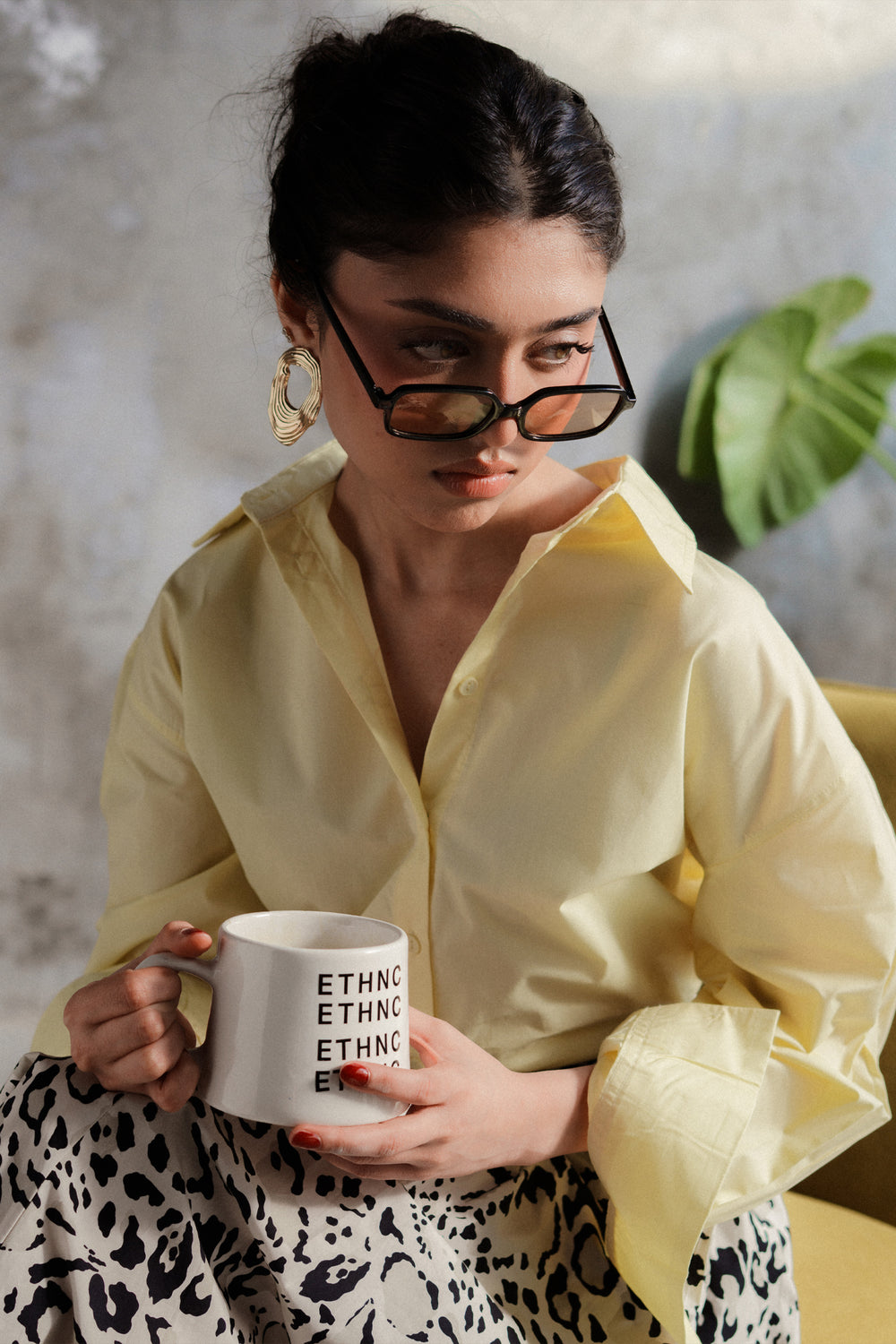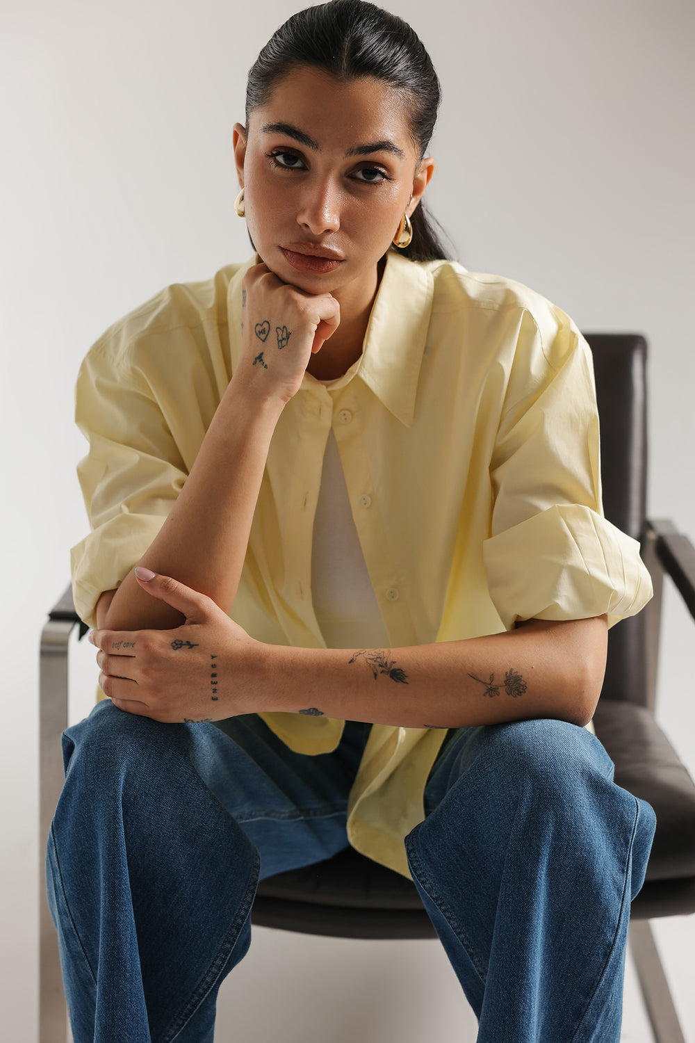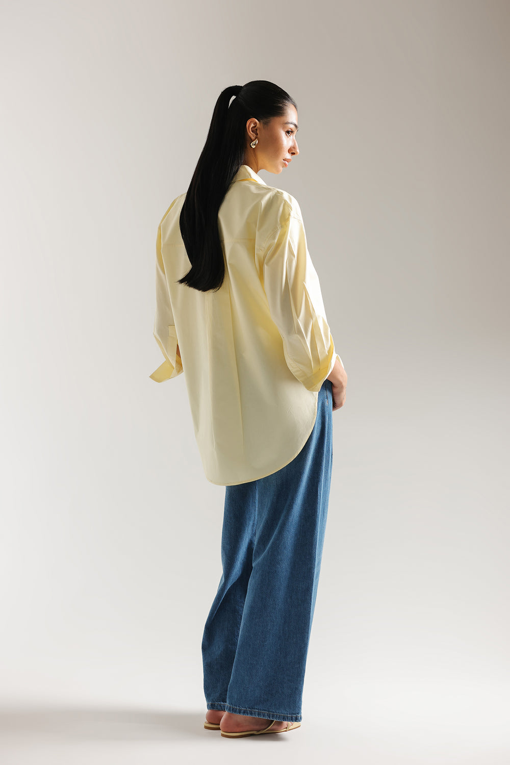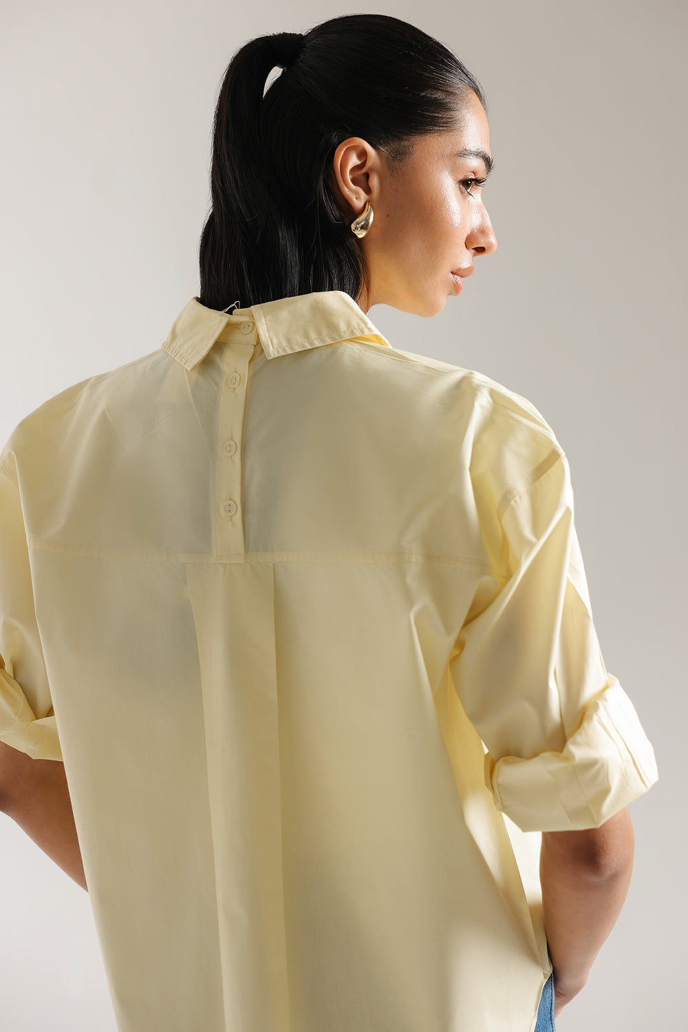 This yellow beige button-down shirt is a masterclass in effortless, high-end minimalism, serving as a versatile cornerstone for the modern wardrobe. Crafted from premium fabric with a crisp, structured finish, the design features a sophisticated oversized silhouette with dropped shoulders and a graceful curved hemline that offers a contemporary drape. The classic pointed collar and clean front button placket are complemented by wide, structured cuffs with delicate tonal stitching, providing a polished look that transitions seamlessly from professional settings to relaxed, chic outings. Whether paired with an embroidered maxi skirt for an ethereal monochromatic ensemble or styled with casual denim, this shirt provides a bright, elevated canvas that exudes understated luxury and timeless style.