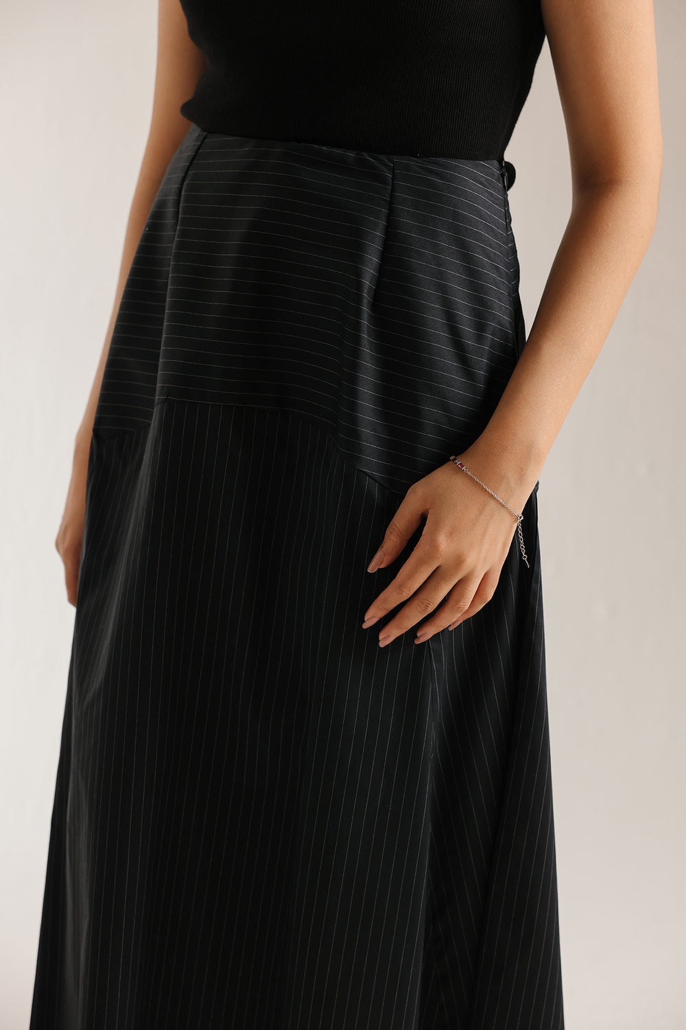 This sophisticated black skirt embodies refined elegance through meticulously considered design. The classic A-line silhouette flatters effortlessly, while delicate pleats details add intricate visual interest. Illustrating a trendy pin stripe pattern all over, the flowing length of the skirt moves gracefully with every step, making it ideal for evening occasions. A masterful blend of timeless silhouette and contemporary design, this skirt appeals to discerning individuals who value both sophistication and distinctive style.