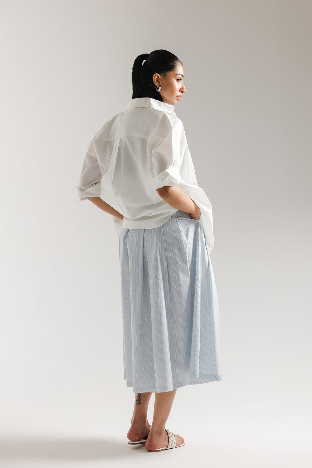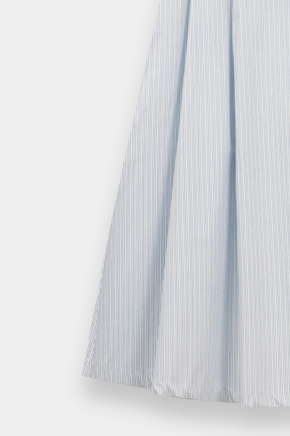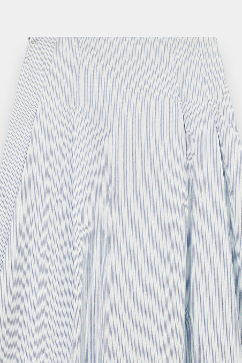 Infuse your seasonal wardrobe with a breath of fresh air in this light blue and white striped skirt. This midi-length piece features a clean, A-line silhouette with classic vertical stripes that create an elongated and polished look. Crafted from a crisp, lightweight fabric, it offers a comfortable fit that transitions effortlessly from a relaxed seaside brunch to a sophisticated afternoon in the city.