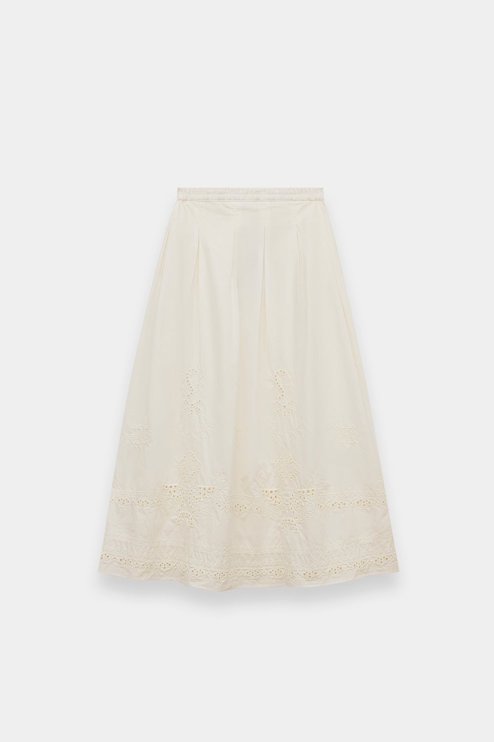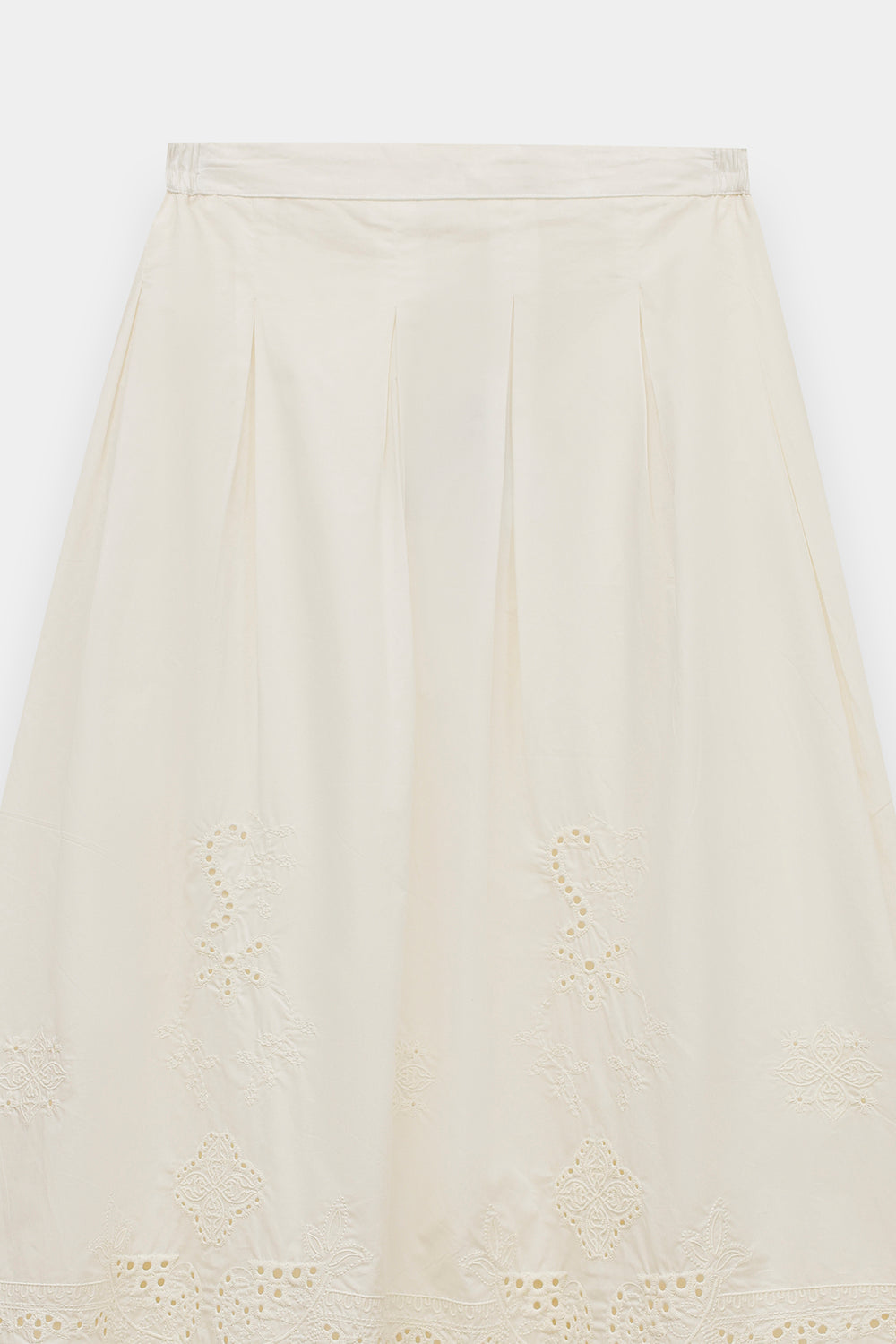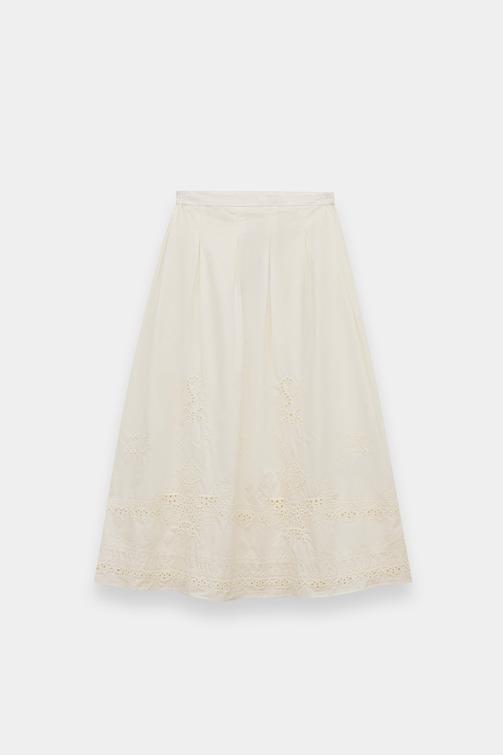 This pristine white skirt is a masterpiece of ethereal grace and meticulous craftsmanship, designed for those who appreciate the beauty of understated luxury. The floor-sweeping silhouette is crafted from a lightweight fabric that offers a fluid, airy drape, ensuring elegance with every step. Its serene ivory canvas is elevated by intricate tone-on-tone embroidery and delicate eyelet detailing that adorns the lower panels, creating a rich, artisanal texture. Featuring a voluminous A-line cut that provides both comfort and a regal presence, this skirt serves as a versatile statement piece. Whether paired with a crisp button-down for a modern, monochromatic look or a more ornate top for a festive occasion, this skirt is a timeless addition to any sophisticated wardrobe.