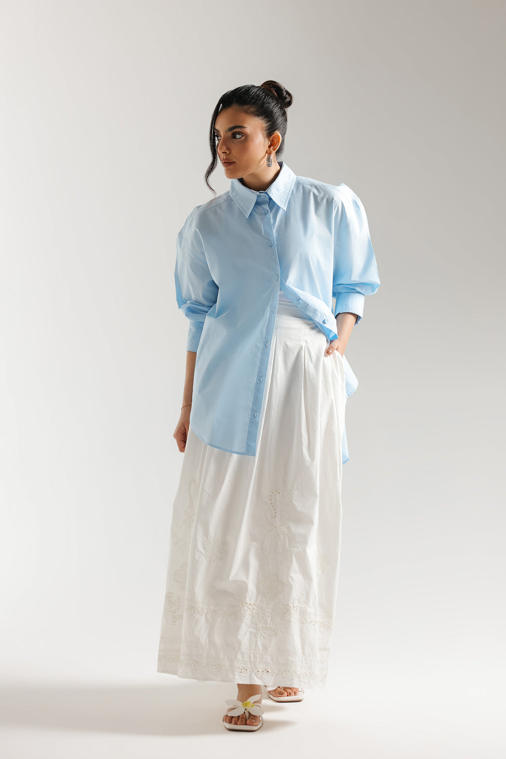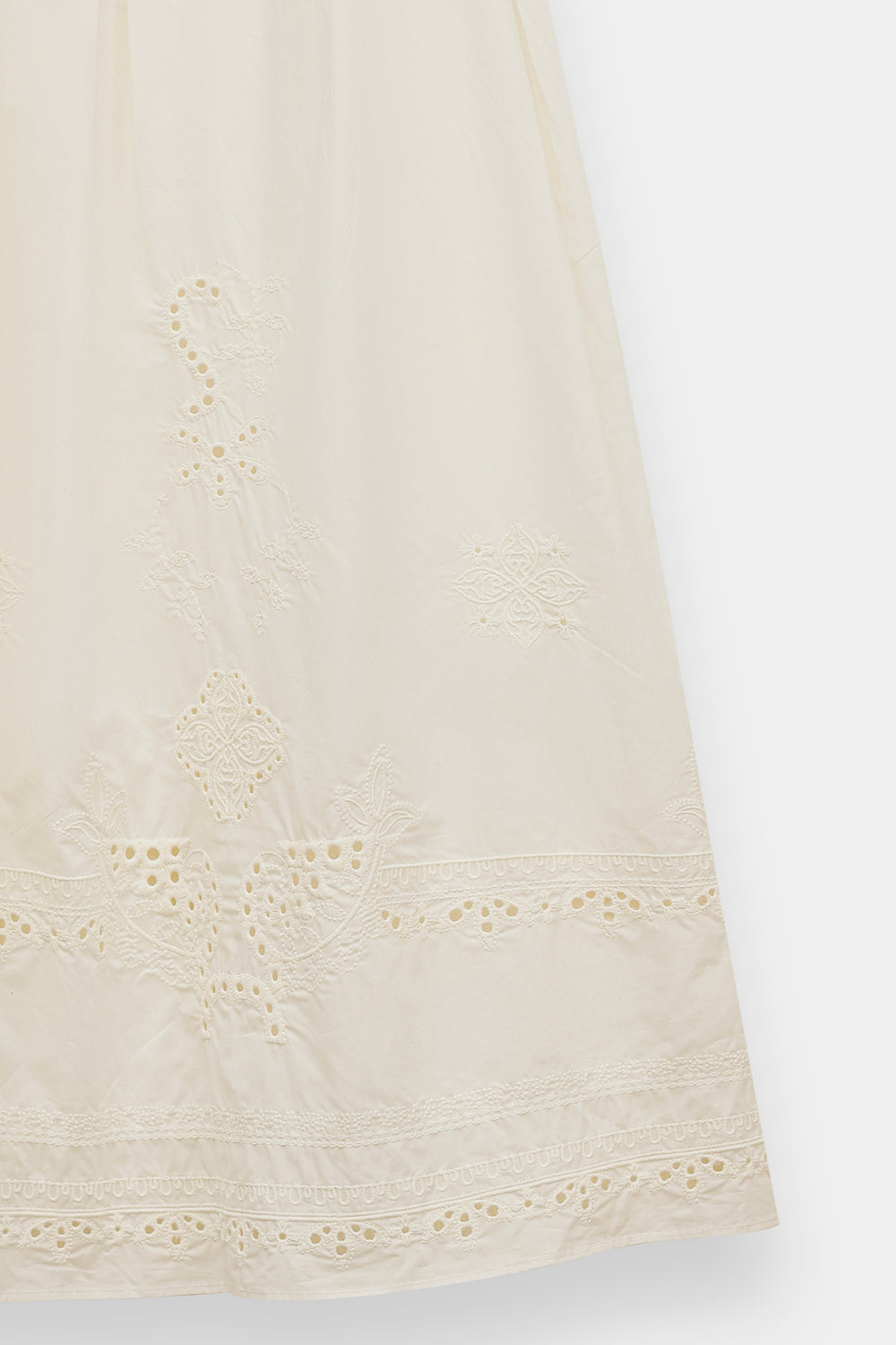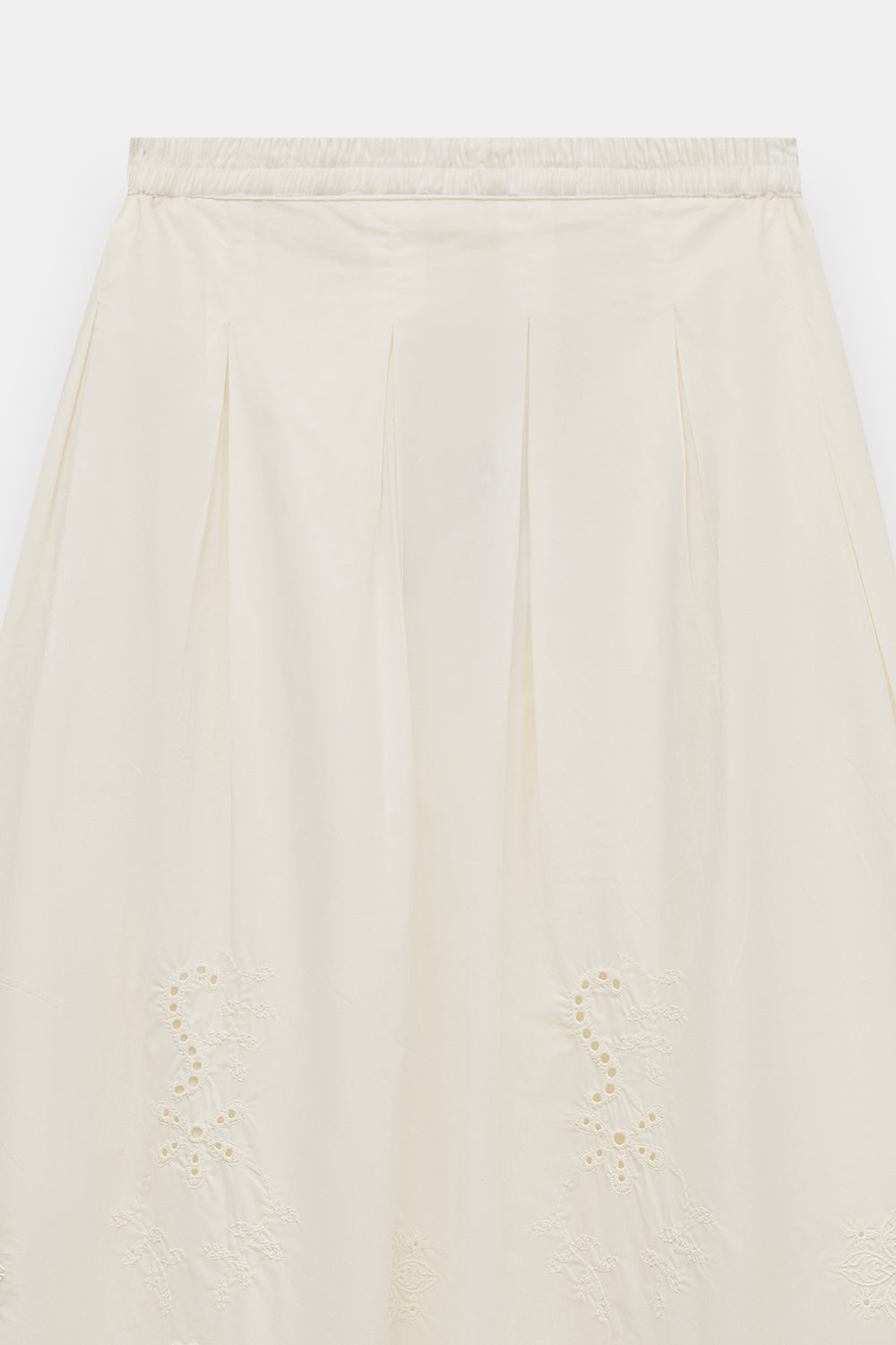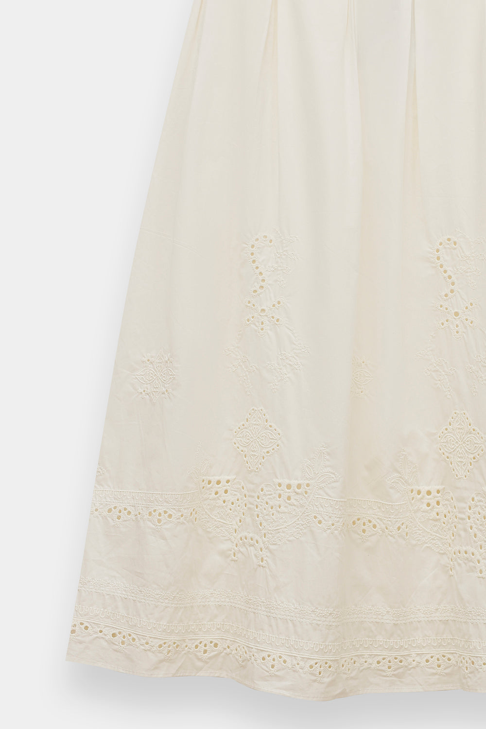 This pristine white skirt is a masterpiece of ethereal grace and meticulous craftsmanship, designed for those who appreciate the beauty of understated luxury. The floor-sweeping silhouette is crafted from a lightweight fabric that offers a fluid, airy drape, ensuring elegance with every step. Its serene ivory canvas is elevated by intricate tone-on-tone embroidery and delicate eyelet detailing that adorns the lower panels, creating a rich, artisanal texture. Featuring a voluminous A-line cut that provides both comfort and a regal presence, this skirt serves as a versatile statement piece. Whether paired with a crisp button-down for a modern, monochromatic look or a more ornate top for a festive occasion, this skirt is a timeless addition to any sophisticated wardrobe.