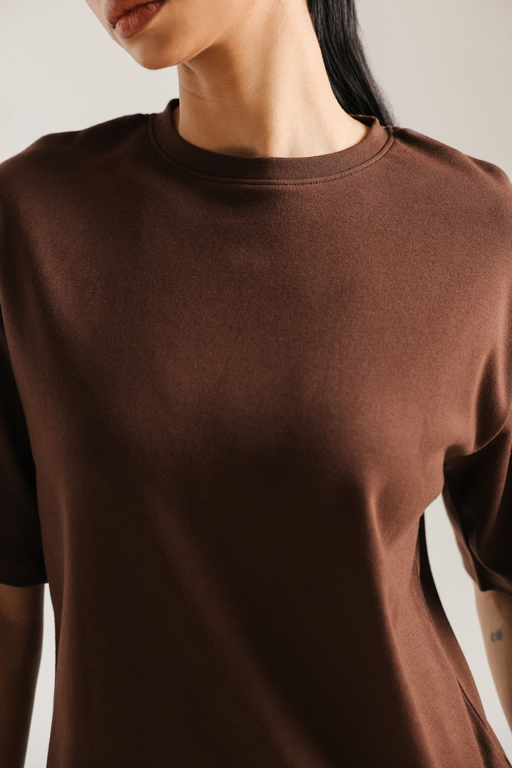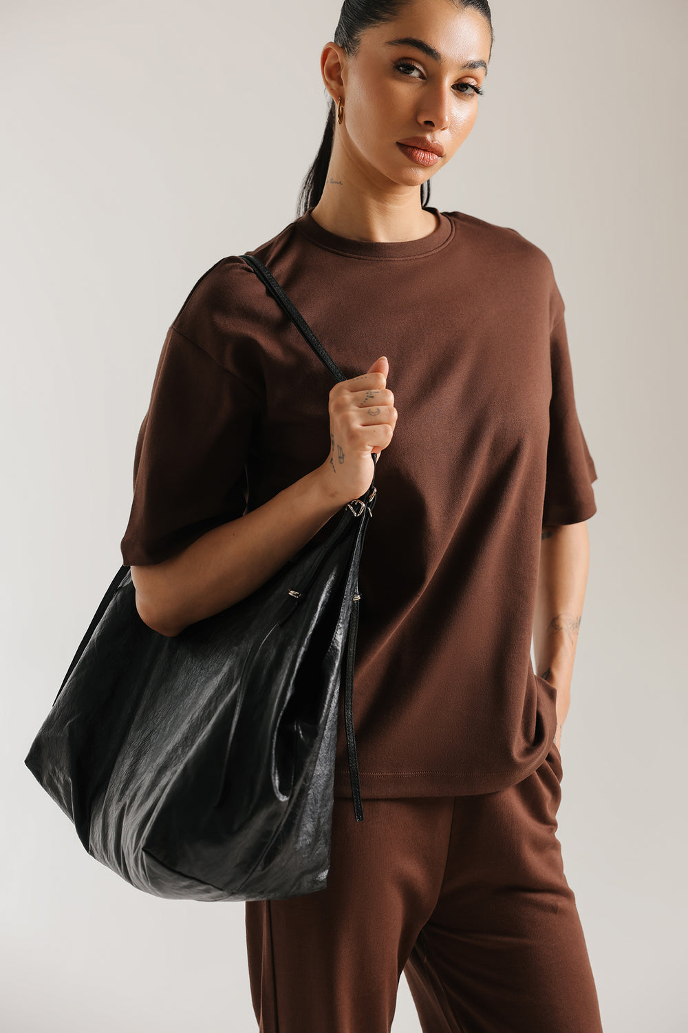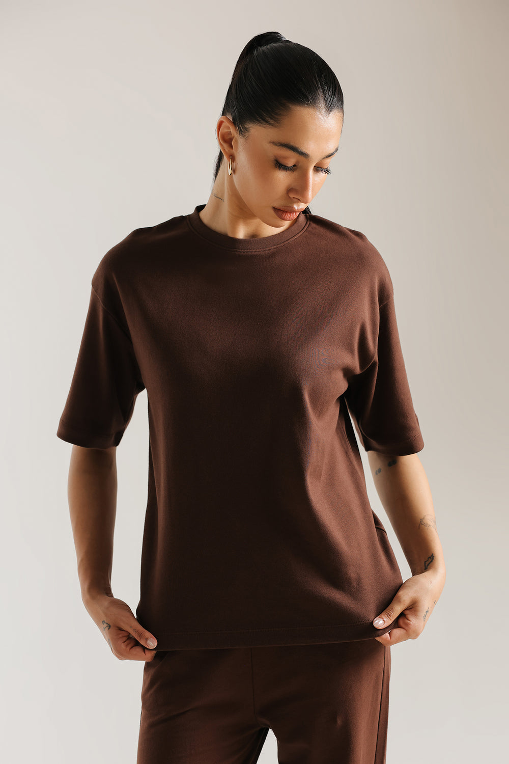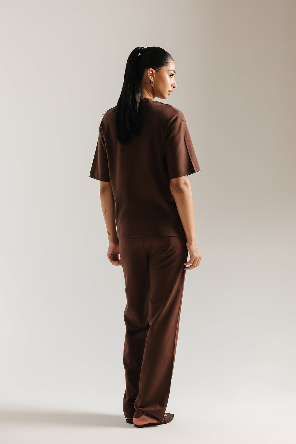 Elevate your everyday style with this rich grey co-ord suit. The ensemble features a relaxed, short-sleeved T shirt with a clean crew neckline and a subtle structural drape. Paired with coordinating straight loose fit trouser, this two-piece set offers a sophisticated, monochromatic look that seamlessly blends comfort with contemporary flair.