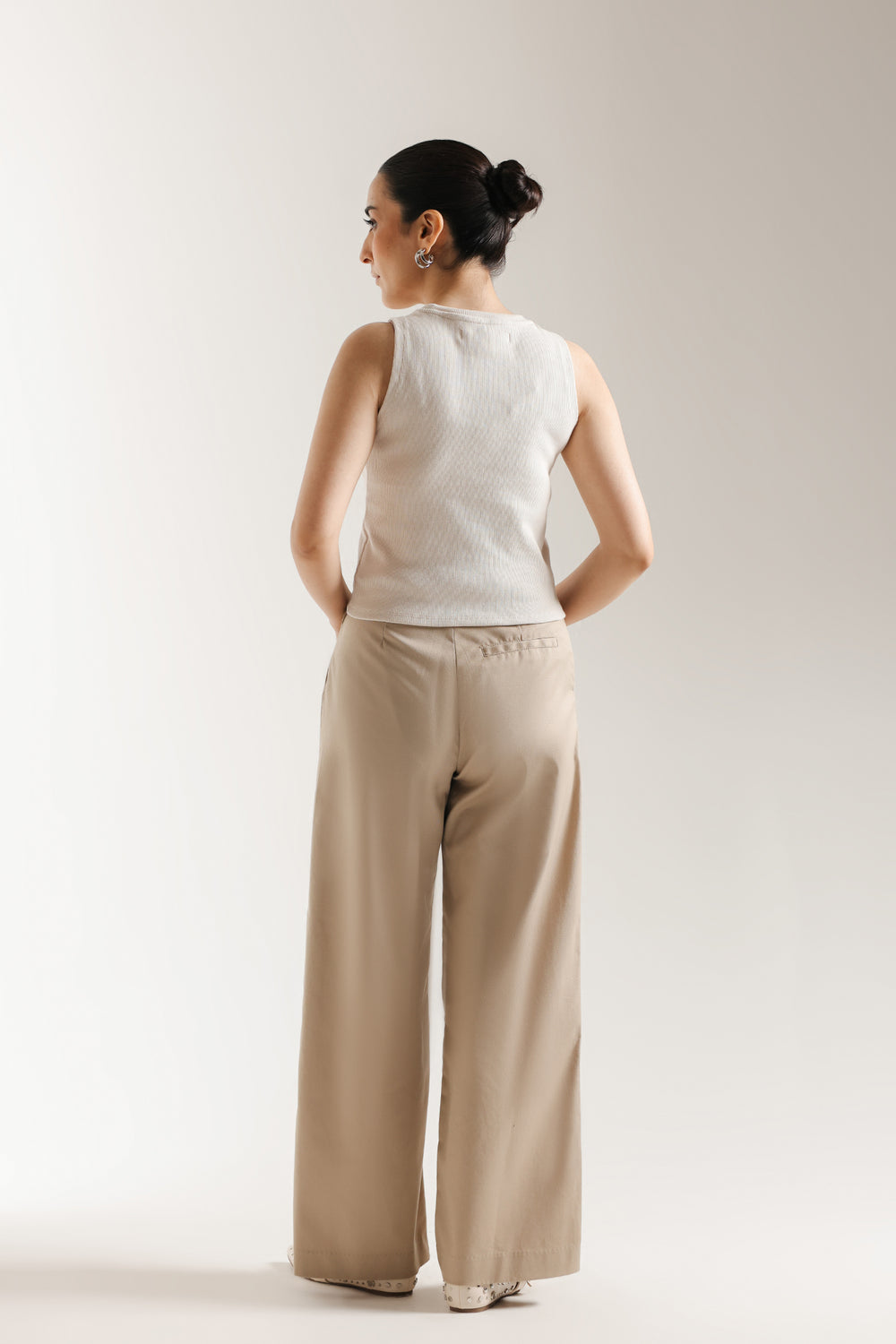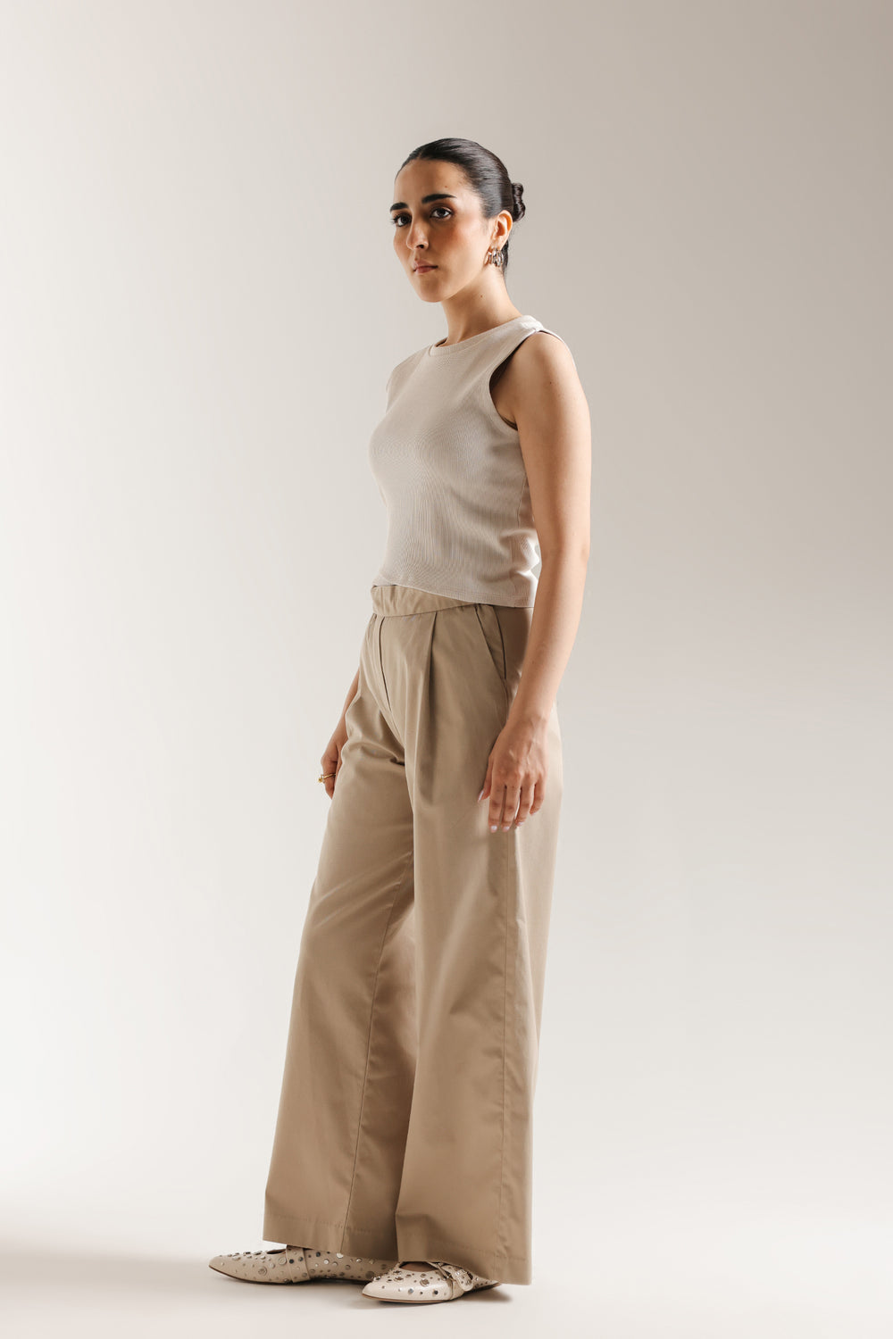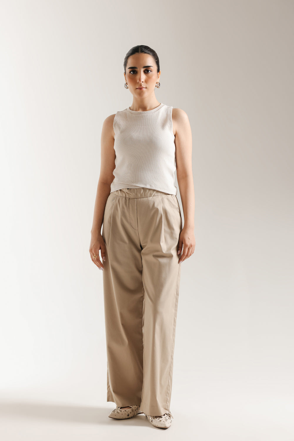Embrace effortless simplicity with this essential ribbed knit tank top. Crafted in a versatile soft beige hue, this top is the perfect foundation for any modern wardrobe. The design features a comfortable round neckline and a sleeveless cut, made from a subtly textured, ribbed knit fabric that offers a flattering, close fit. Its minimalist aesthetic makes it incredibly easy to dress up or down, whether paired with tailored trousers, as shown, or casual denim. It's a timeless staple for understated, chic style.