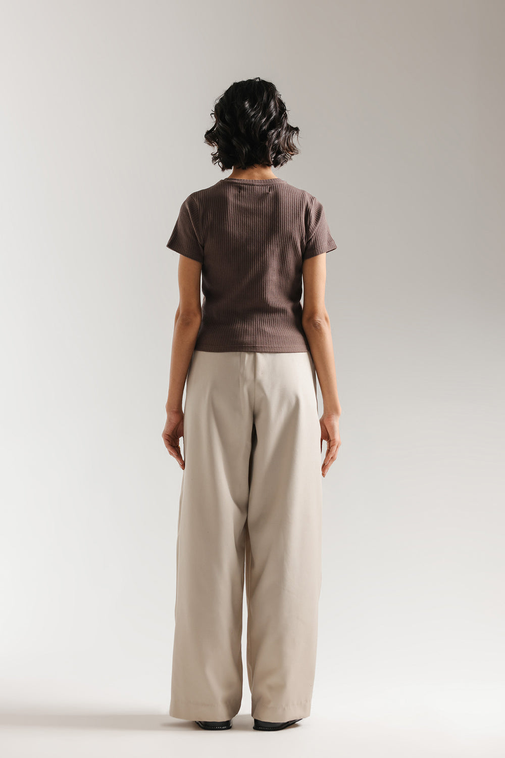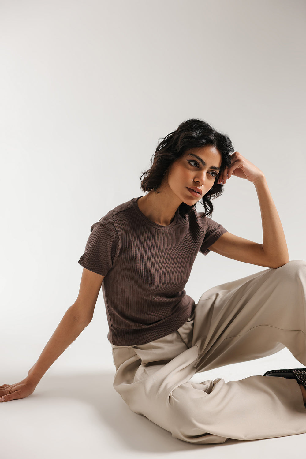 Redefine your essentials with this sleek and versatile chocolate brown T-shirt. A modern take on a classic staple, this short-sleeved top features a flattering fitted silhouette that perfectly contours the body. With its clean crew neckline, this t-shirt is the perfect foundational piece for building effortless looks, easily transitioning from day to night. It pairs flawlessly tucked into wide-leg denim for a chic, contemporary ensemble.