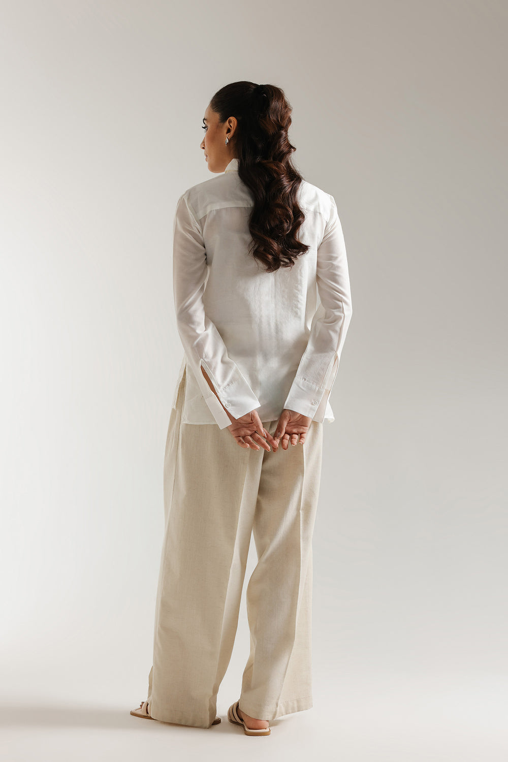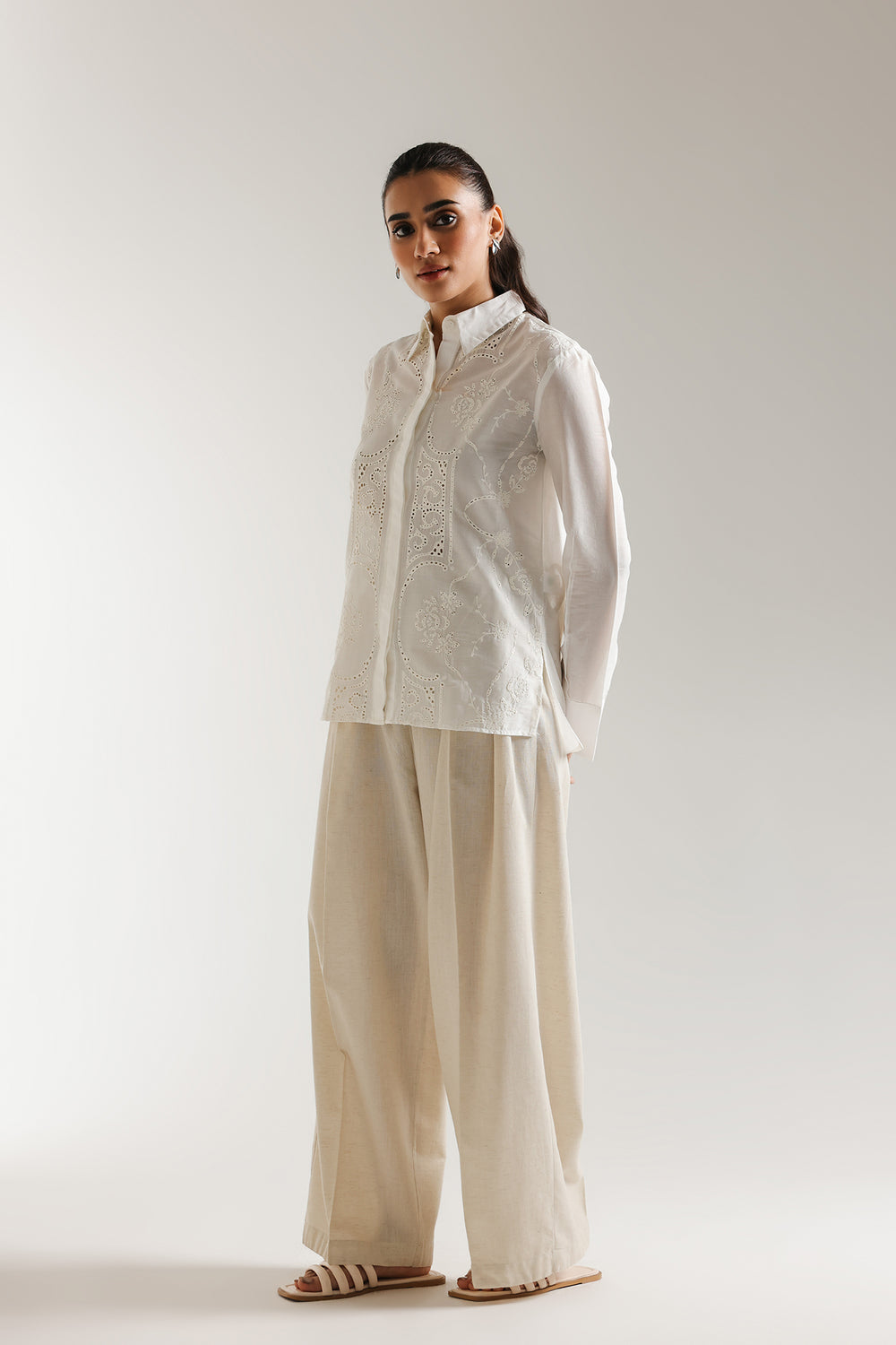 Elevate your everyday look with this chic white shirt. The subtle yet eye-catching pattern on its classic button-down silhouette adds a touch of texture and visual interest, offering versatile styling options. Pair it with relaxed-fit denim jeans or a wide leg trouser for a laid-back aesthetic that's both stylish and comfortable.