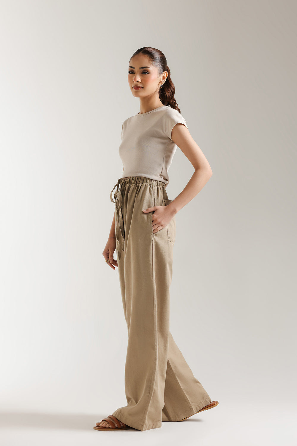 Elevate your everyday style with these effortlessly chic brown trousers. Cut in a wide-leg silhouette, they offer a relaxed yet sophisticated look. The high-waisted design features a comfortable drawstring closure for an adjustable fit. Perfect for pairing with a tucked-in tee or a flowy blouse, these trousers are a versatile addition to any wardrobe.