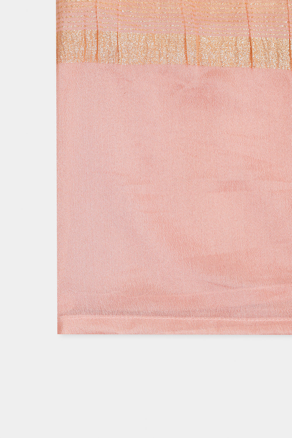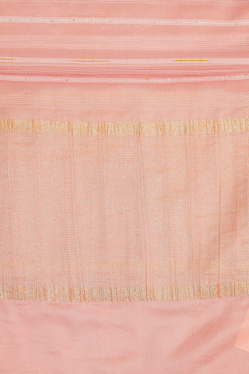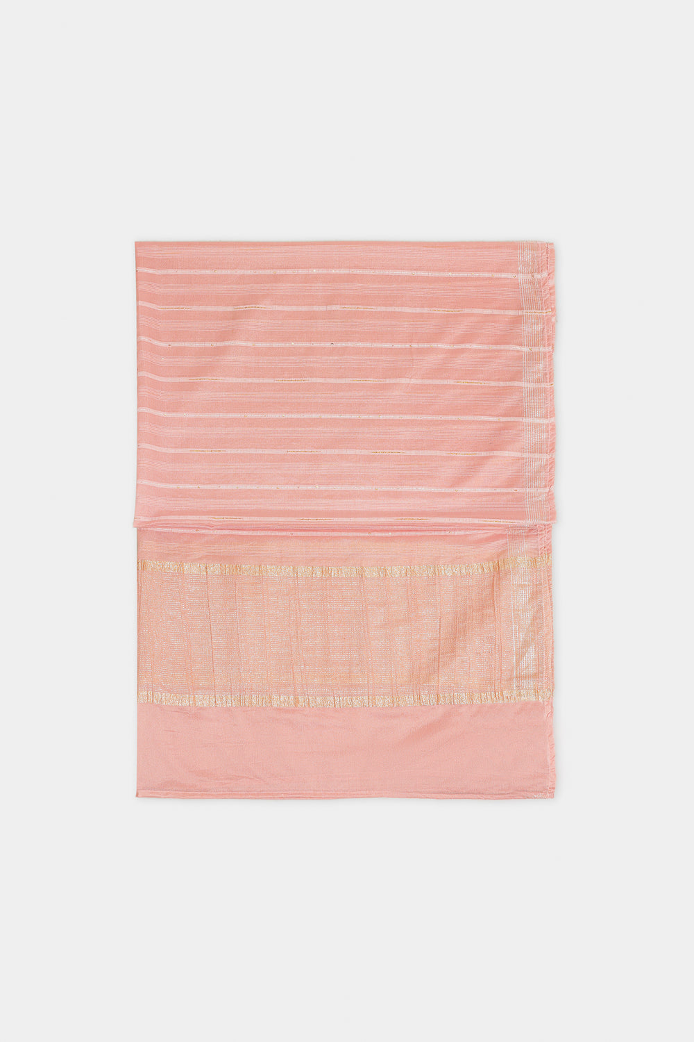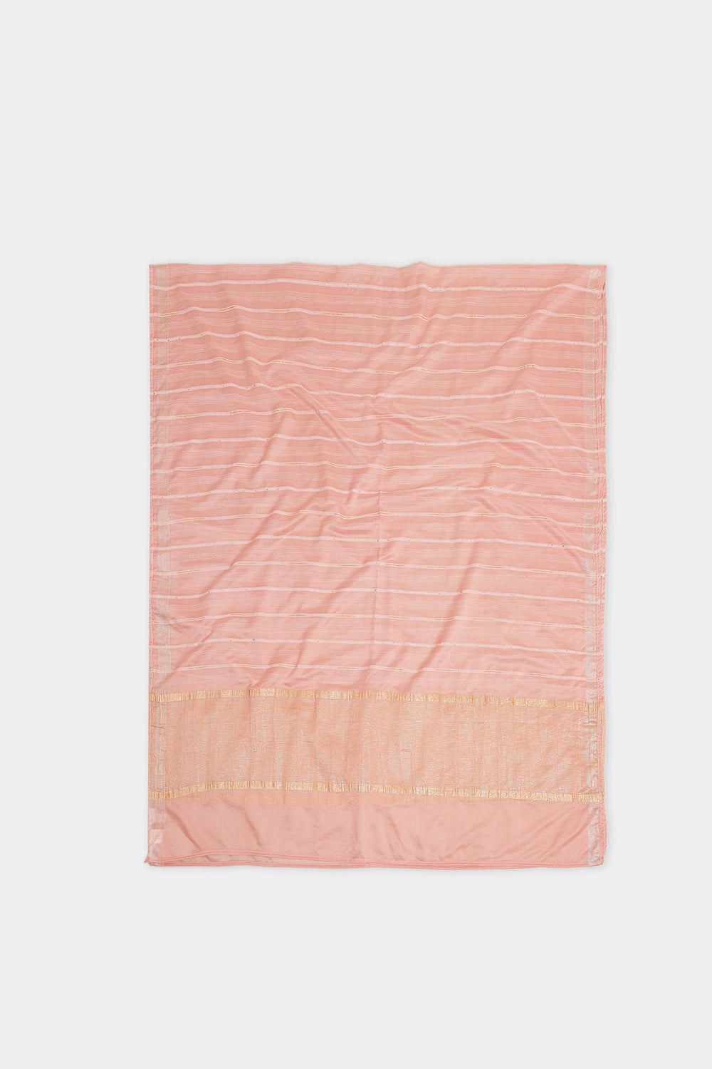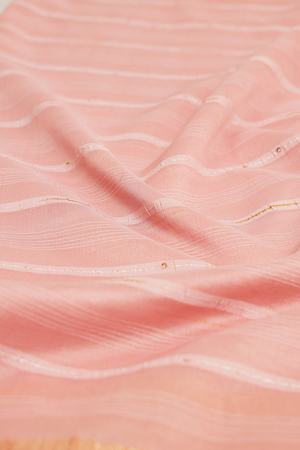 The powder pink dupatta is soft and slightly sheer with a subtle sheen. It features horizontal textured or embroidered lines across the surface and a broad translucent stripe bordered with fine detailing, adding a delicate and elegant touch to the overall design.