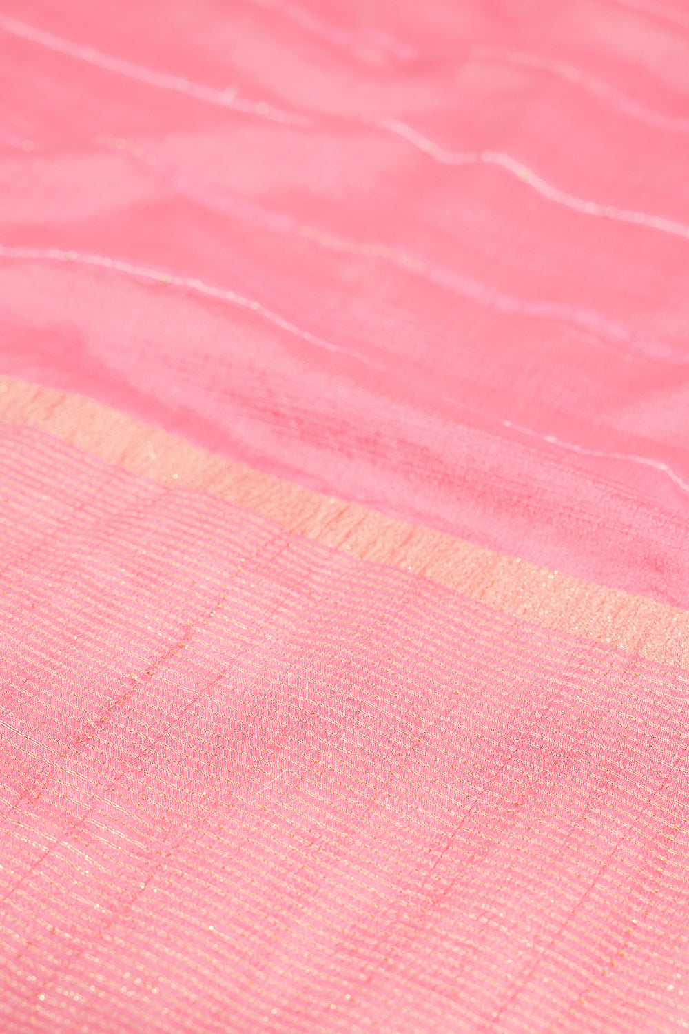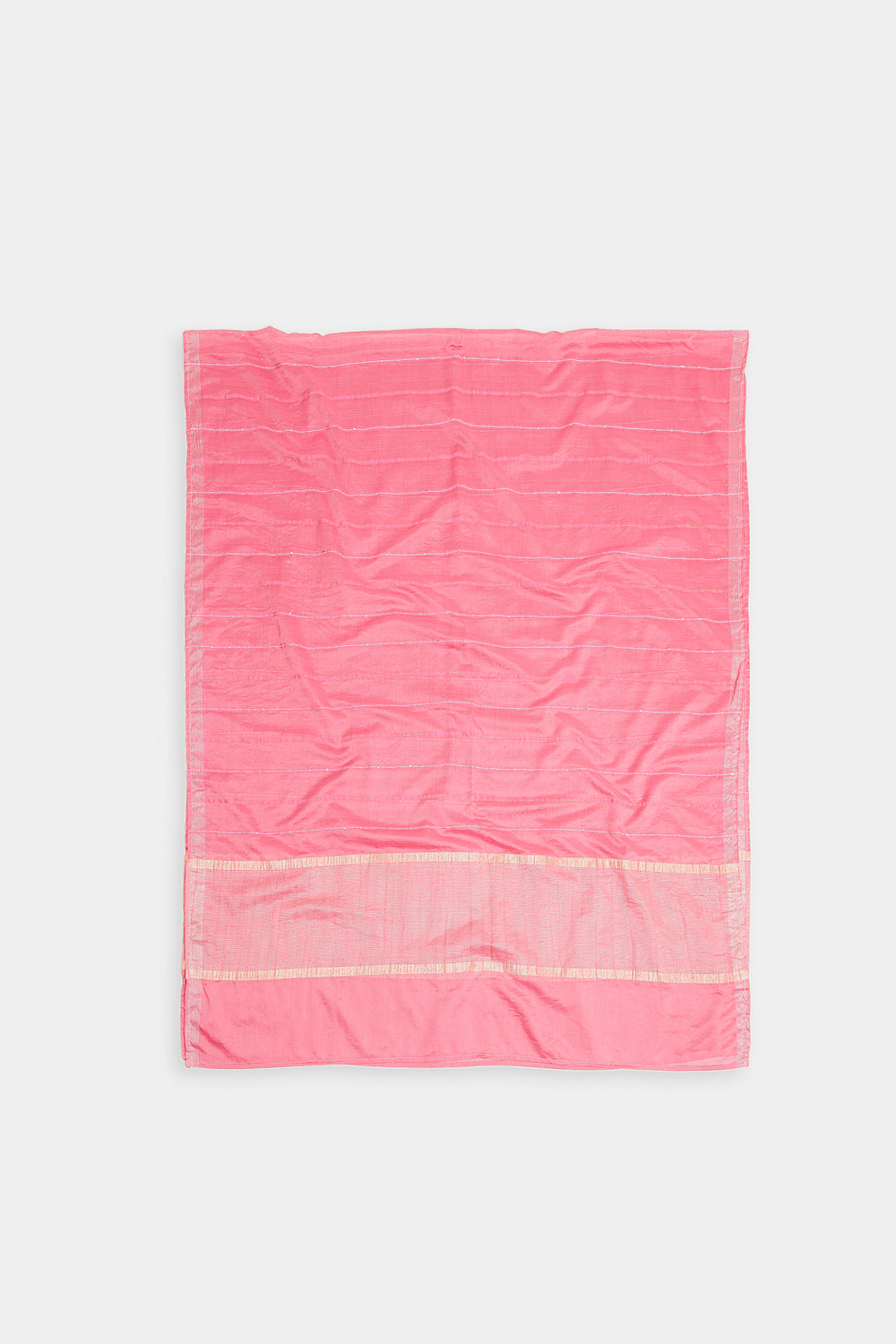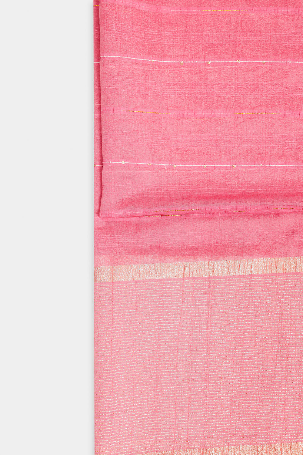 The orchid color dupatta is soft and slightly sheer with a subtle sheen. It features horizontal textured or embroidered lines across the surface and a broad translucent stripe bordered with fine detailing, adding a delicate and elegant touch to the overall design.
