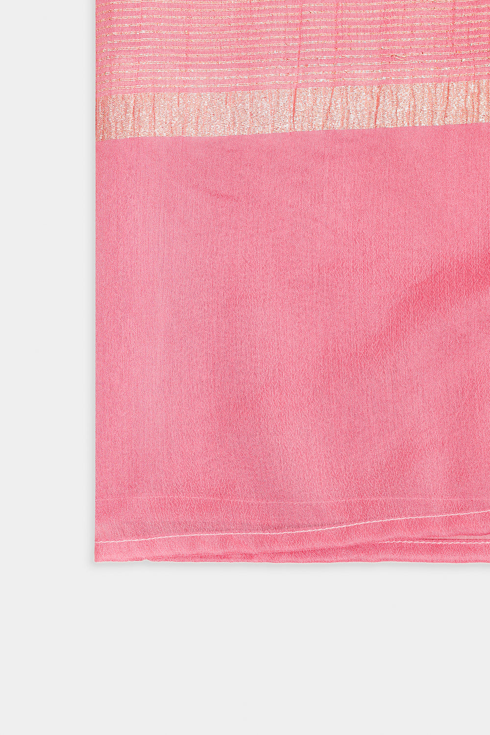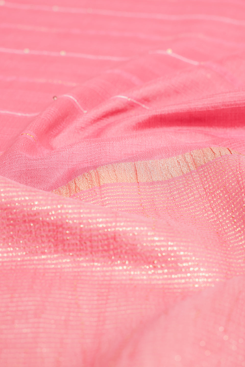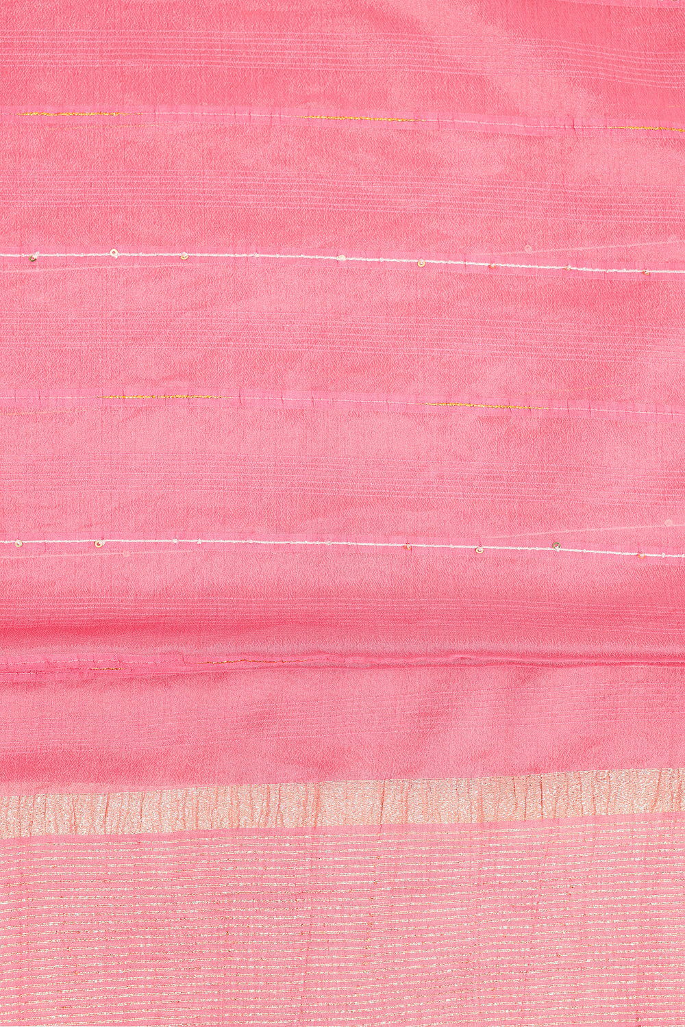 The orchid color dupatta is soft and slightly sheer with a subtle sheen. It features horizontal textured or embroidered lines across the surface and a broad translucent stripe bordered with fine detailing, adding a delicate and elegant touch to the overall design.