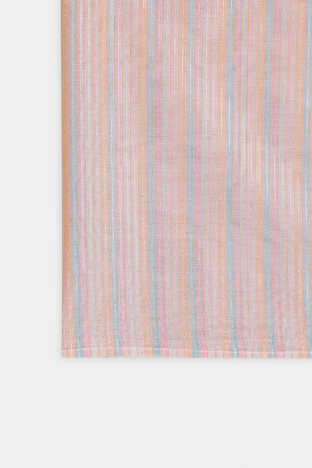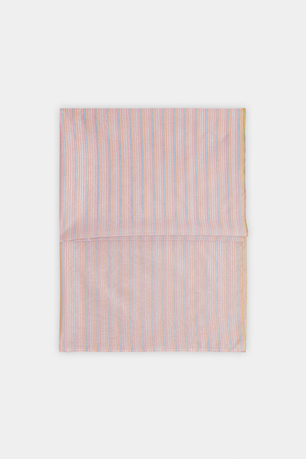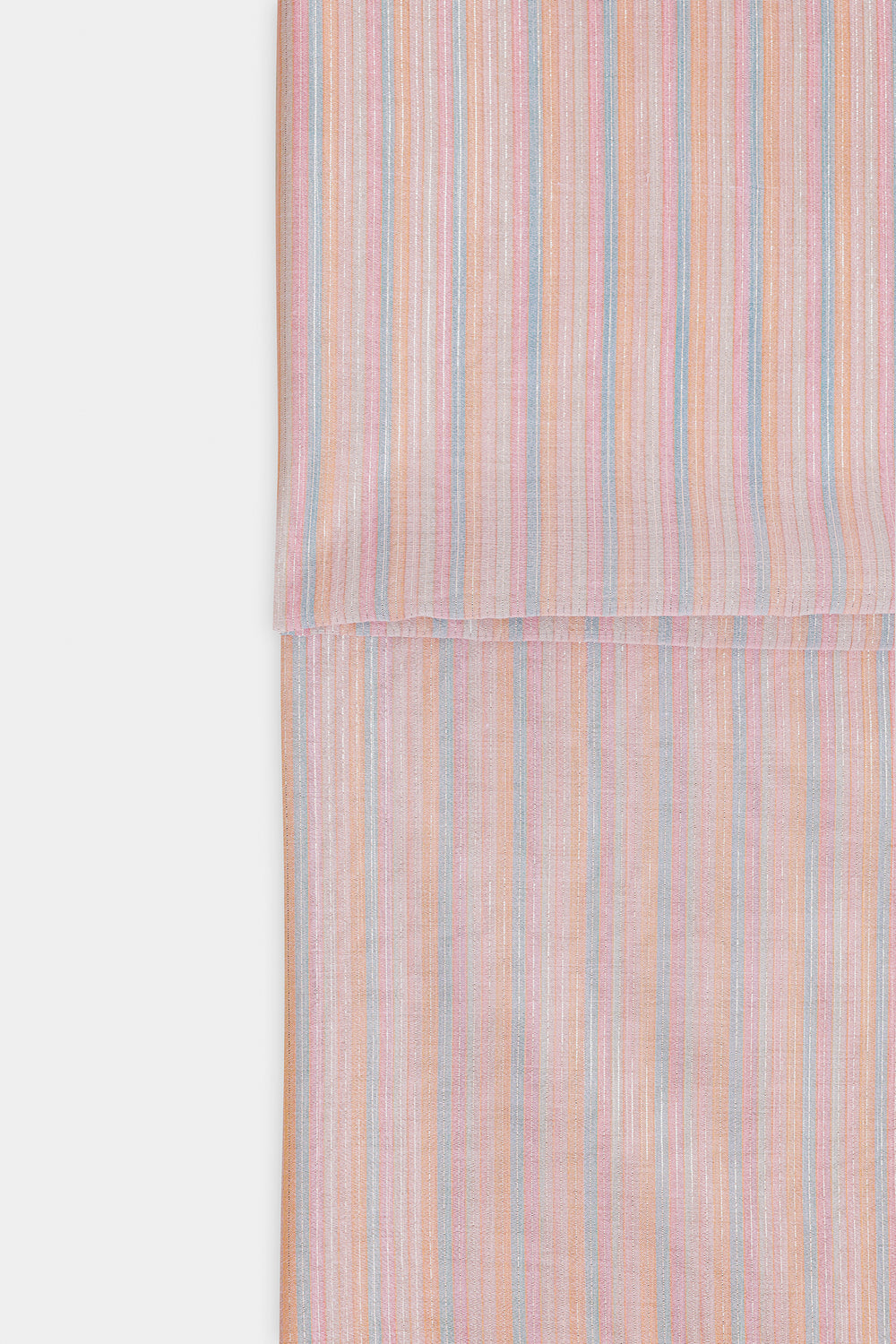 Soft textured dupatta with a pastel color palette has vertical stripes in shades of peach, pink, light blue, and beige, creating a subtle, airy appearance. The weave appears slightly loose, giving it a light and breathable quality — suitable for summer or casual wear.