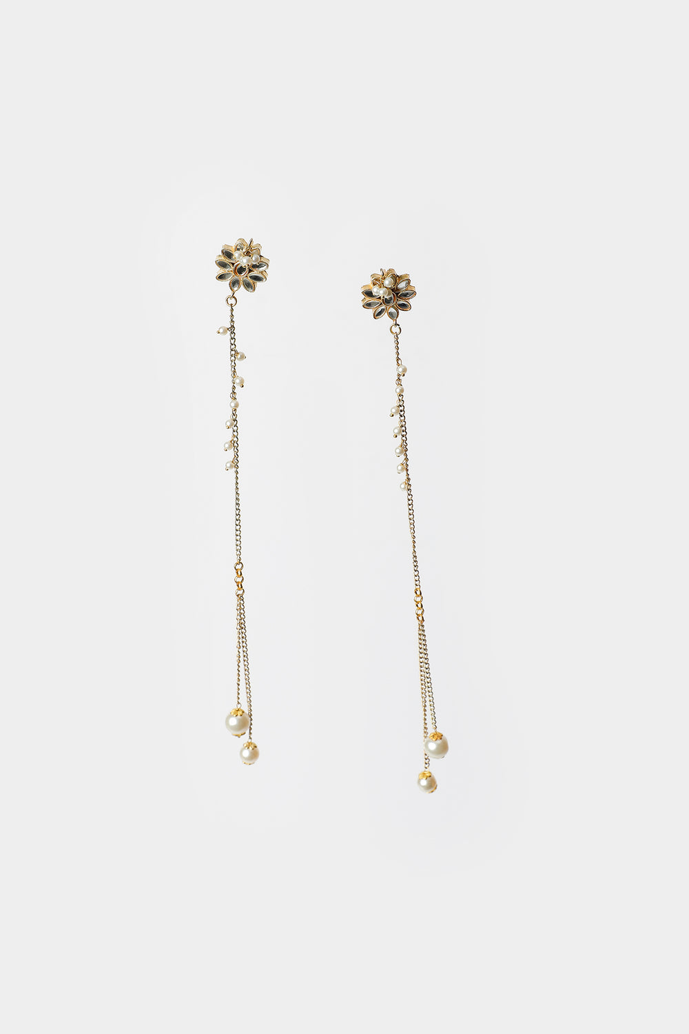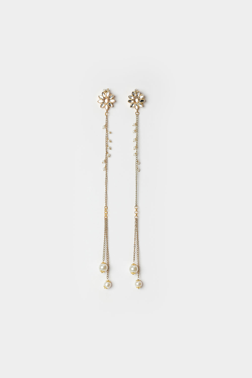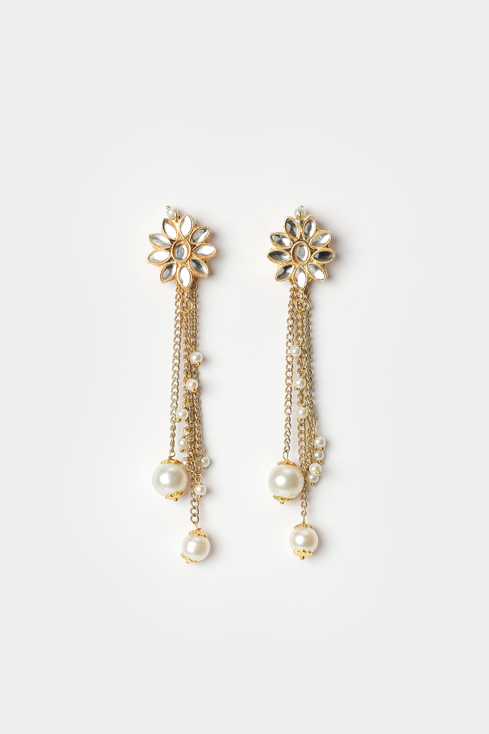 A classically elegant design is portrayed on these exquisite earrings illustrating a contemporary design with strings and stones pearls in gold accents. Adorned with floral designs studded with dazzling stones, style these gorgeous earrings with sophisticated outfits.