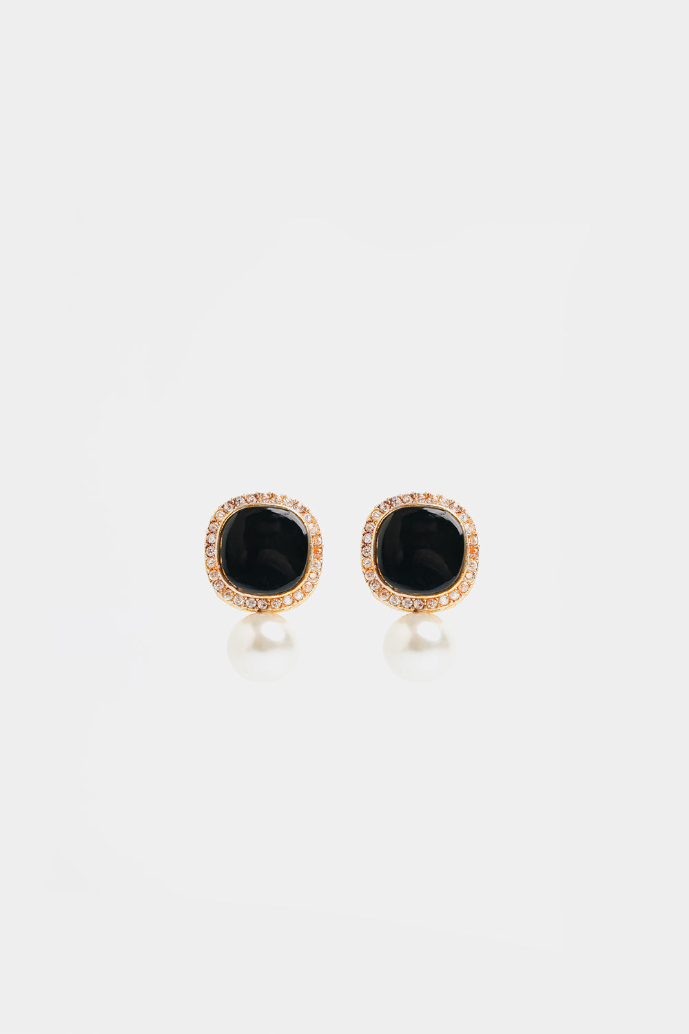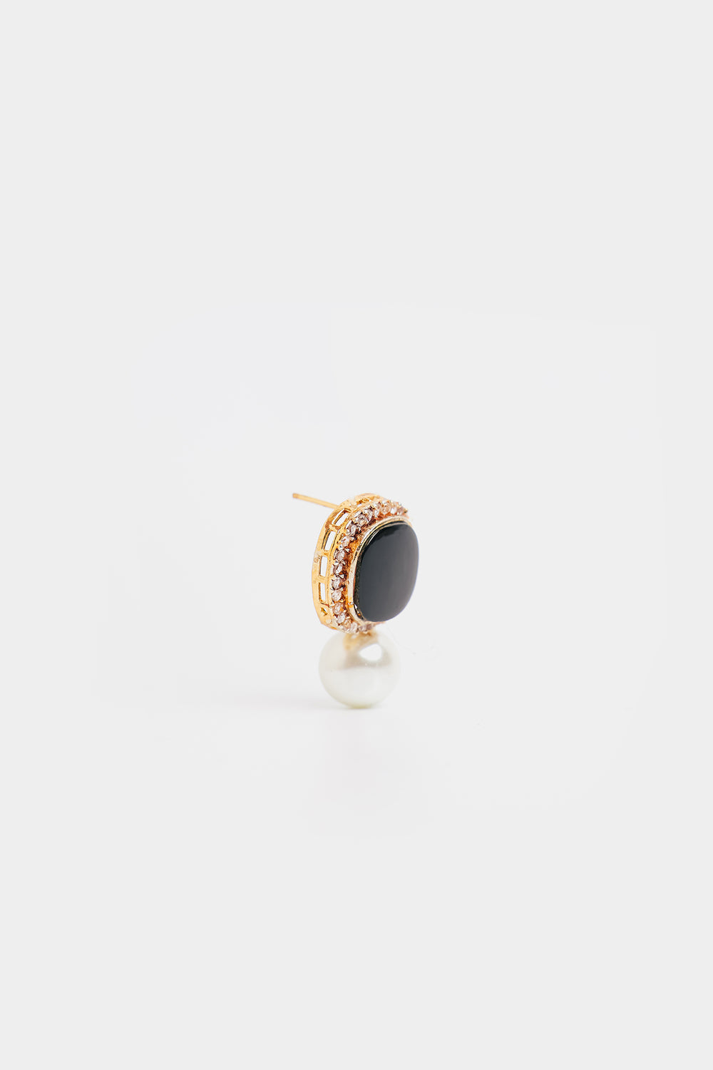 Expertly crafted for sophisticated style, these earrings feature a square-shaped stud with a sleek black stone and delicate dangles showcasing a luminous white pearl. Elevate any outfit with these elegant and timeless earrings.