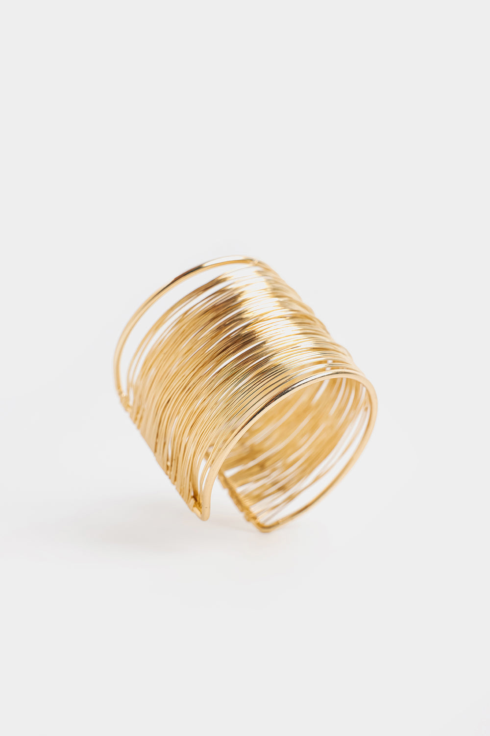 Make a captivating statement with this stunning gold-toned cuff bracelet. Crafted from multiple delicate wires, its bold yet airy design creates an eye-catching layered effect, perfect for adding modern elegance to any look.