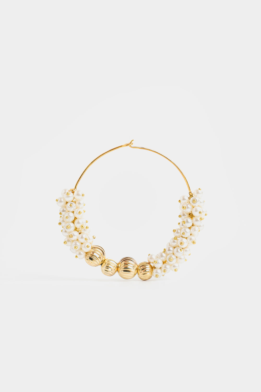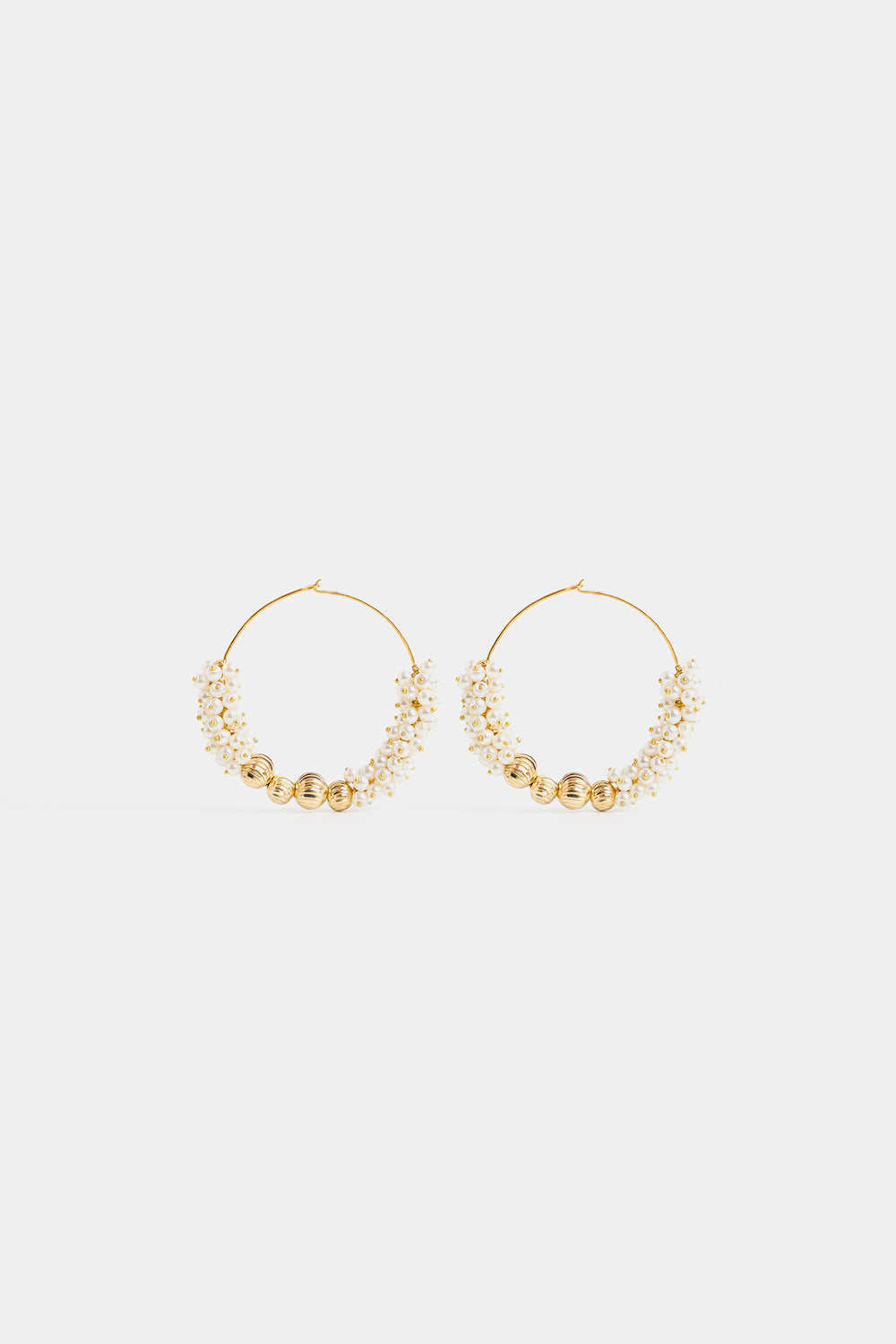 Redefining contemporary elegance, these modern hoop earrings marry minimalist design with traditional embellishment. Delicate gold-toned wire forms an airy, oversized silhouette, while the lower half features densely clustered white pearls, creating a distinctive textured effect. Three ribbed gold accent beads at the center base provide geometric contrast and visual interest. Secured with a classic hook-and-eye closure, these versatile pieces seamlessly transition from everyday wear to special occasions, offering refined sophistication with an understated aesthetic.