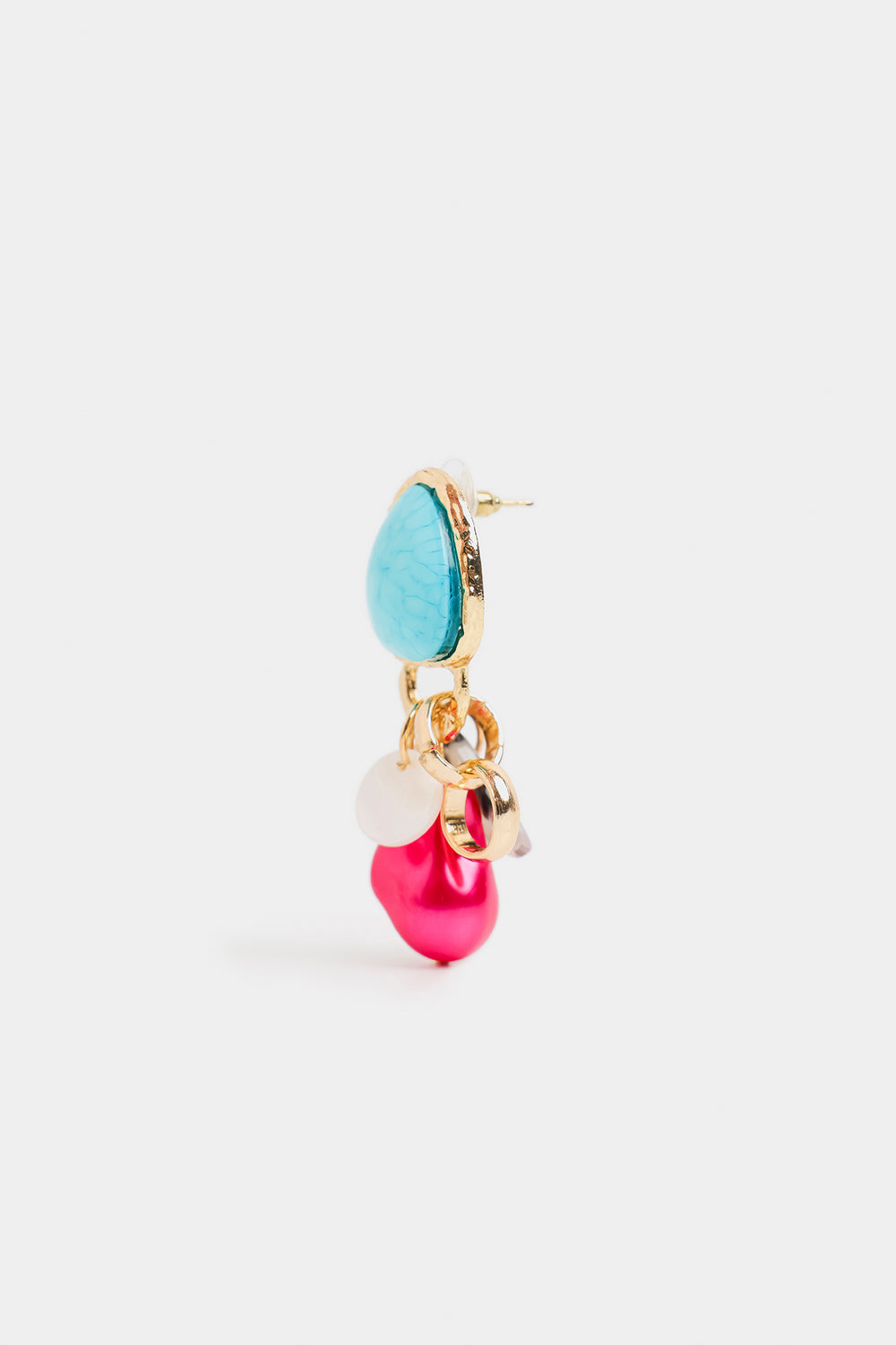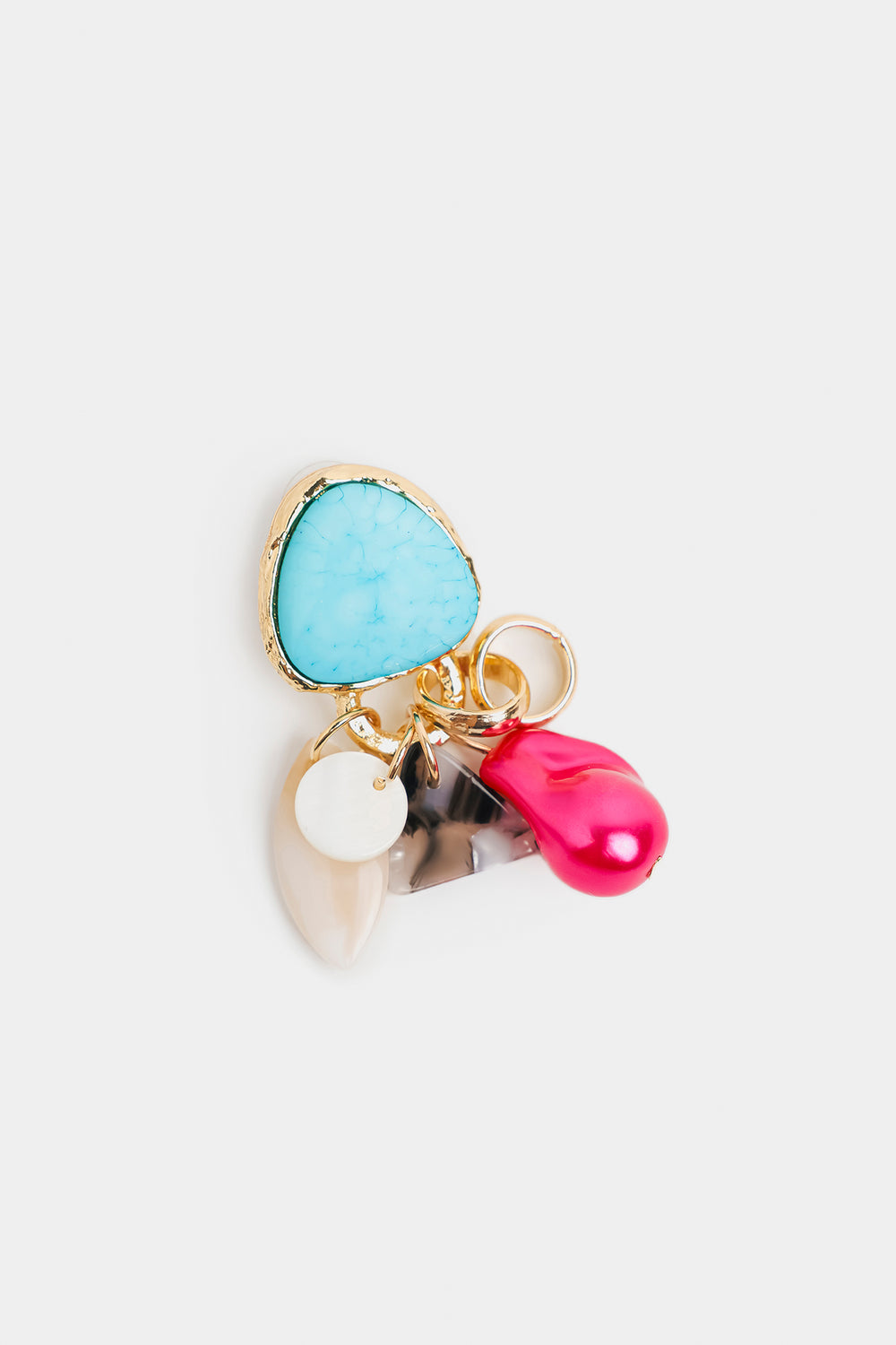These earrings feature a striking and playful design. At the top, a triangular turquoise stone with gold edging serves as the centerpiece. Hanging below are small gold rings holding a mix of charms — including a glossy red teardrop bead, a smooth white disc, and a light cream oval accent.