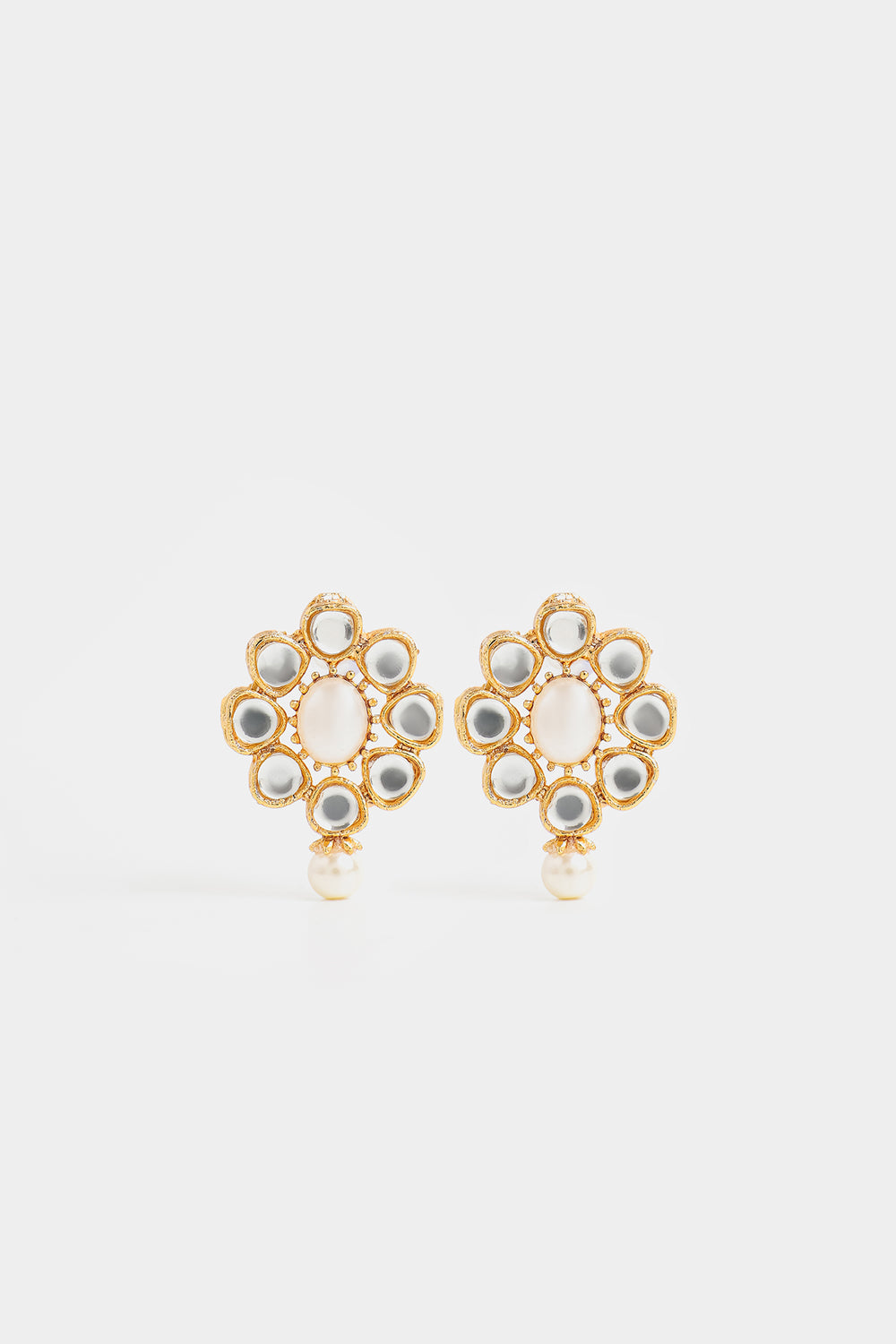 These distinguished earrings capture the essence of authentic craftsmanship. A luminous moonstone or pearl cabochon anchors the composition, surrounded by brilliant Polki stones secured with traditional gold foil backing. The textured, hand-beaten gold finish imparts an heirloom quality and antique aesthetic characteristic of masterful metalwork. A delicate pearl drop suspended below completes the silhouette with graceful movement. Rendered in warm gold-toned metal, these earrings represent the pinnacle of heritage jewelry artistry—perfect for collectors and connoisseurs seeking pieces with authentic provenance and timeless allure.