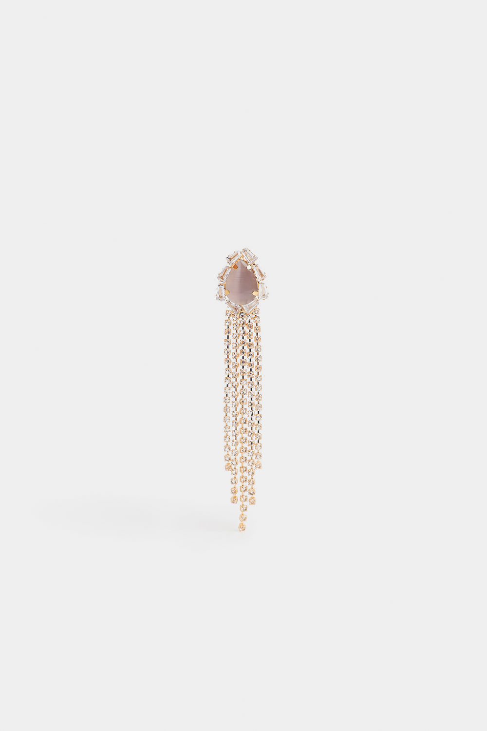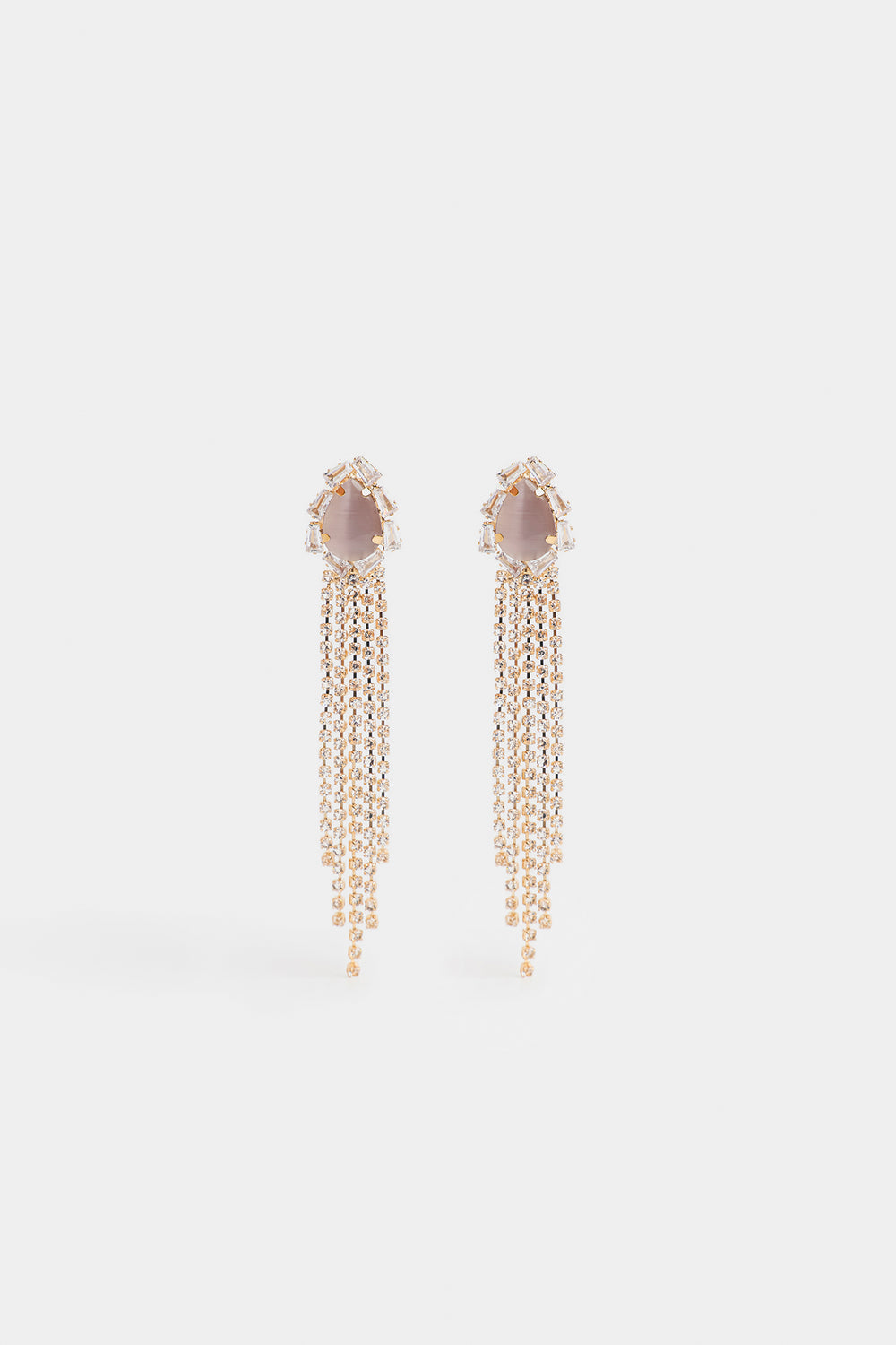 These earrings feature a drop-shaped stud design complemented by long chains adorned with zirconia stones. The combination of elegant shapes and sparkling details creates a refined piece that elevates any sophisticated outfit.