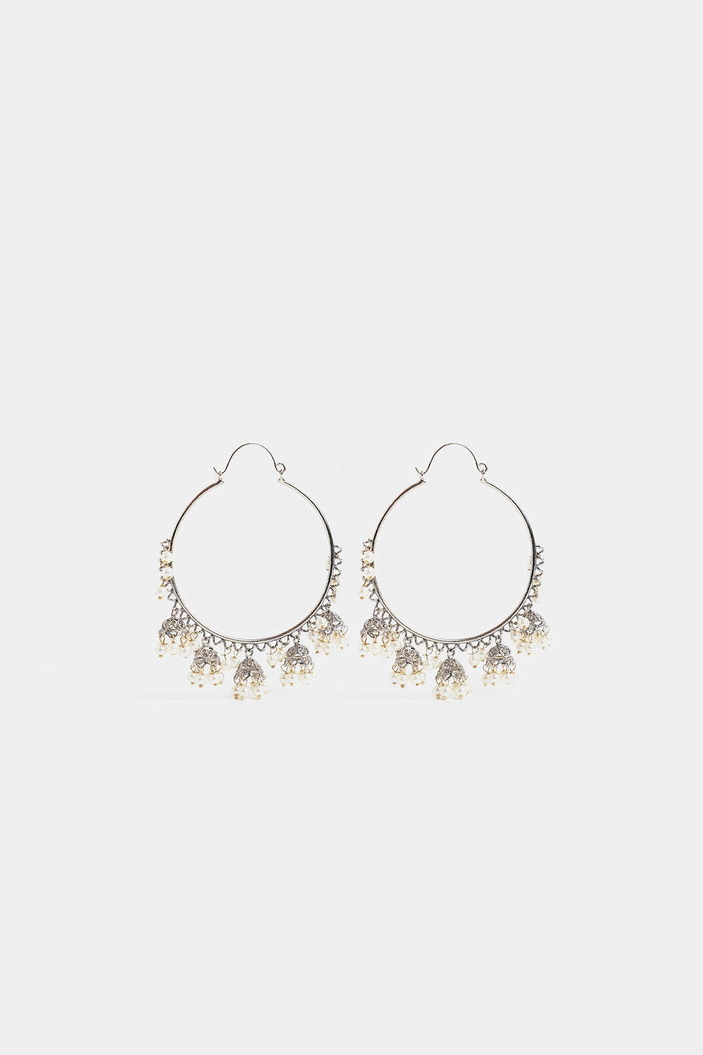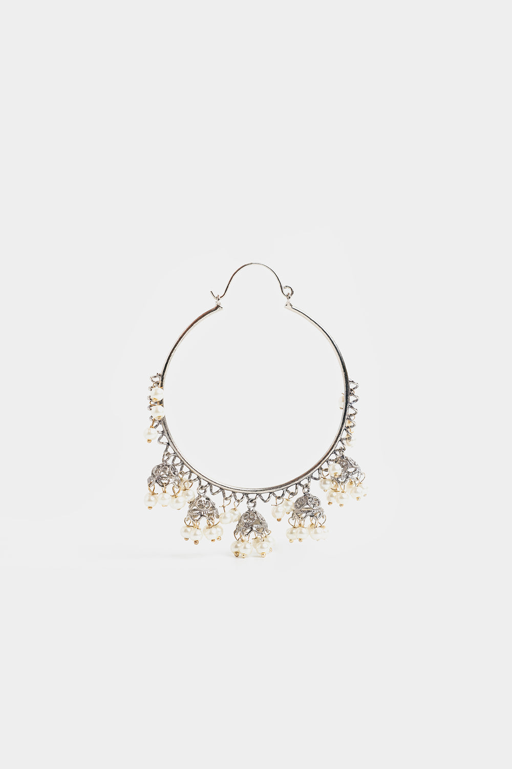 These enchanting jhumka hoops epitomize bohemian sophistication with their distinctive design. A substantial silver-toned circular hoop features an oxidized, antique finish that evokes timeless design. Delicate silver bells dangle gracefully from the lower arc, each adorned with luminous pearl droplets that catch light with every movement. The latch-back closure ensures a secure and comfortable fit throughout the day. Perfect for those drawn to ethnic aesthetics and boho-chic sensibilities, these earrings deliver authentic artisanal appeal with refined elegance.