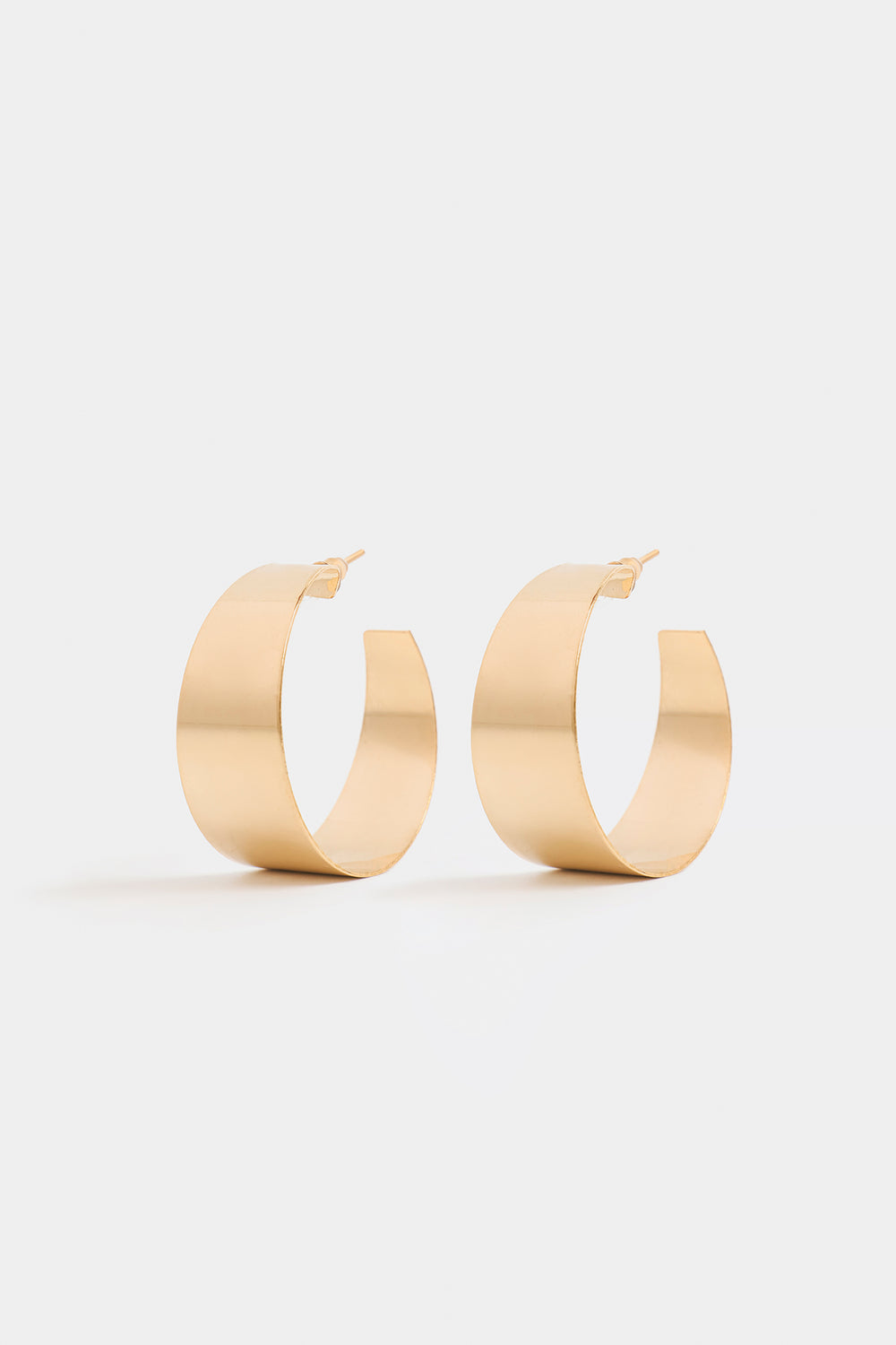 Elevate your style with these fiercely chic gold-toned wide hoop earrings. Featuring a bold, cuff-like width and a highly polished, radiant finish, these earrings offer a sleek, modern take on the classic hoop. Their clean, uninterrupted surface and medium size create a commanding yet sophisticated statement, making them an effortless accessory for an instantly glamorous look.