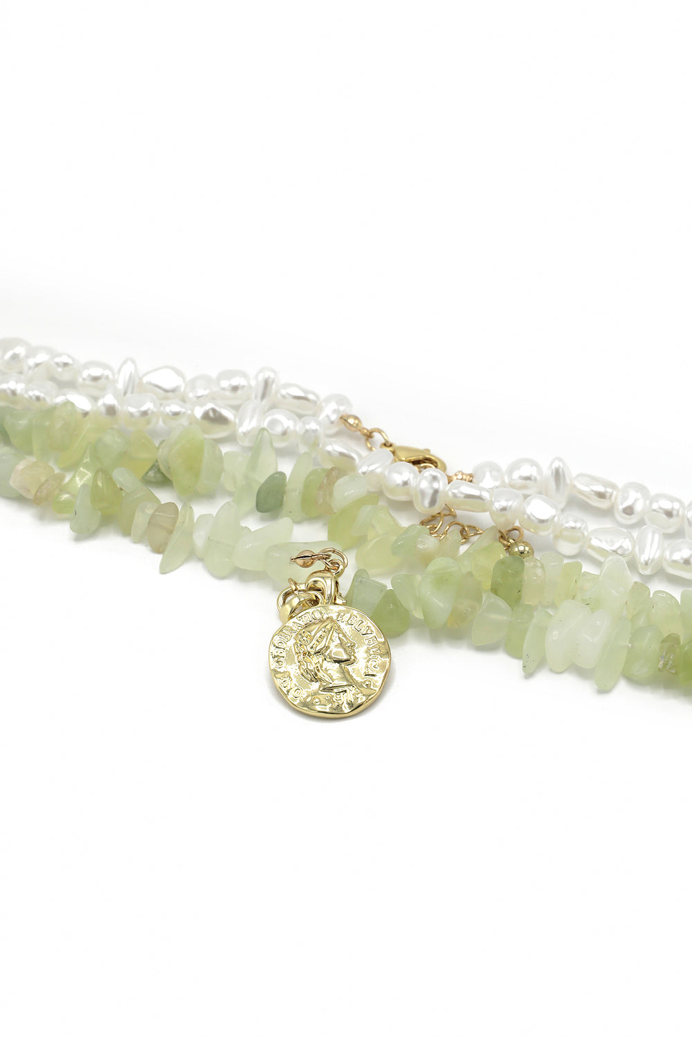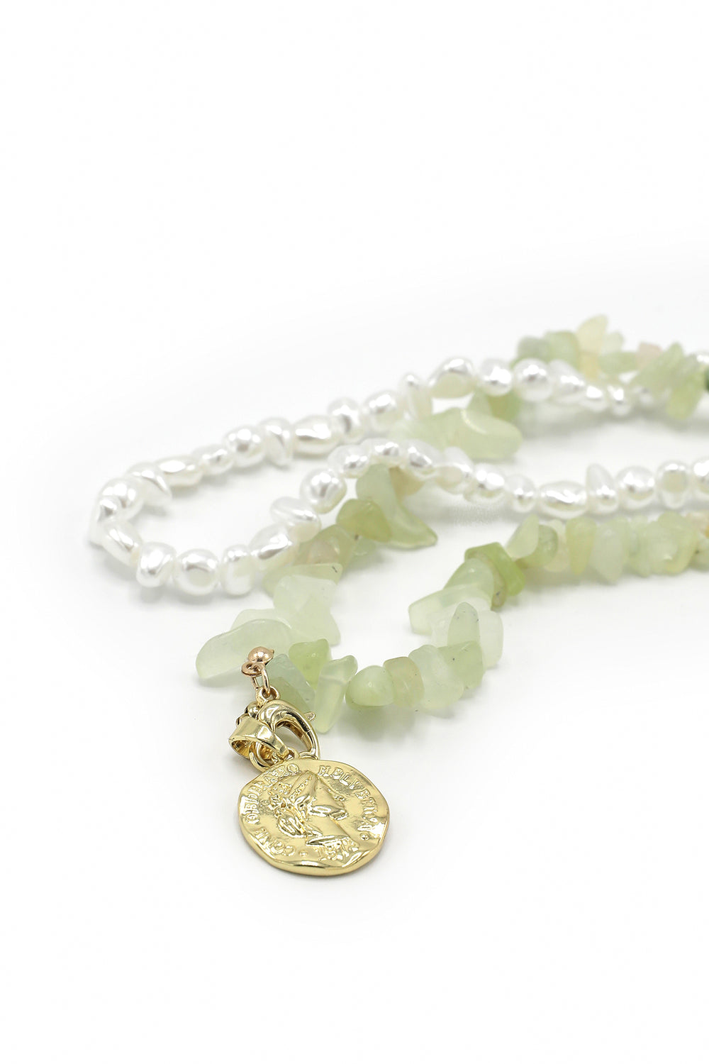 Be the epitome of grace this happening season with this elegant necklace made from dull green stones and beads in silver accents. Adorned with a dazzling coin pendant, this exquisite necklace is a great option to style with sophisticated outfits this season.